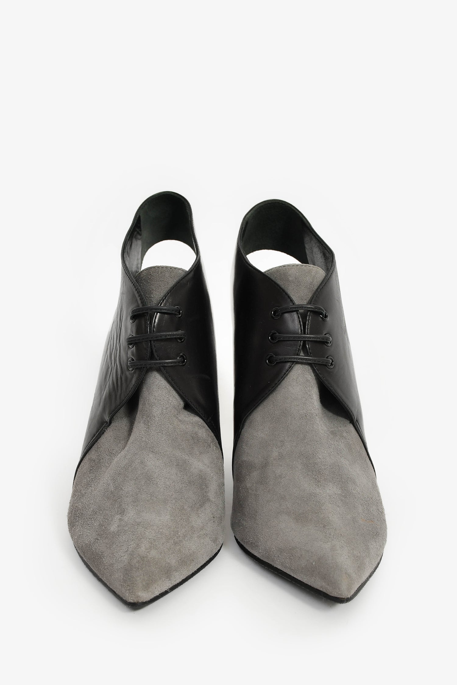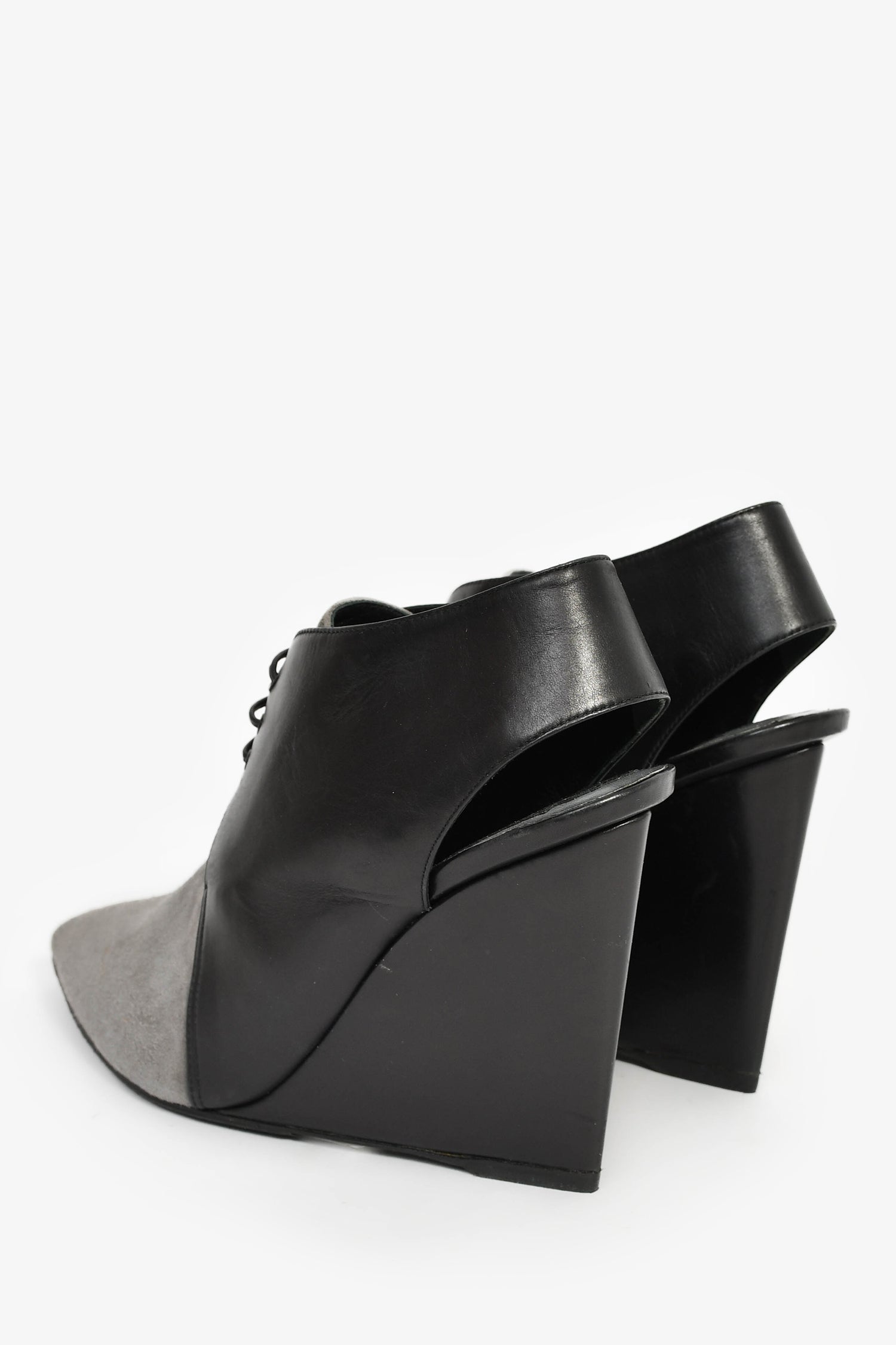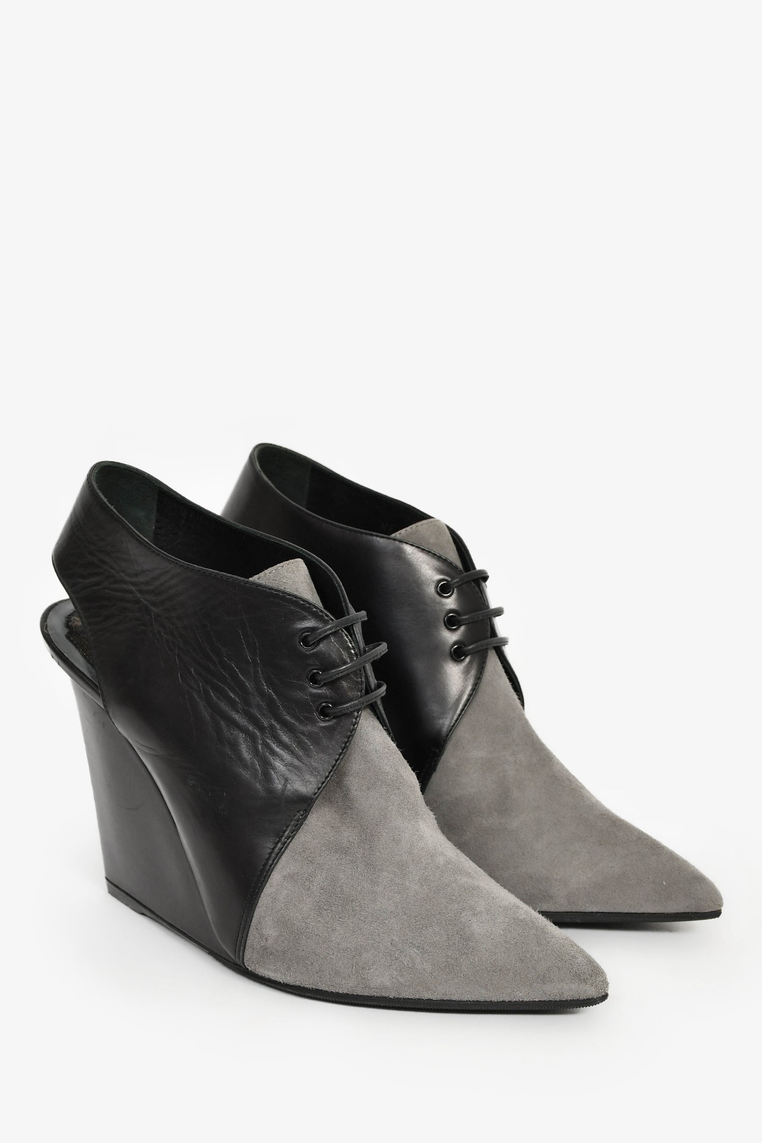 Christian Dior Black Leather/Grey Suede Tie Wedges. Slip-on. Pointed toe. Wedge heel. Leather interior. Tonal stitching.