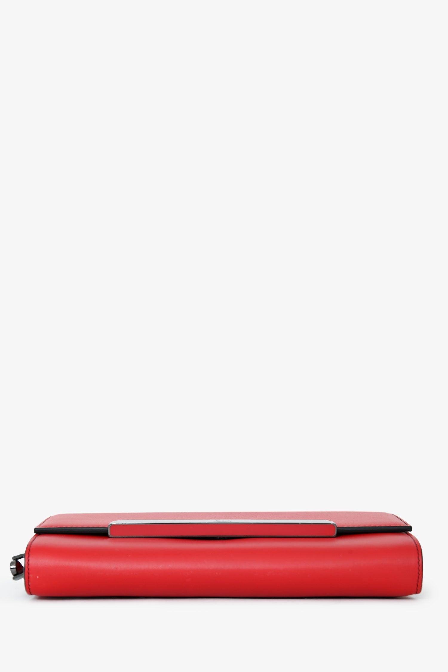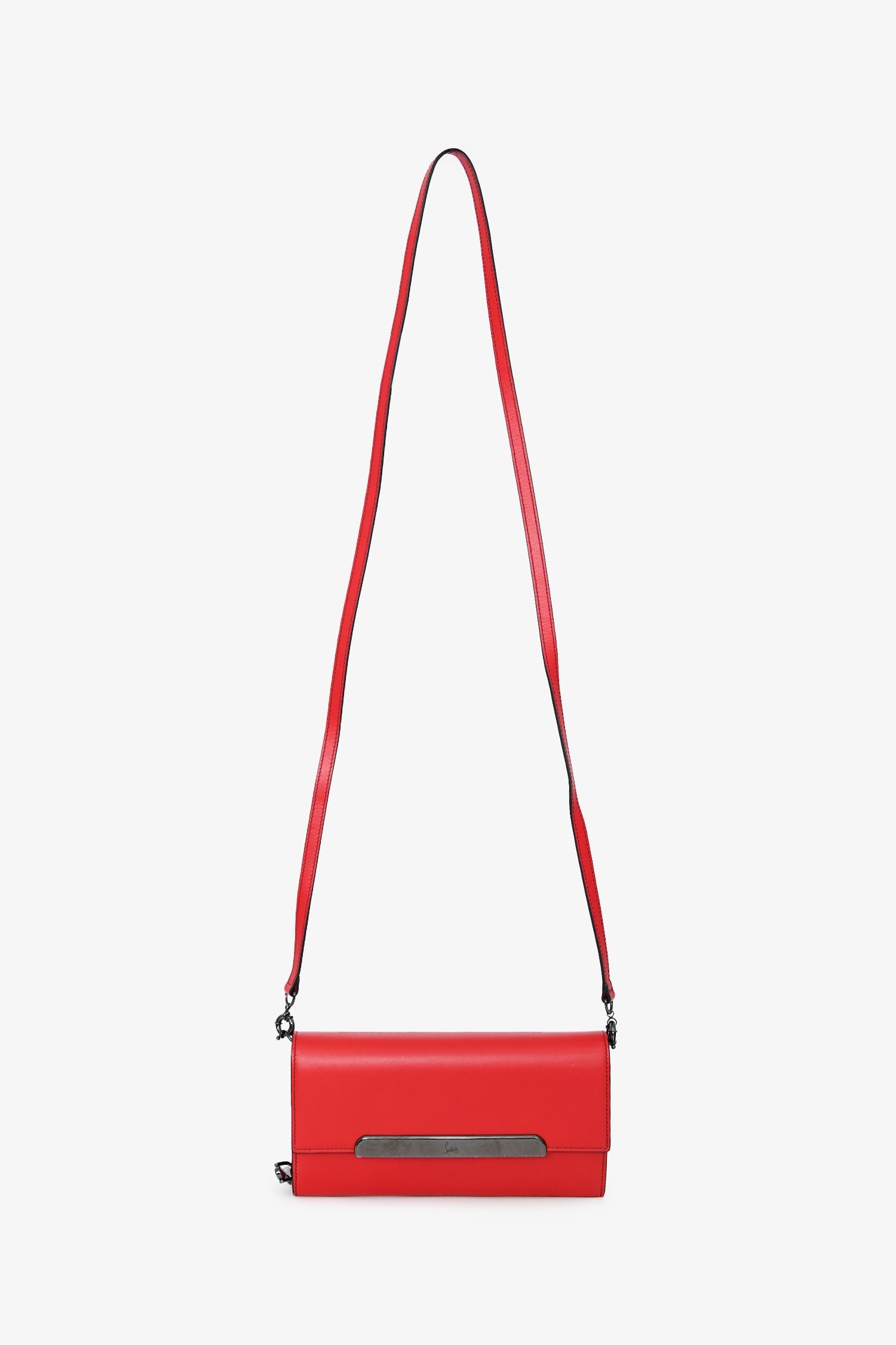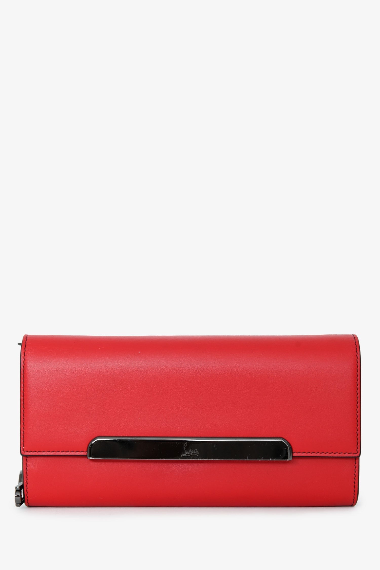 Christian Louboutin Red Leather Rougissime Wallet on Chain. Front fold-over flap with magnetic button closure. Single exterior rear slip pocket. 16 card slots. 2 interior compartments; 1 slip, 1 with zip closure. Silver-tone hardware. Tonal stitching.