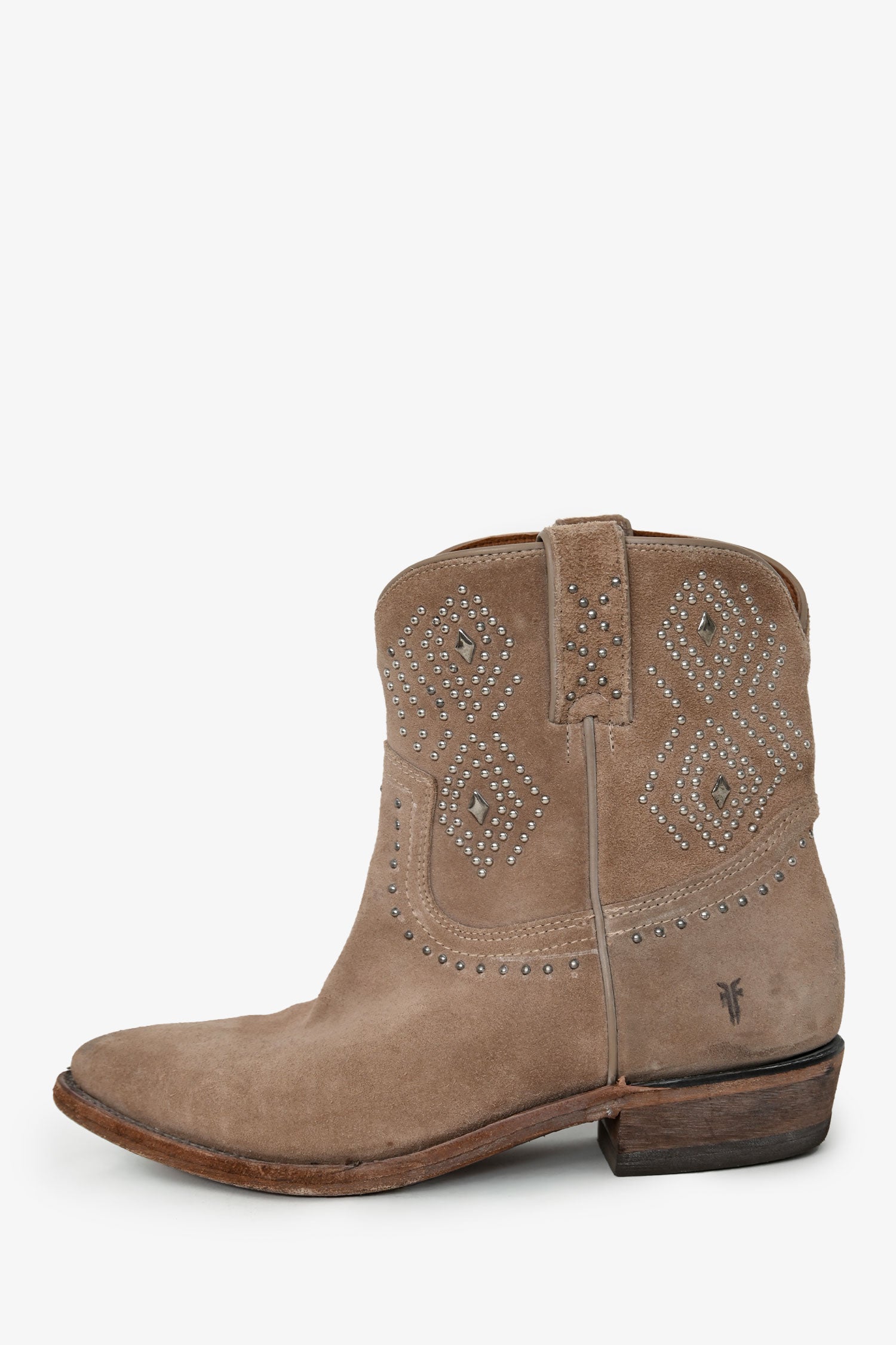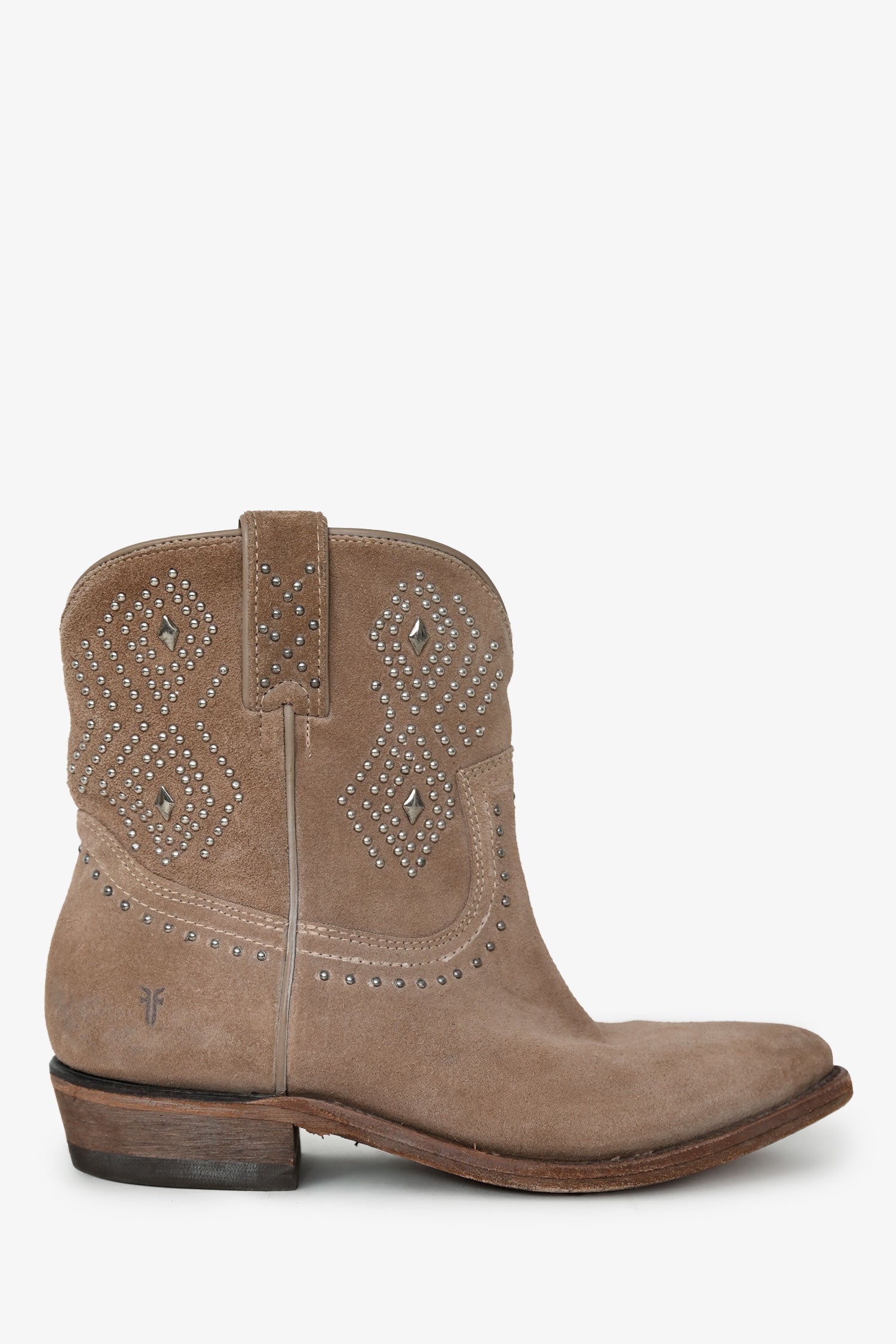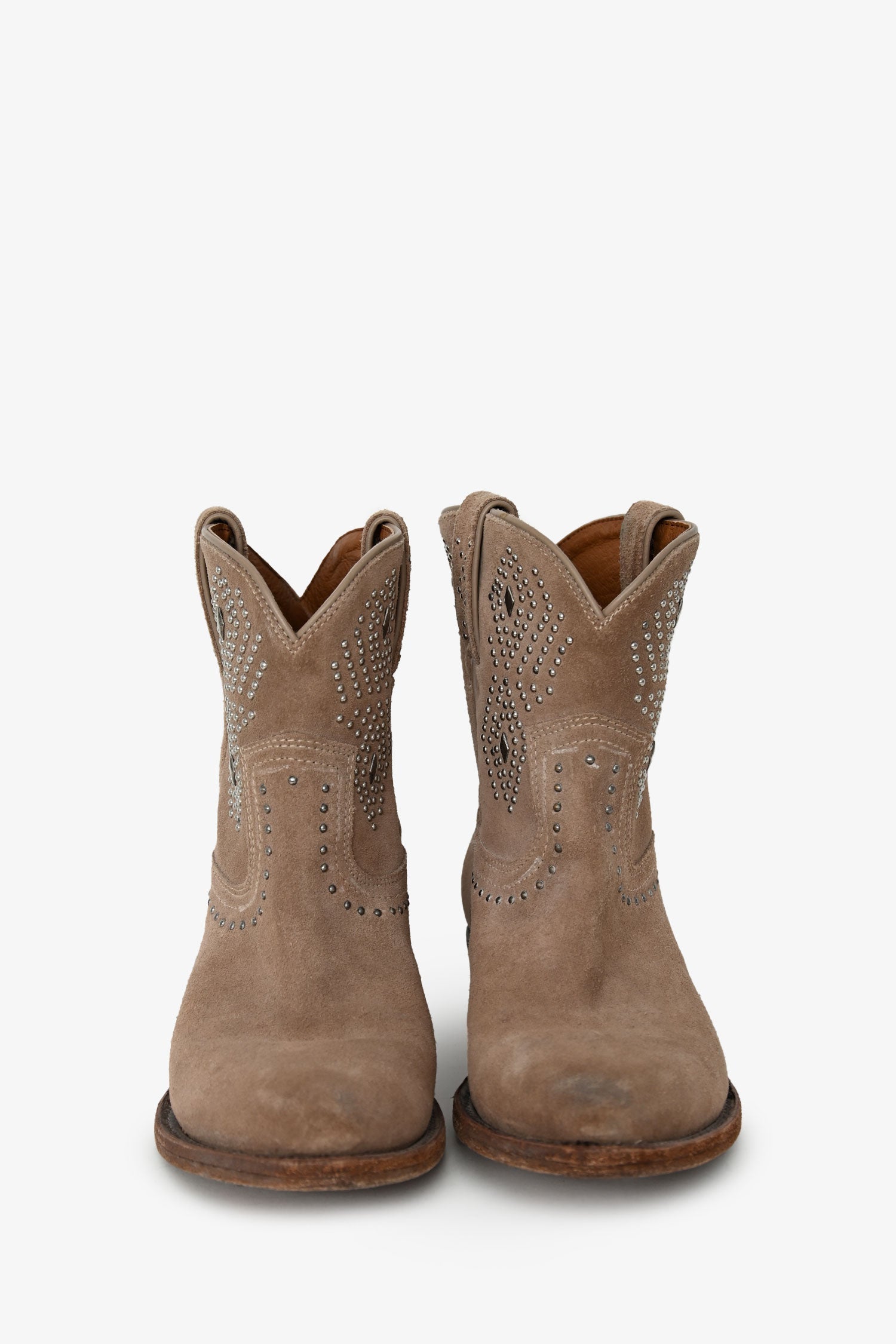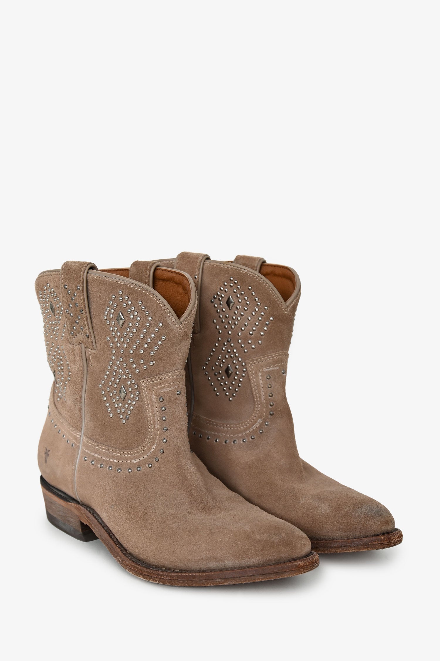 Frye Beige Leather Studded Mid-Calf Western Boots. Pointed toe. Silver-tone hardware. Tonal stitching.