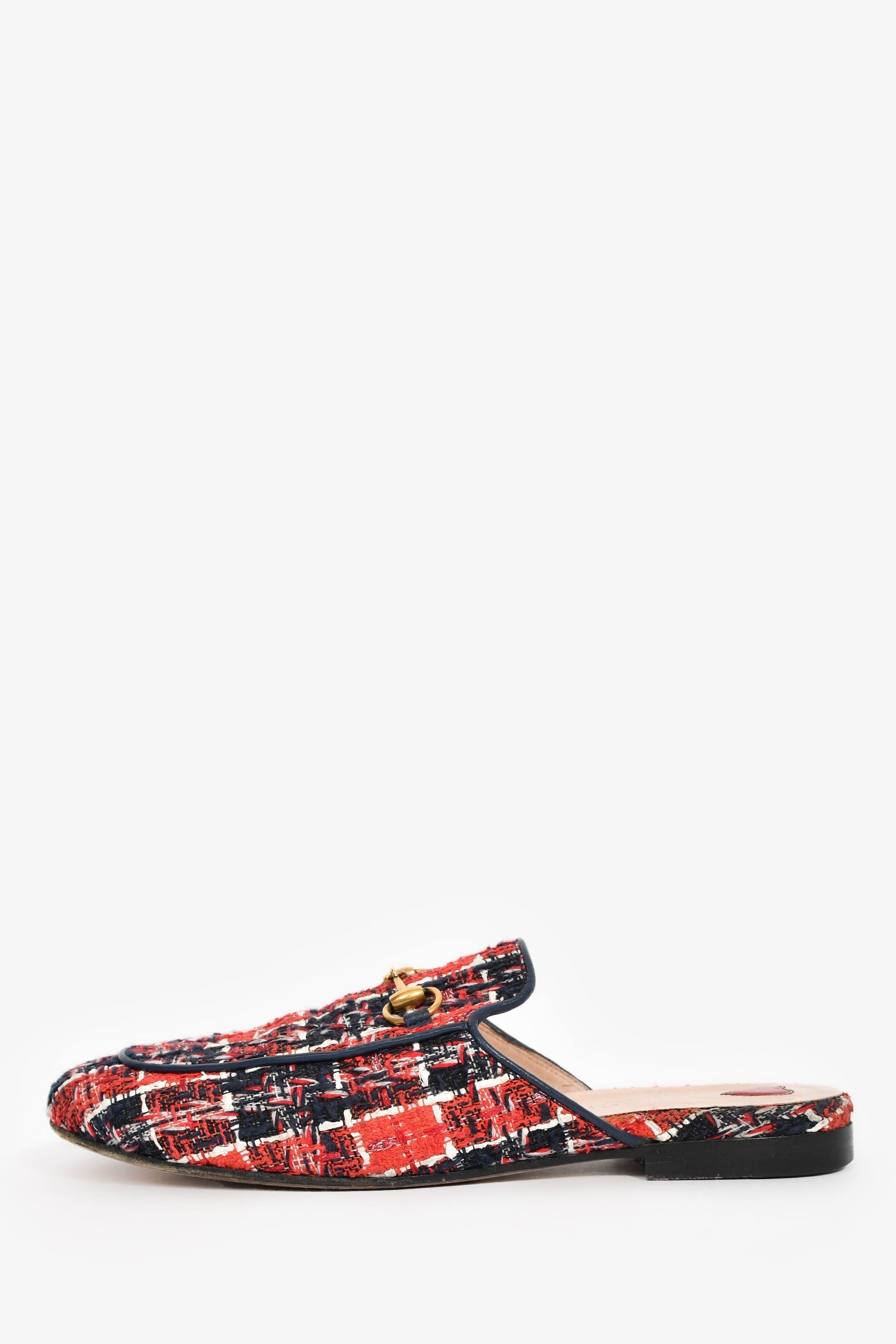 Gucci Blue/Red Tweed Horsebit Loafers. Slip-on. Almond-toe. Gold-tone hardware. Tonal stitching.