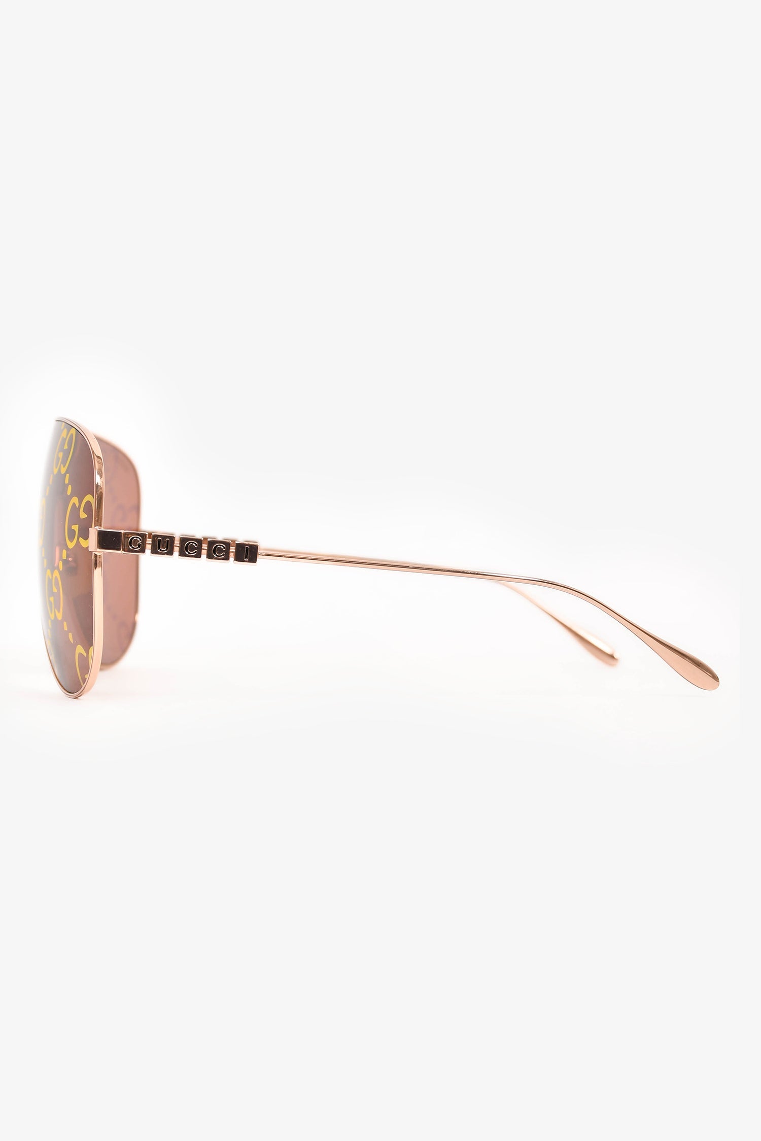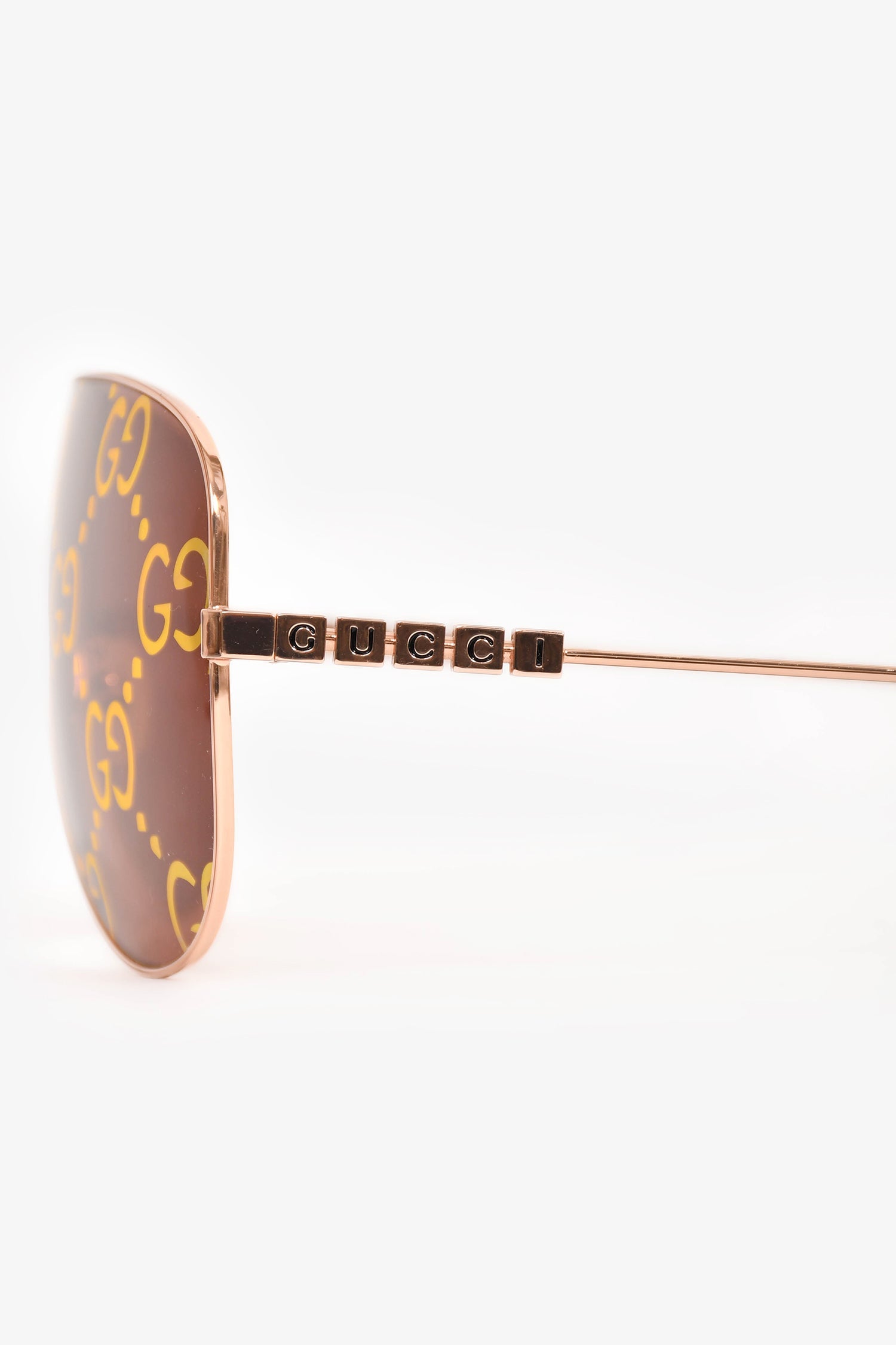 Gucci Rose Gold Monogram Tint Aviator Sunglasses. Mirrored lens. Adjustable nose pads. Rose gold-tone hardware.