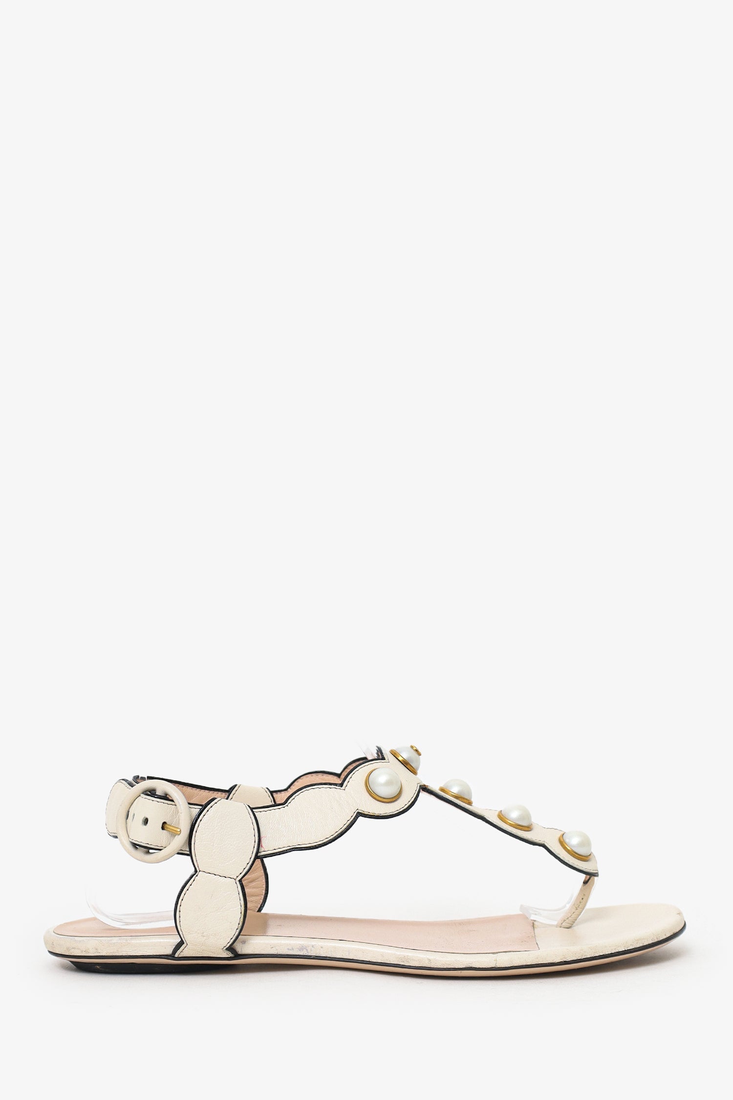 Gucci White Leather Pearl Detail Sandals. Slip-on. Round-toe. Adjustable pull-through rear buckle closure. Gold-tone hardware. Tonal stitching.