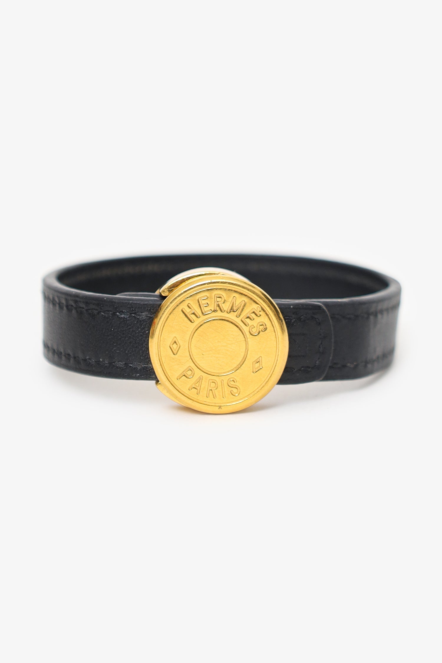 Hermès Black Leather Looping Bracelet. Front turn-lock closure. Gold-tone hardware. Tonal stitching.