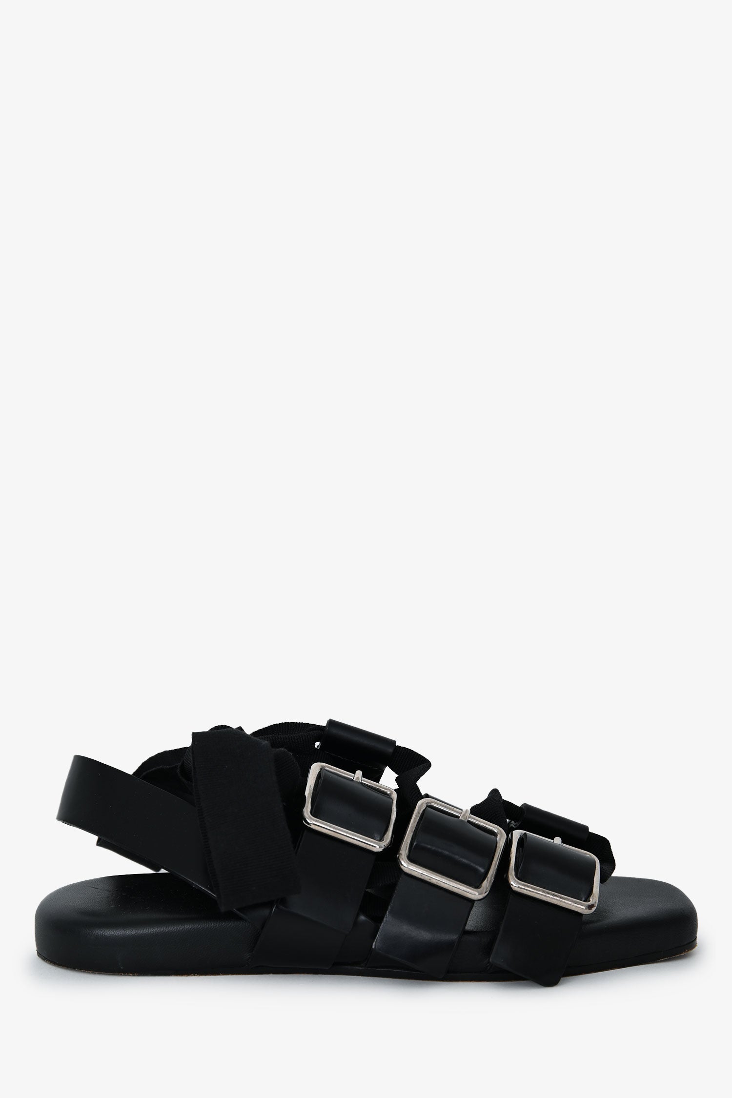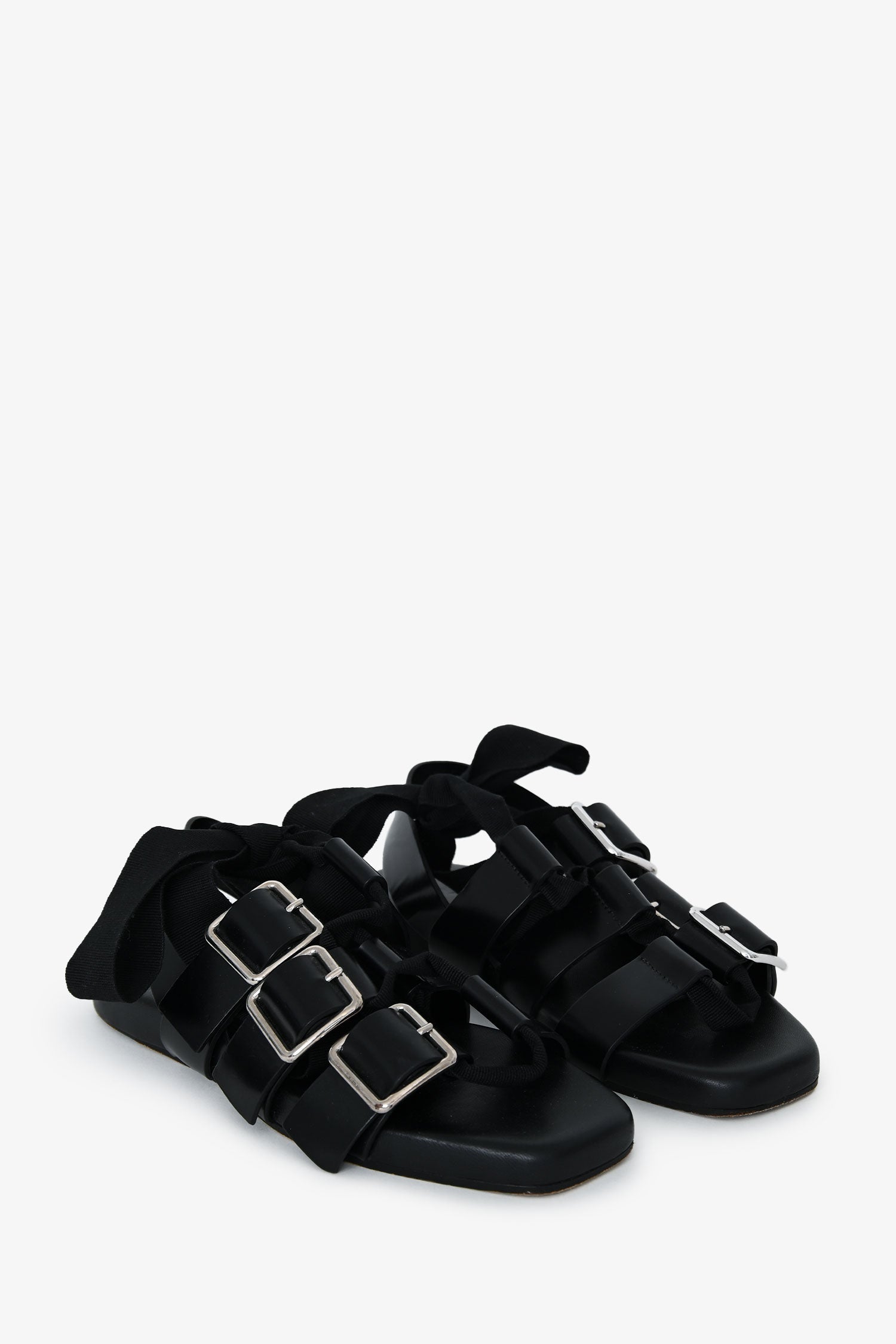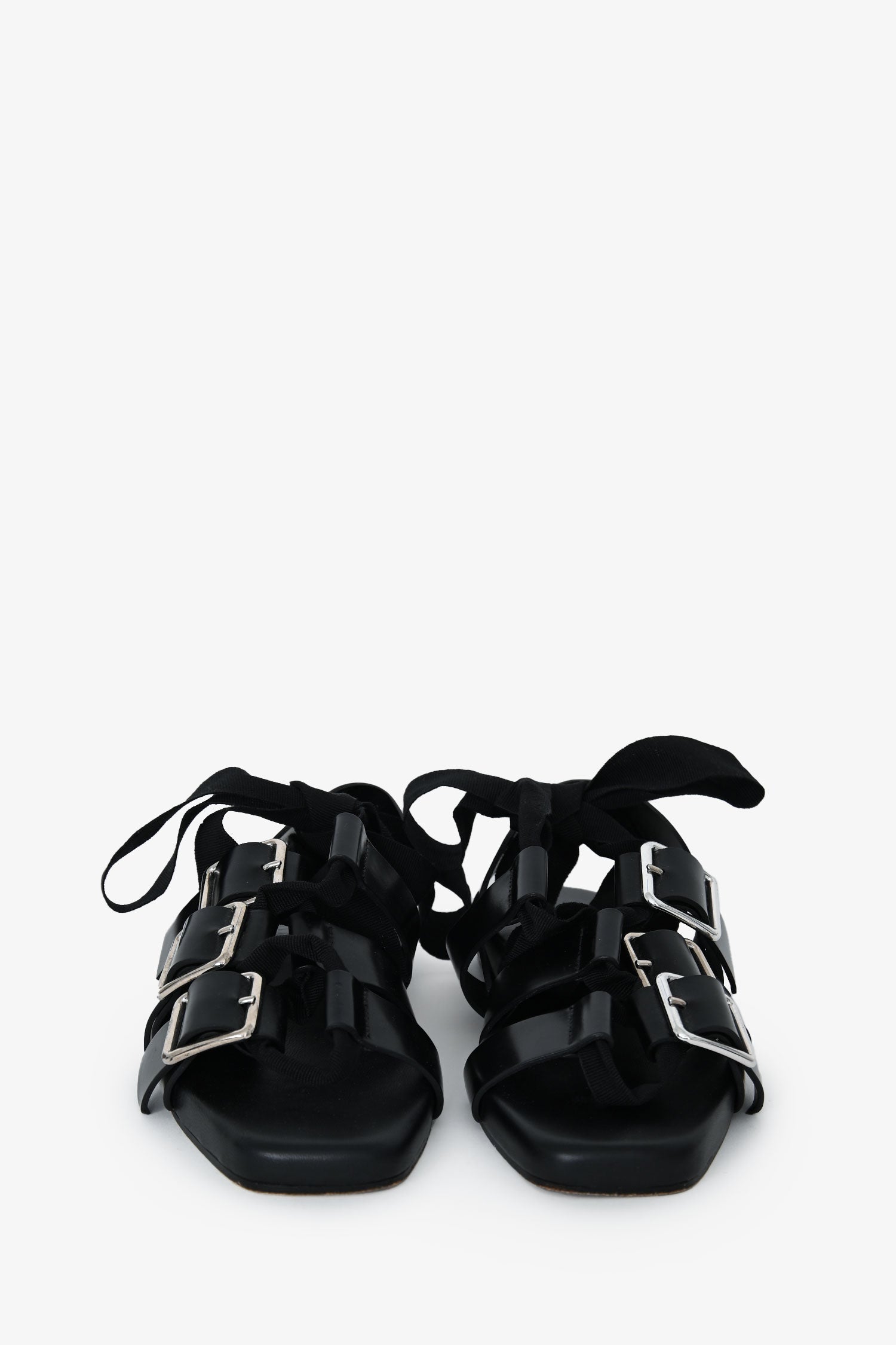 Jill Sander Black Leather Gladiator Buckle Sandals With Ribbon. Square toe. Leather insoles. Silver-tone hardware. Tonal stitching.