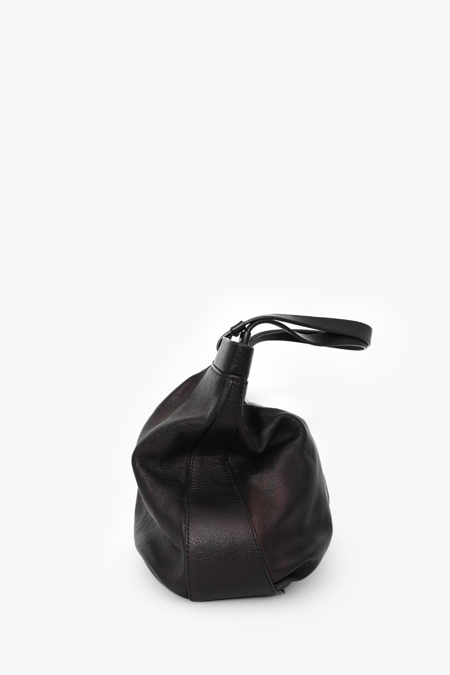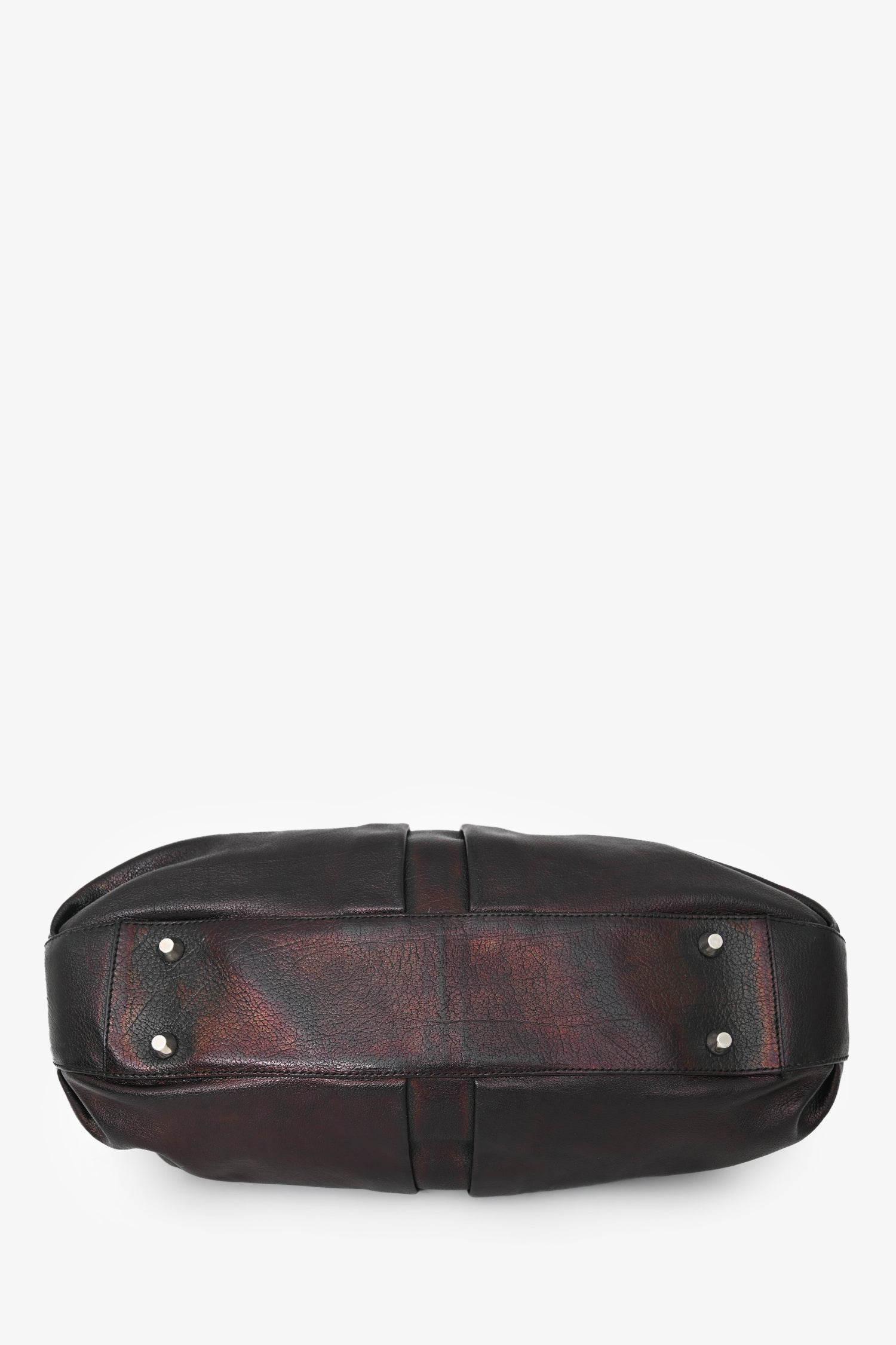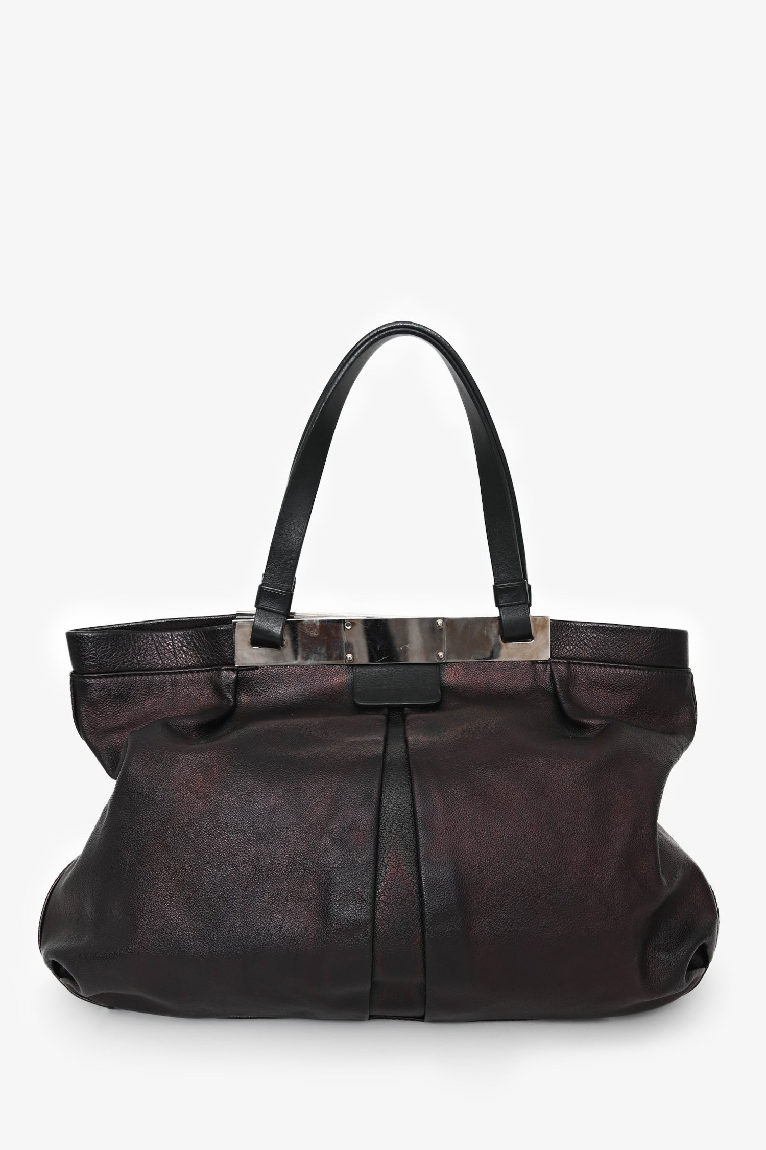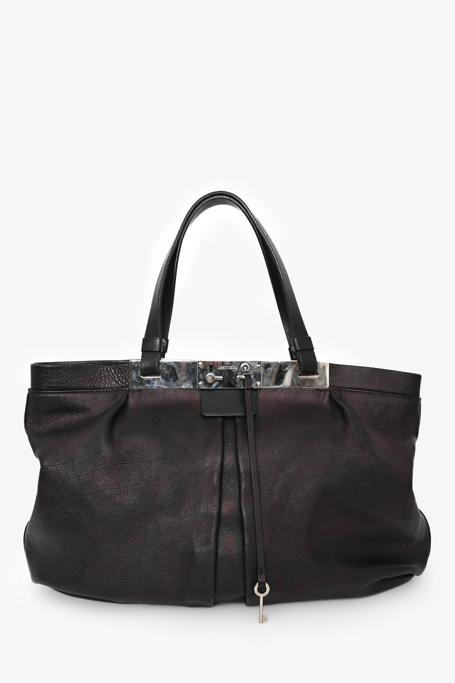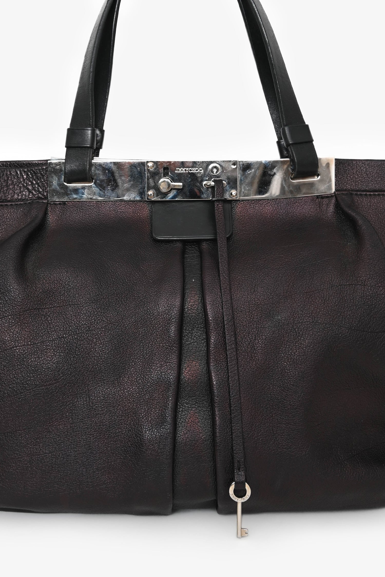 Jimmy Choo Brown/Black Metallic Leather Bag. Top turn-lock closure. Dual handles. Protective base studs. Lined interior. 3 interior wall pockets; 2 slip, 1 with zip closure. Detachable single key. Silver-tone hardware. Tonal stitching.