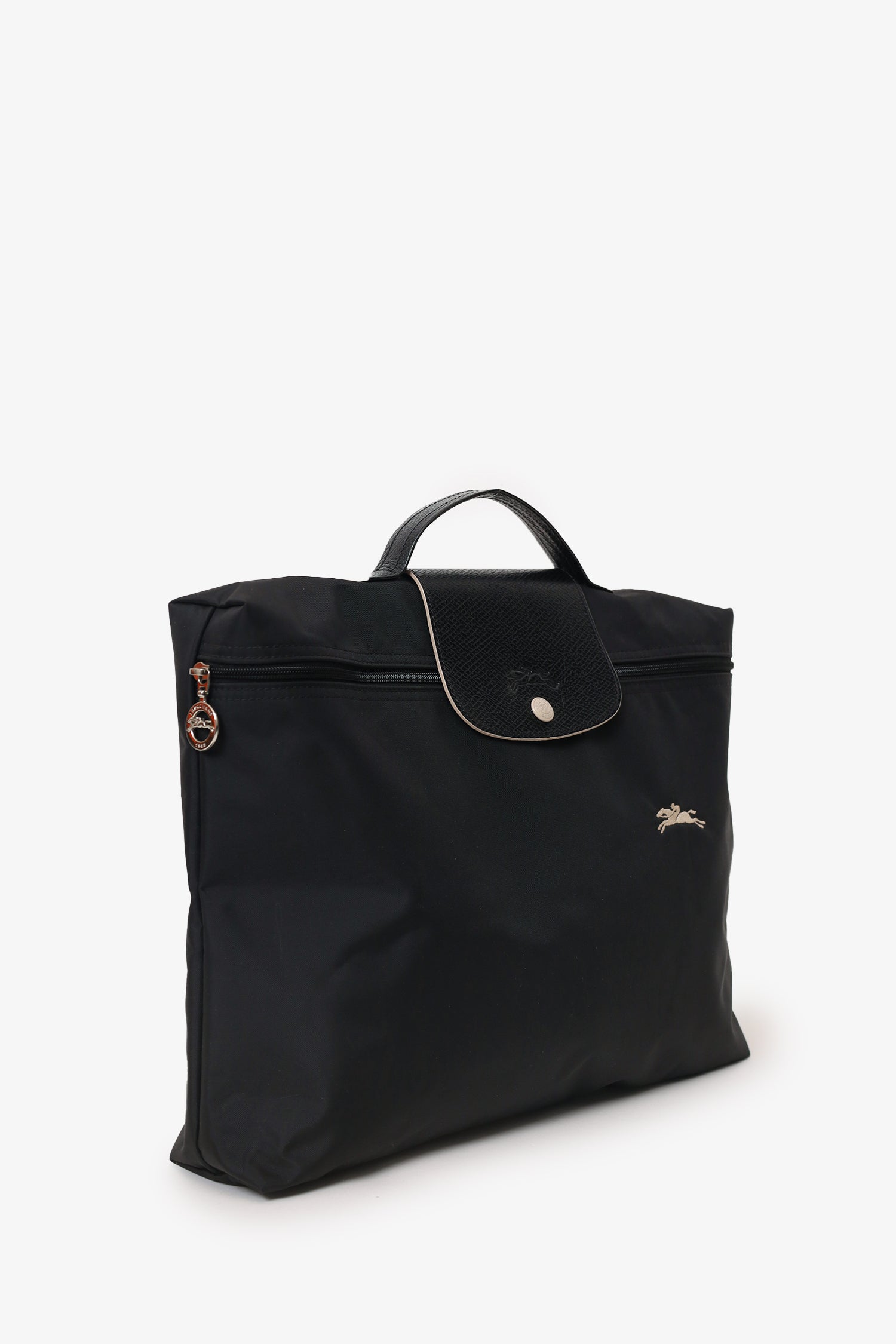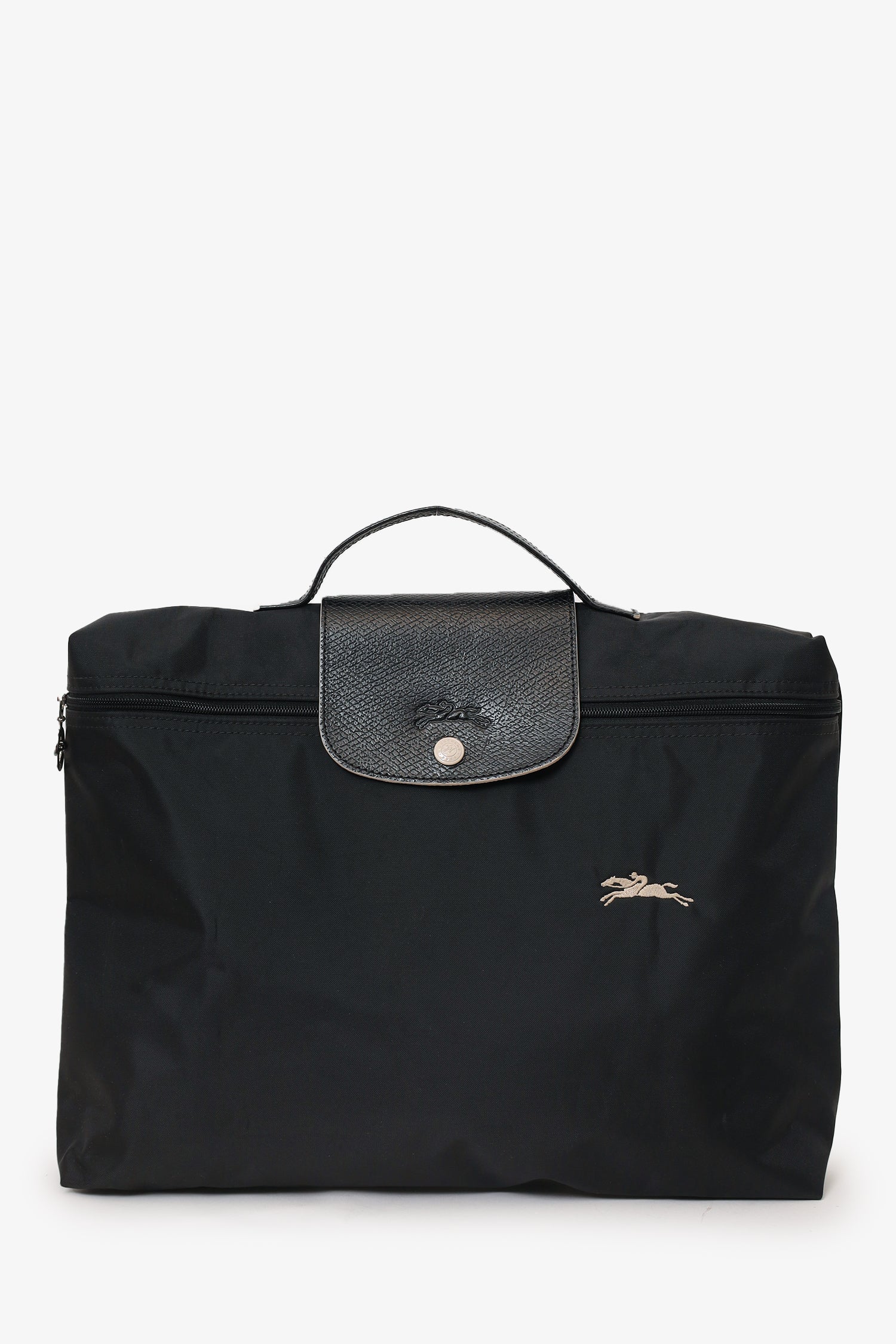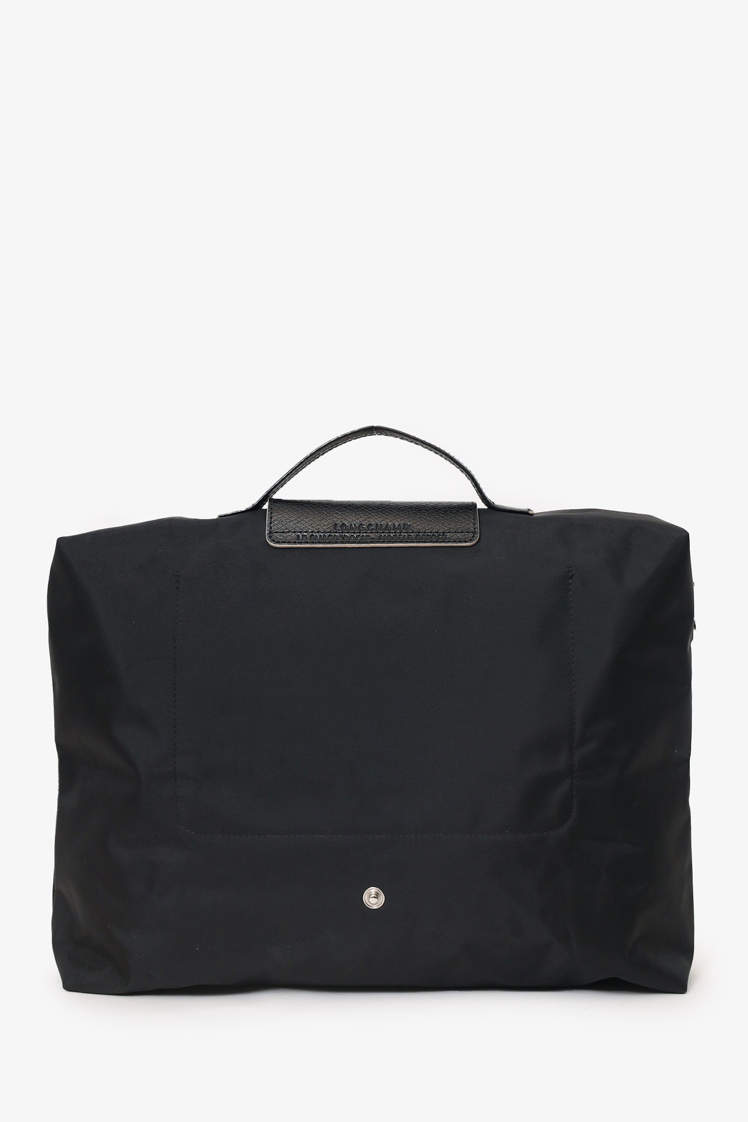 Longchamp Black Le Pliage Small Briefcase. Front-fold-over-flap with snap-button-up and front zip-up closure. Top handle. Lined interior with single rear slip pocket. Silver-tone hardware. Tonal stitching.