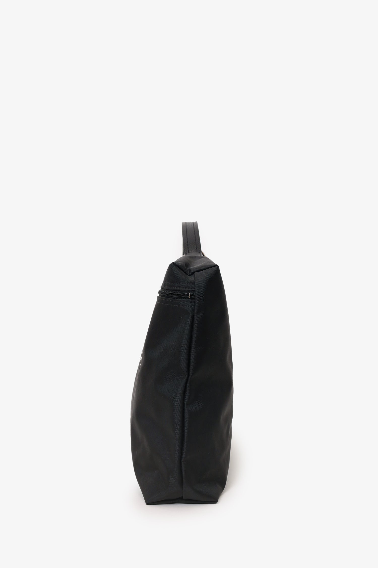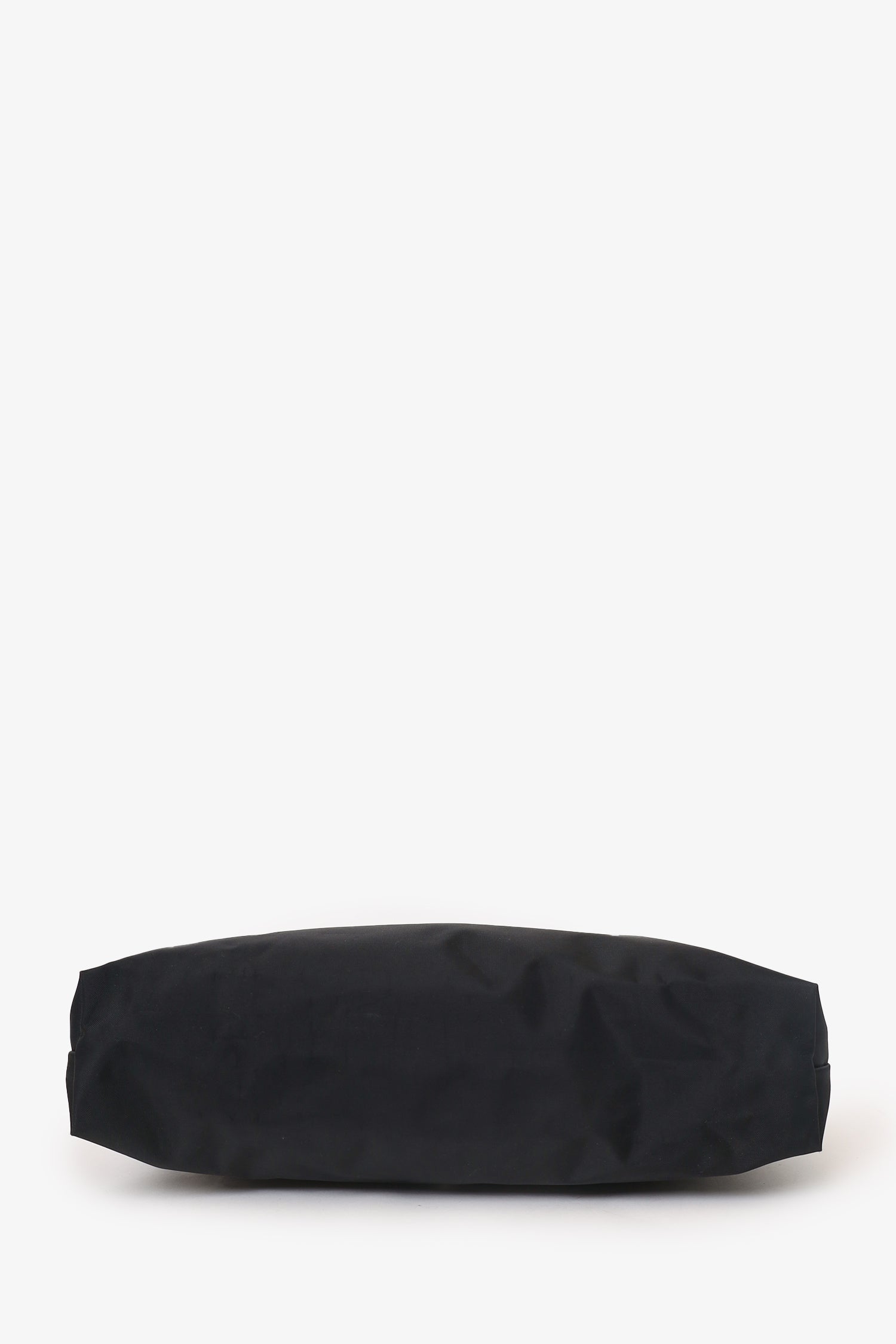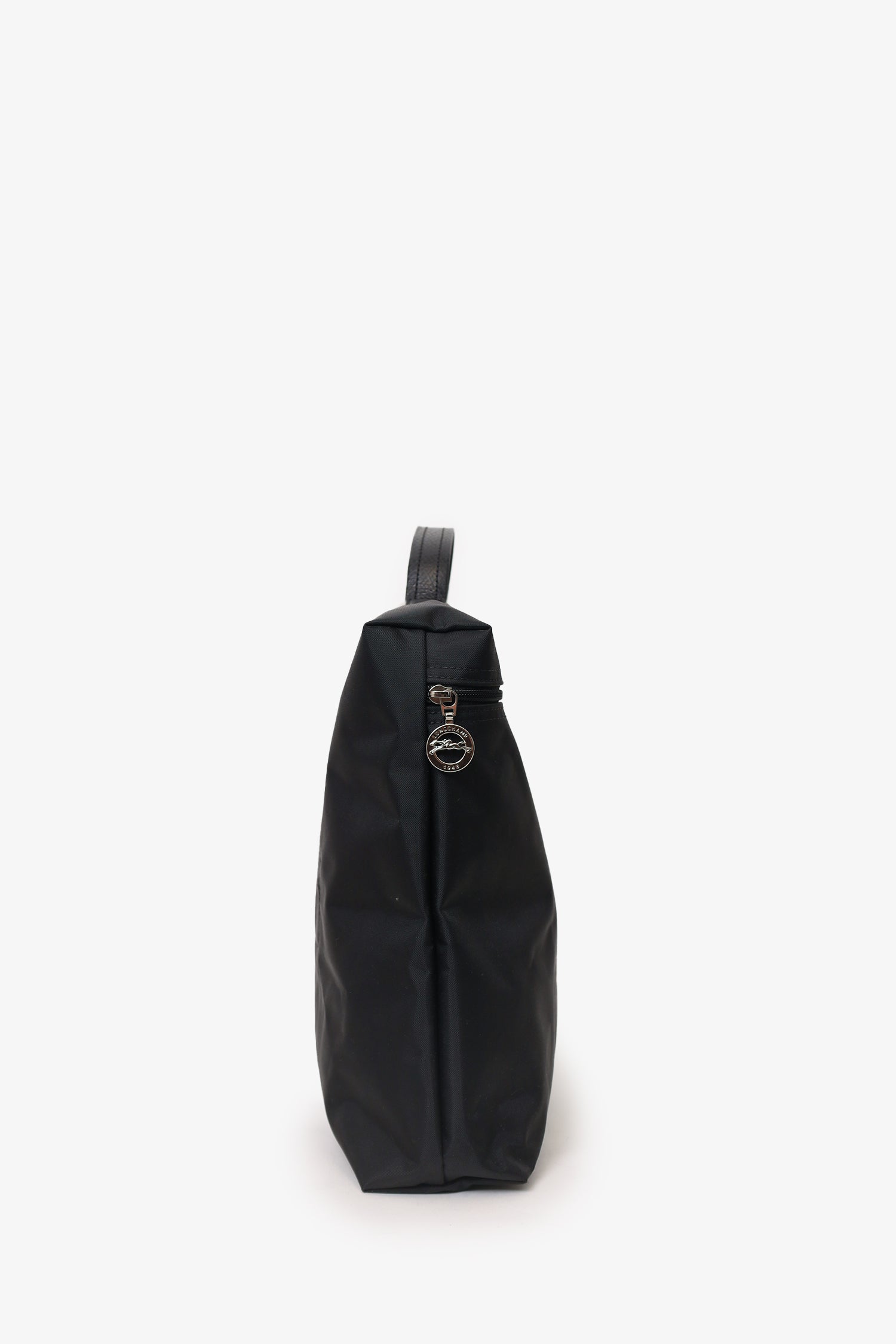 Longchamp Black Le Pliage Small Briefcase. Front-fold-over-flap with snap-button-up and front zip-up closure. Top handle. Lined interior with single rear slip pocket. Silver-tone hardware. Tonal stitching.