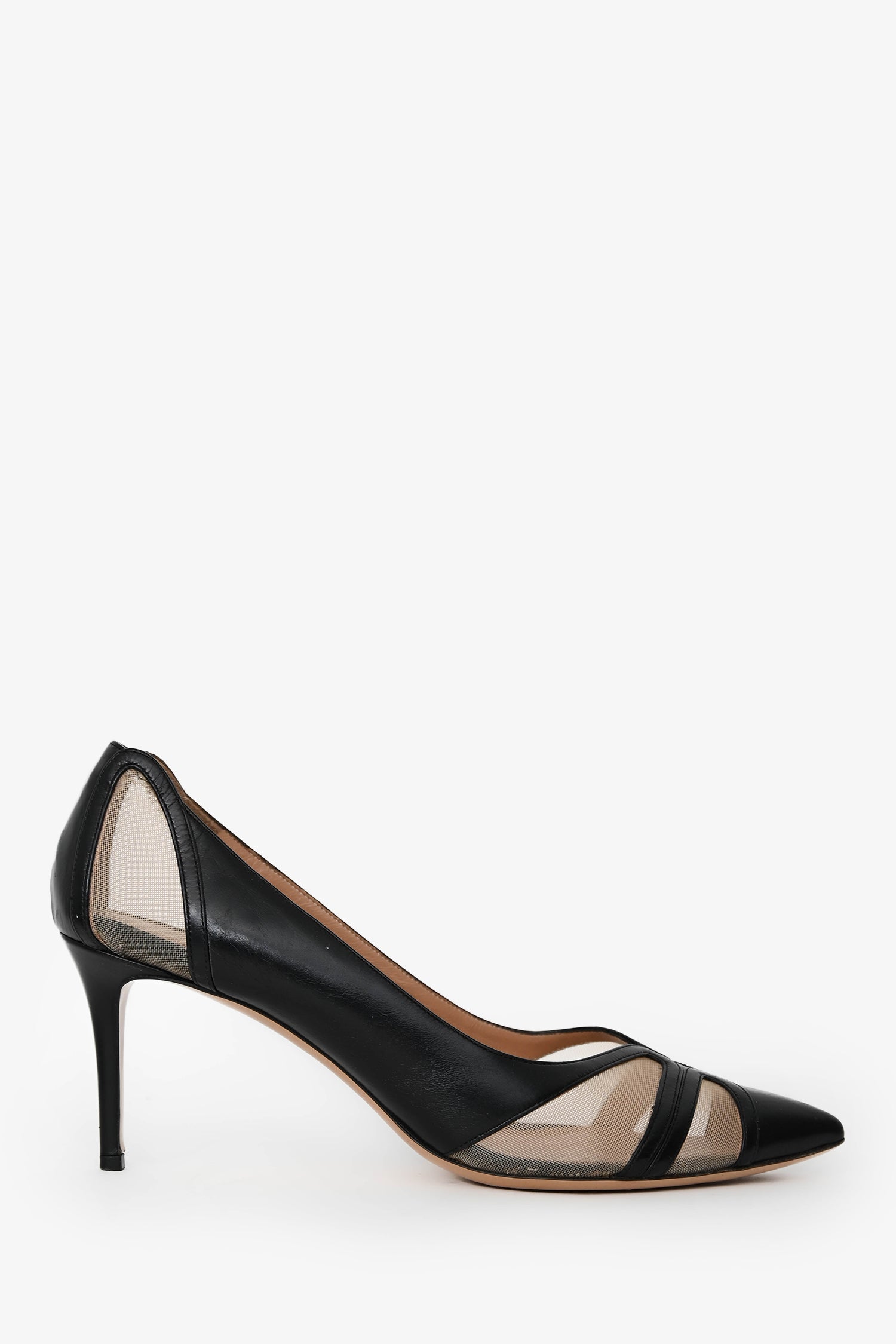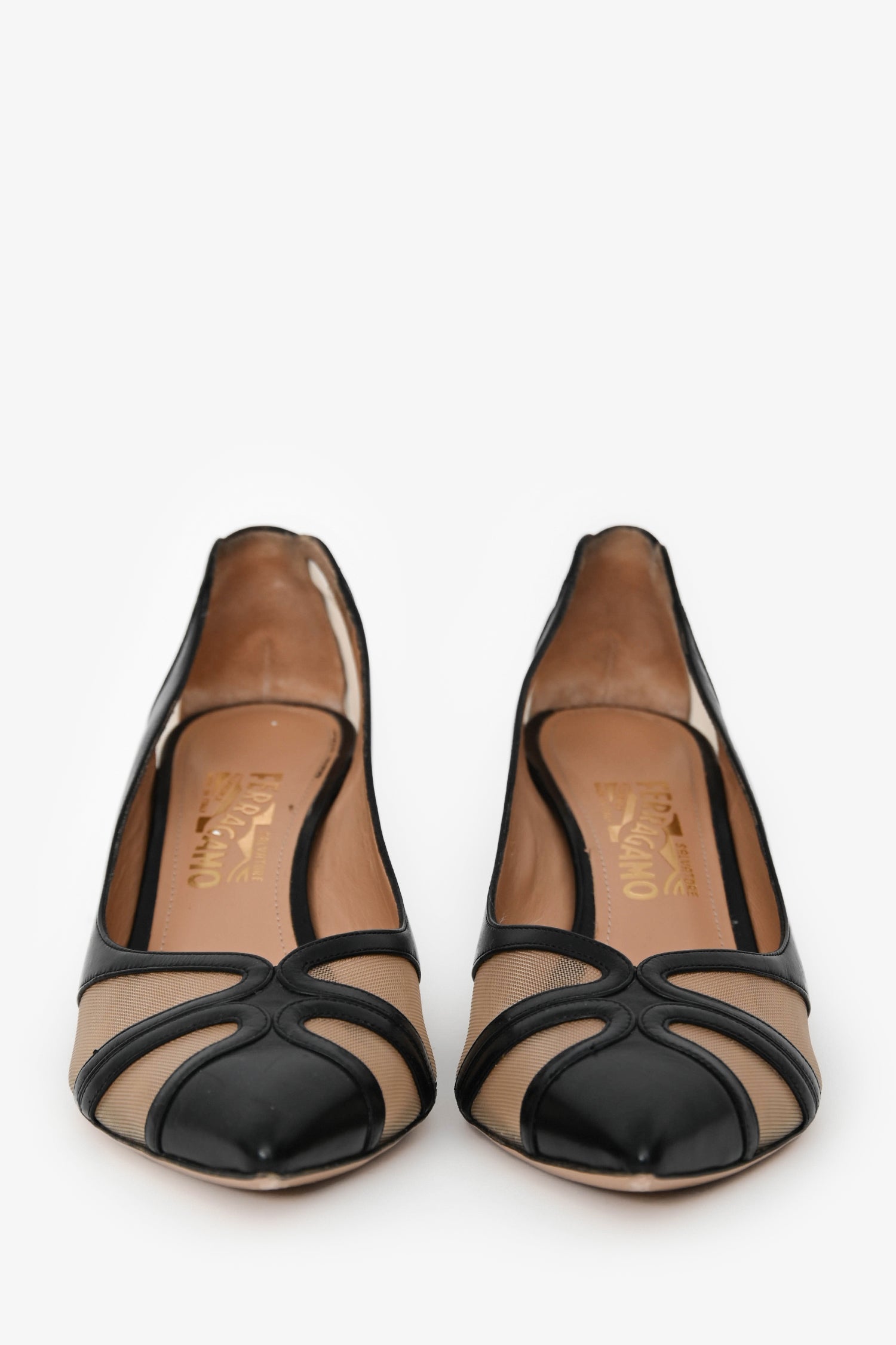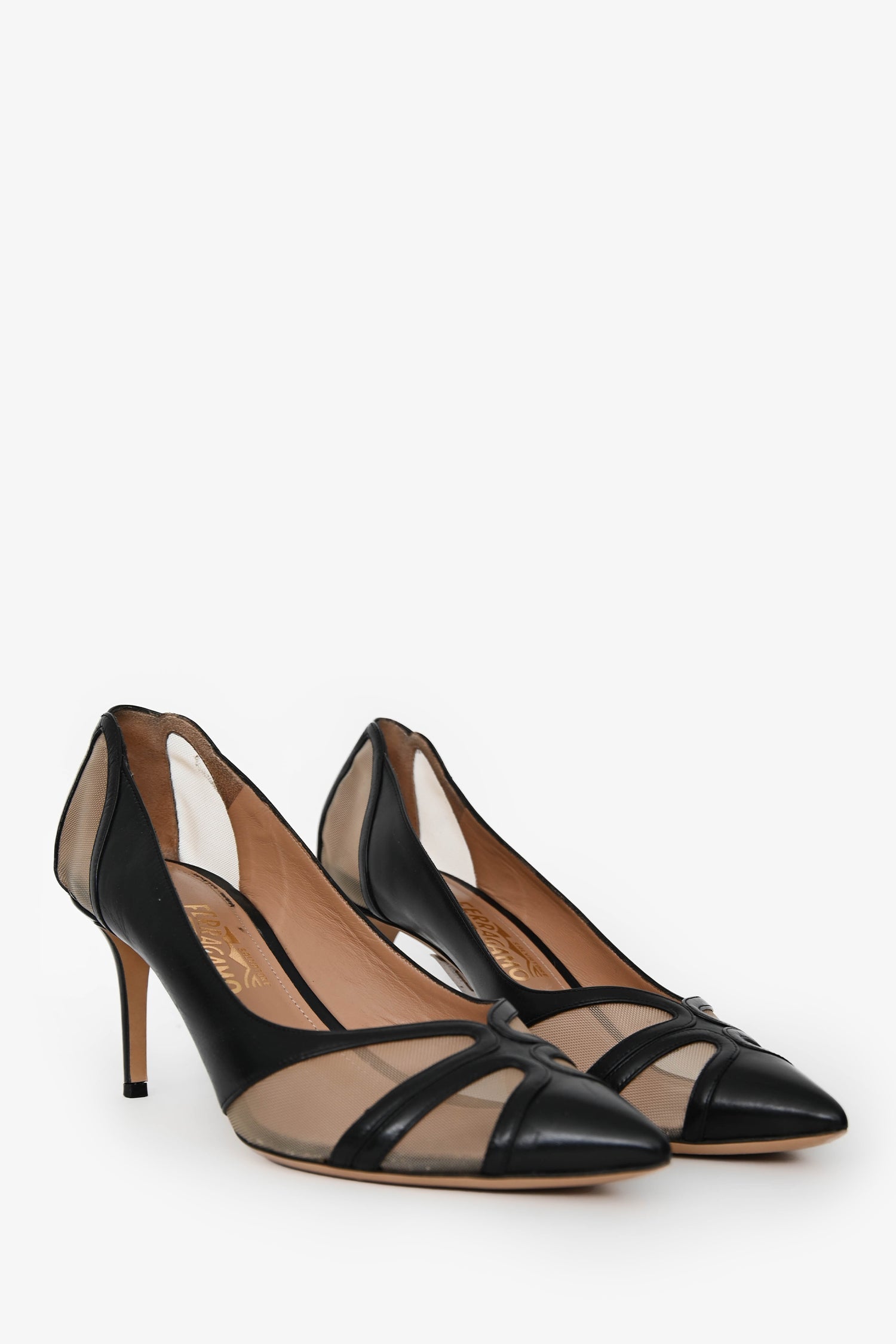 Salvatore Ferragamo Black/Sheer Leather/Mesh Pointed Heels. Pointed toe. Leather and mesh trim. Leather insole. Tonal stitching.