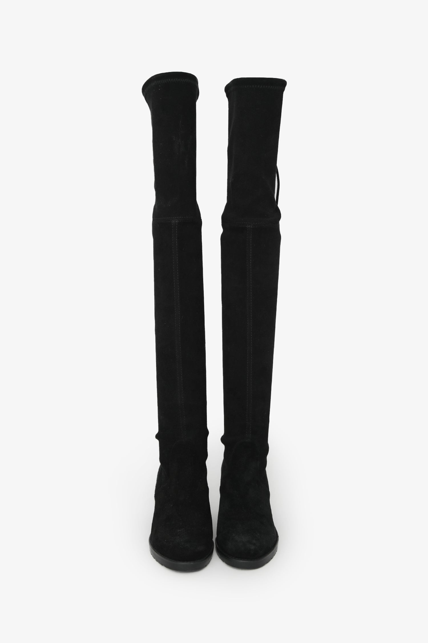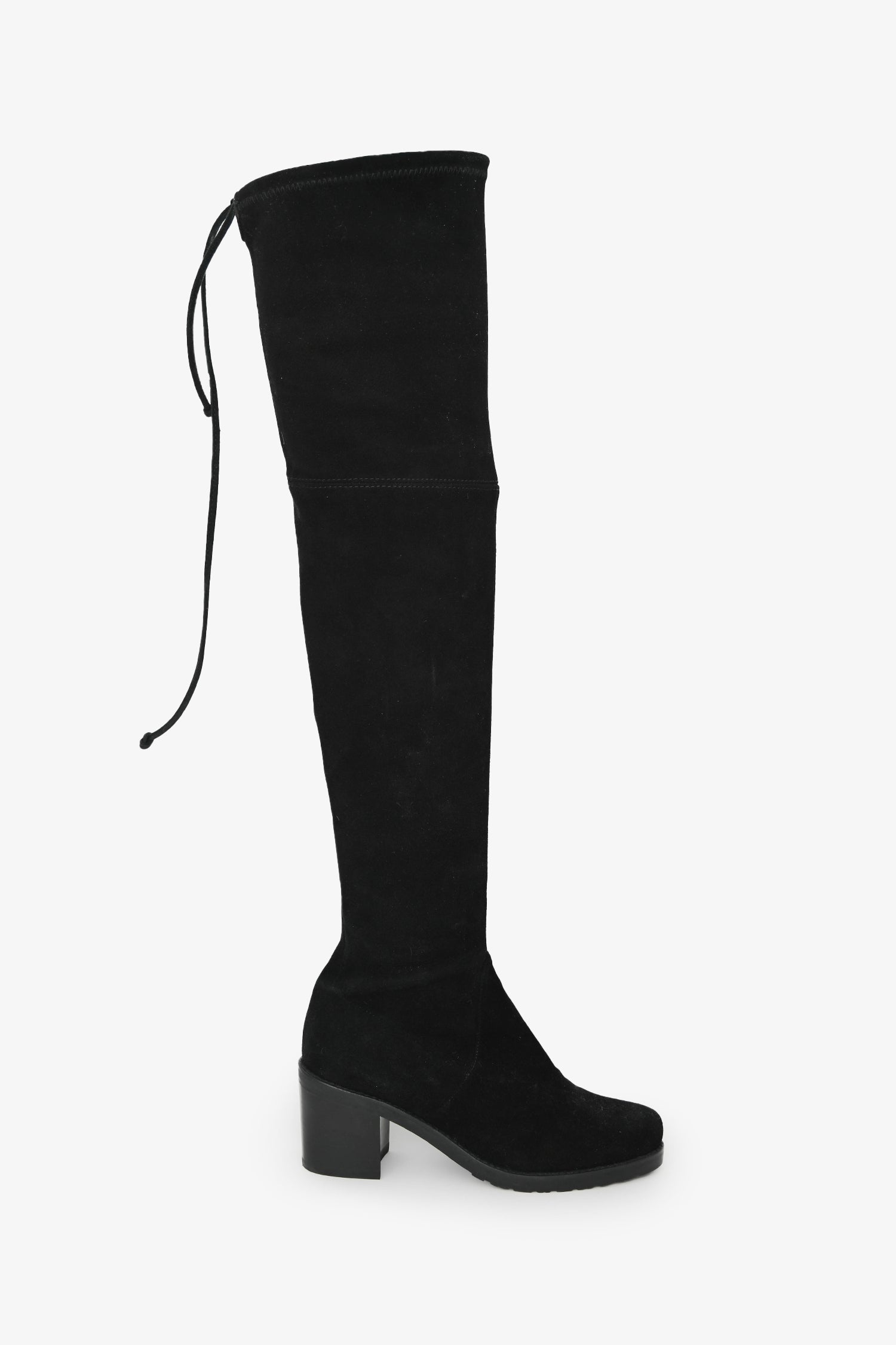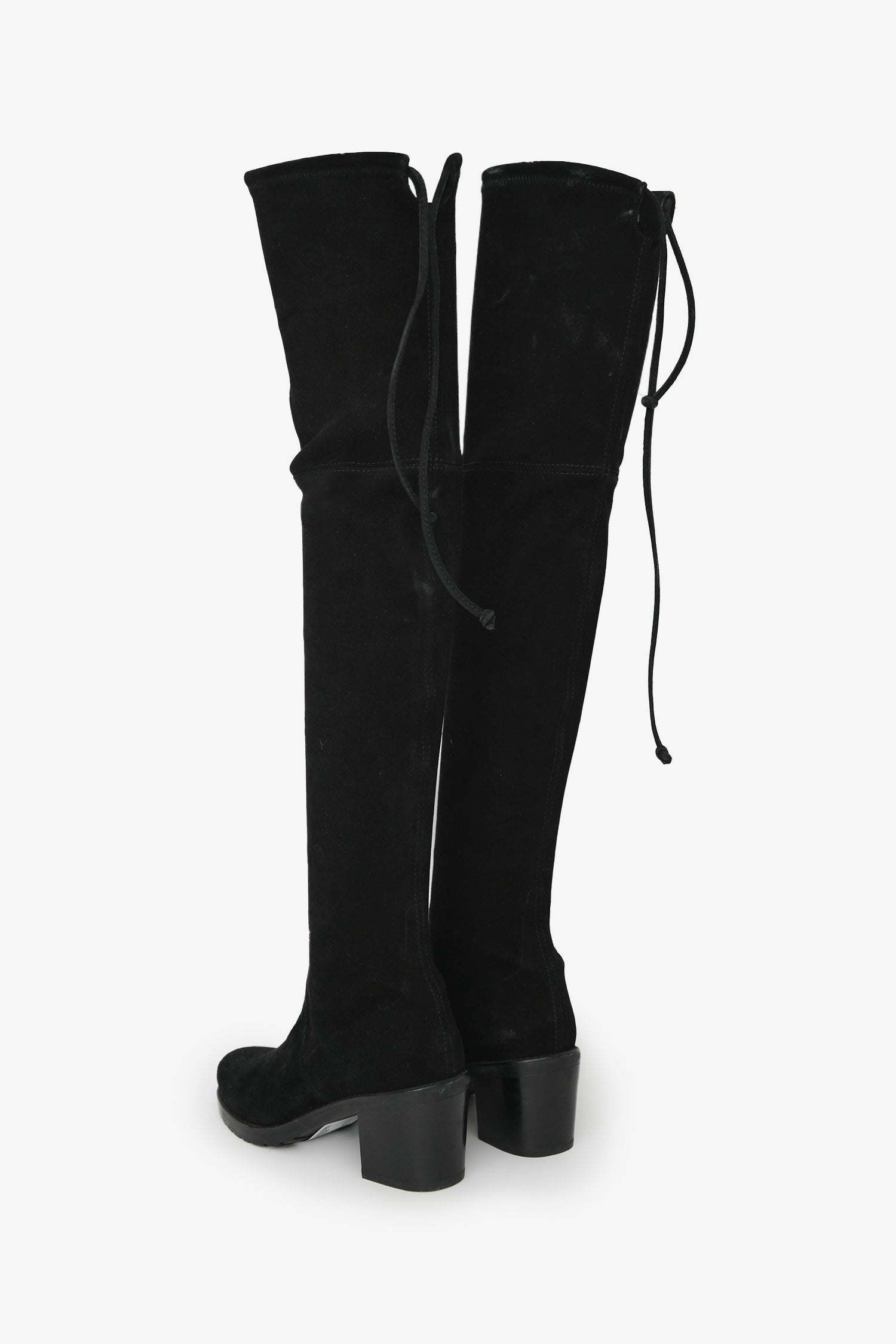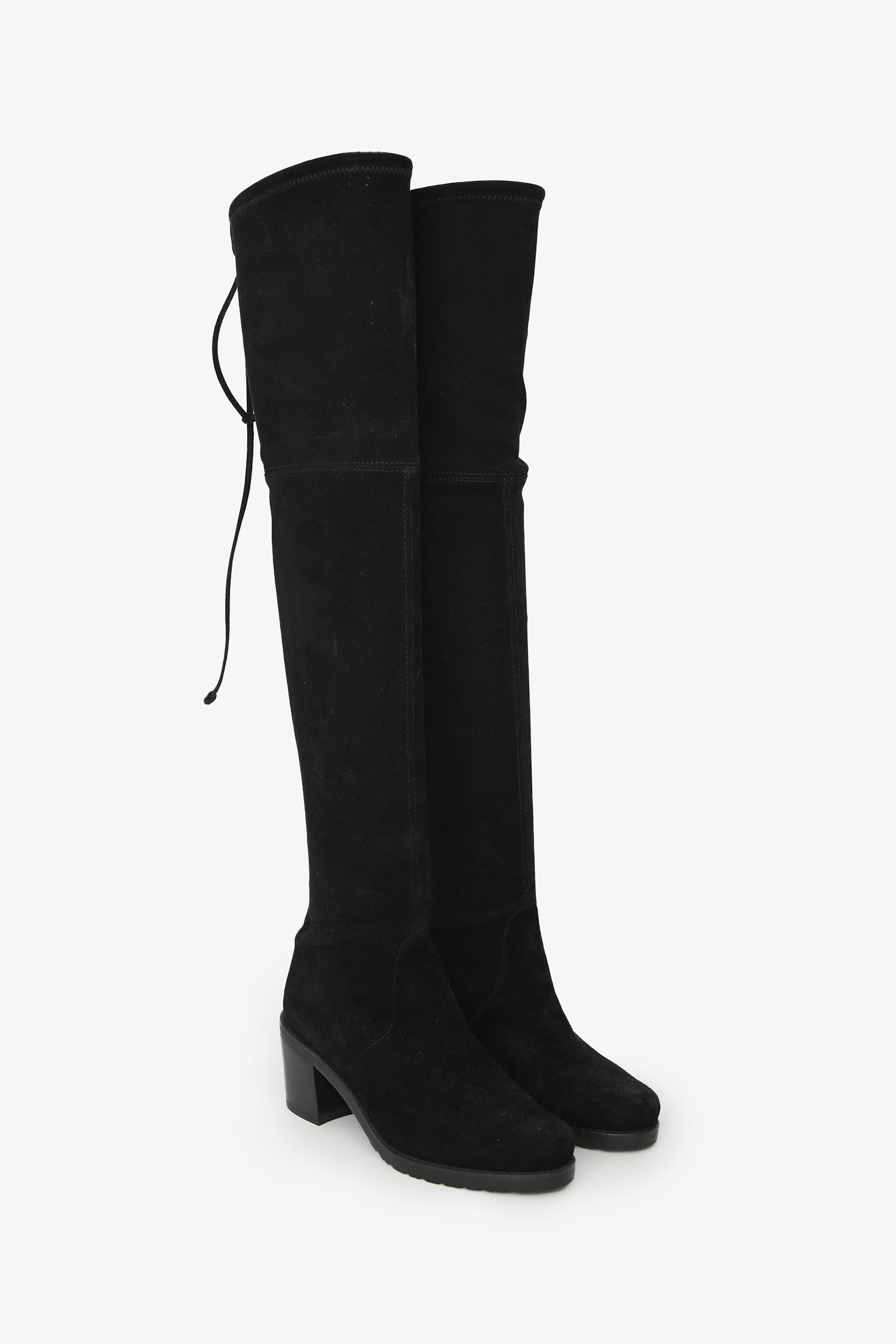 Stuart Weitzman Black Suede Tieland Over-the-Knee Boots. Pull-on. Almond toe. Upper rear tie detail. Leather insole. Block heel. Tonal stitching.