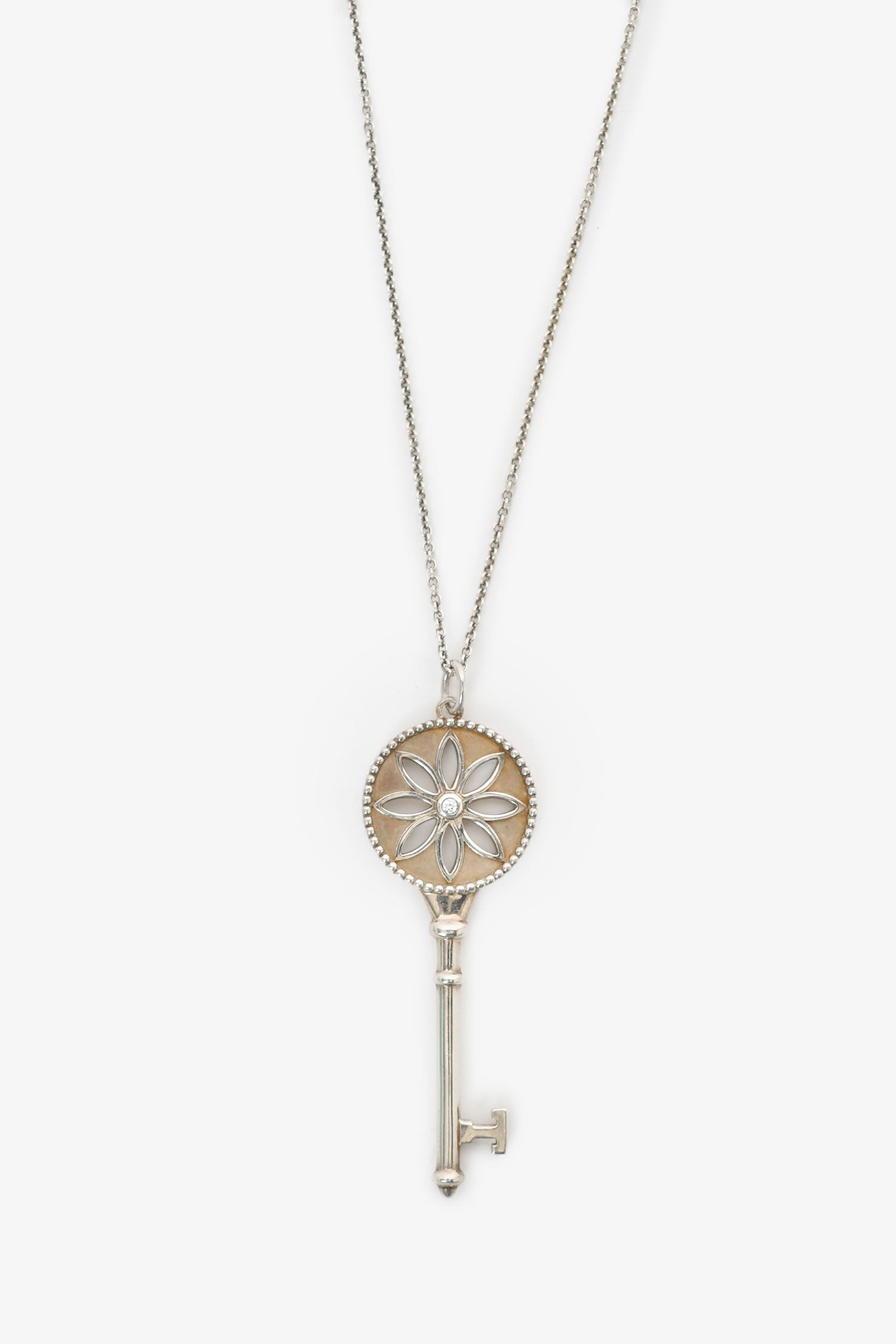 Tiffany & Co. Sterling Silver Diamond Daisy Key Pendant Necklace. Ring clasp closure.