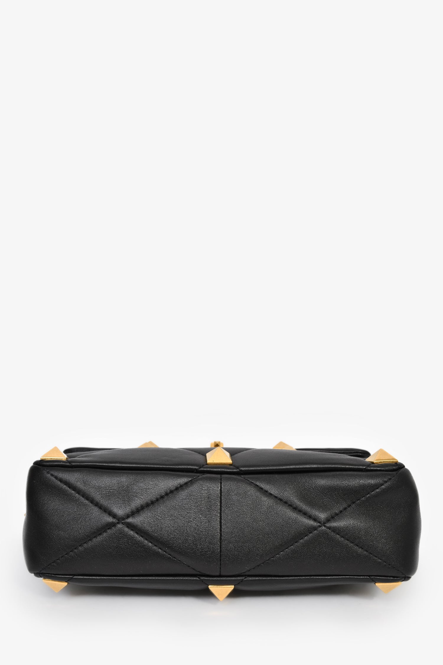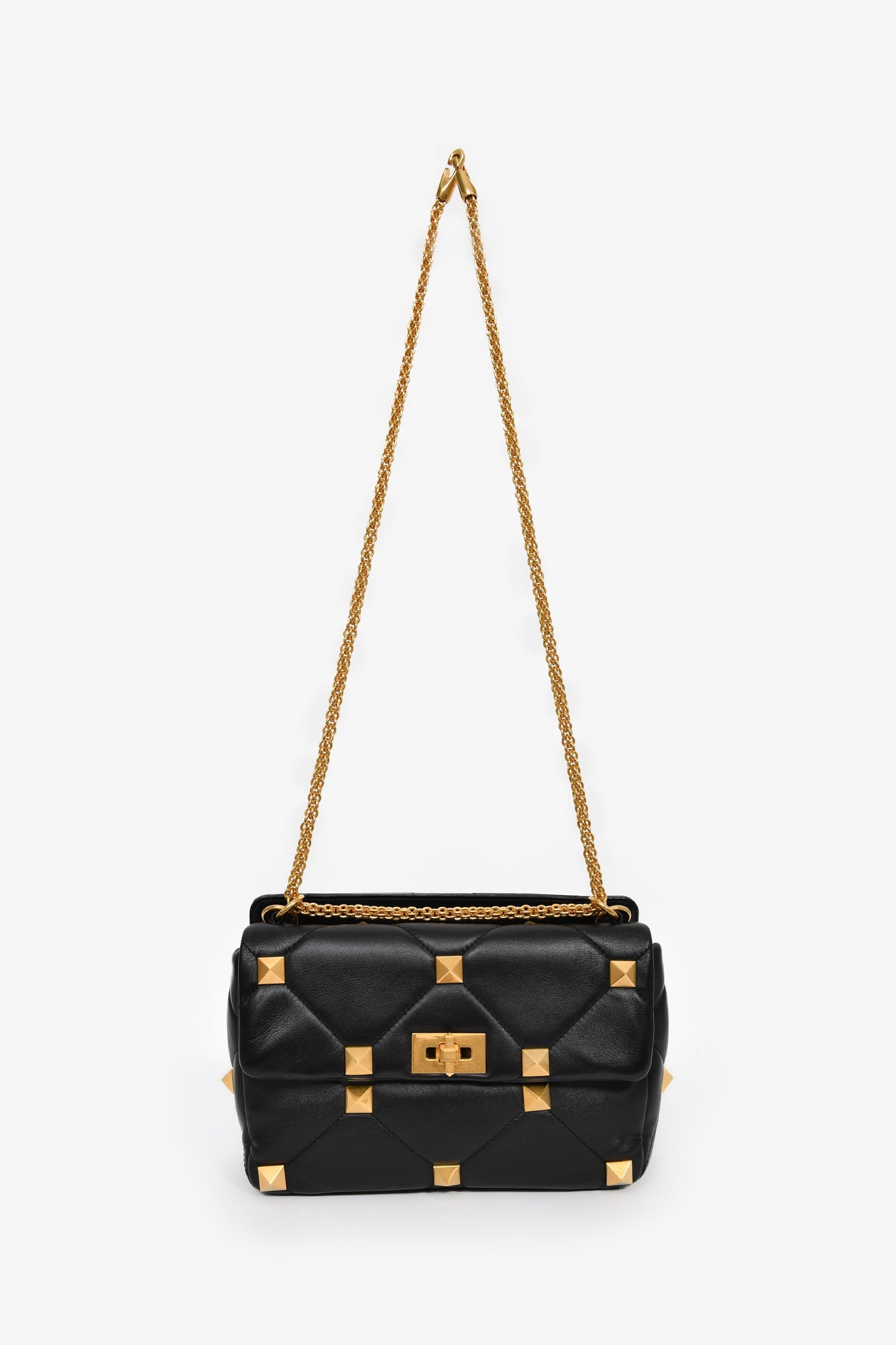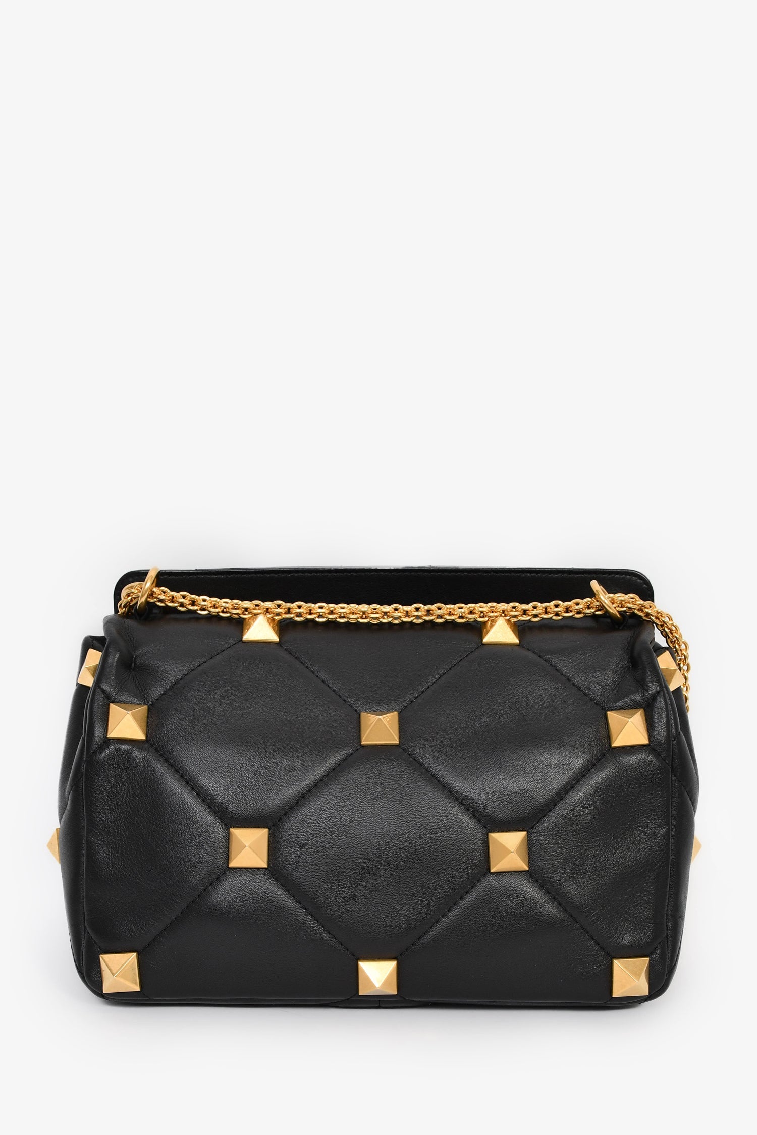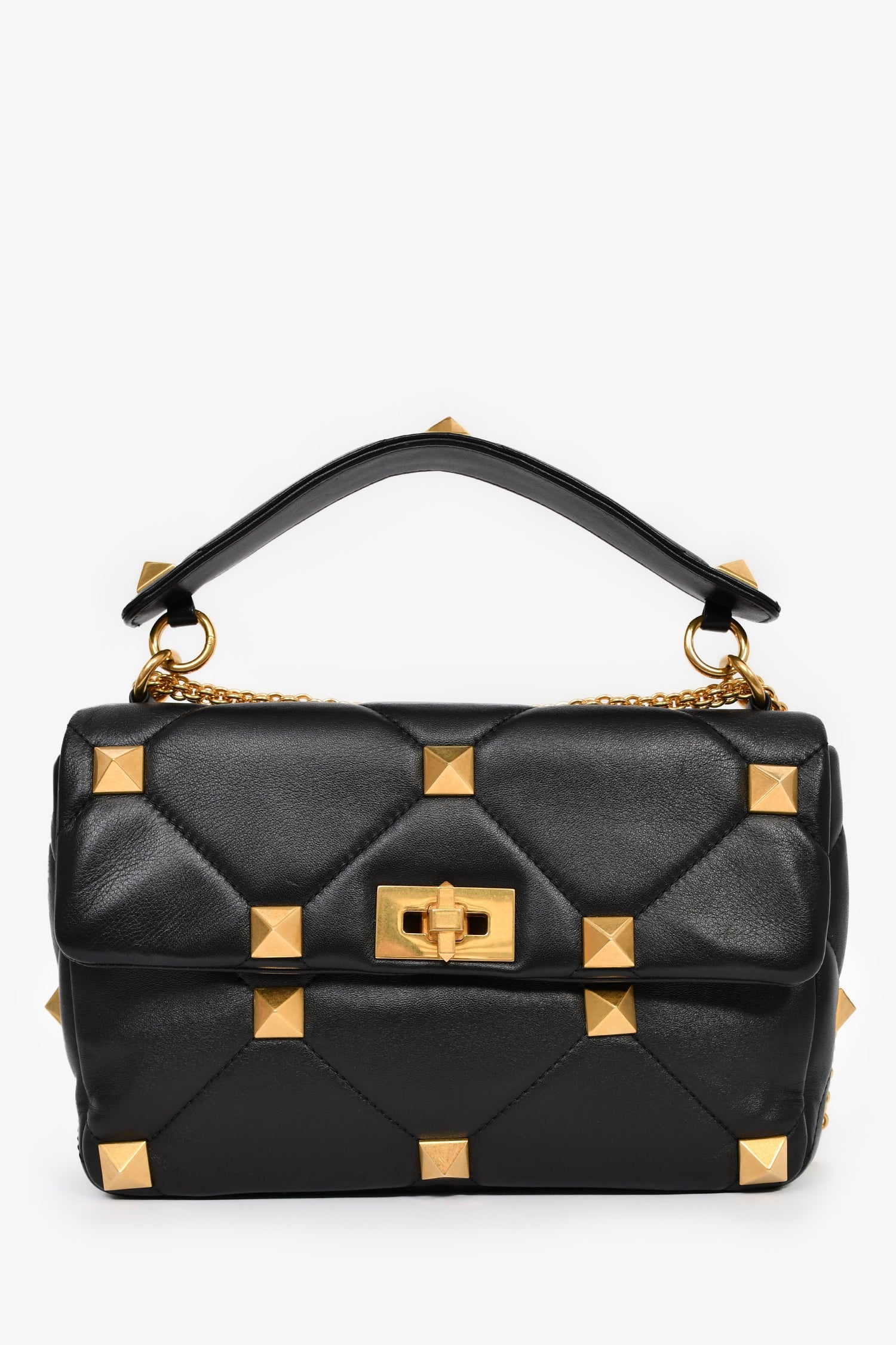 Valentino Black Leather Roman Stud Shoulder Bag. Front fold-over flap with turn-lock closure. Top handle. Slide-around chain strap. Leather-lined interior. 3 interior wall pockets; 2 slip, 1 with zip closure. Gold-tone hardware. Tonal stitching.