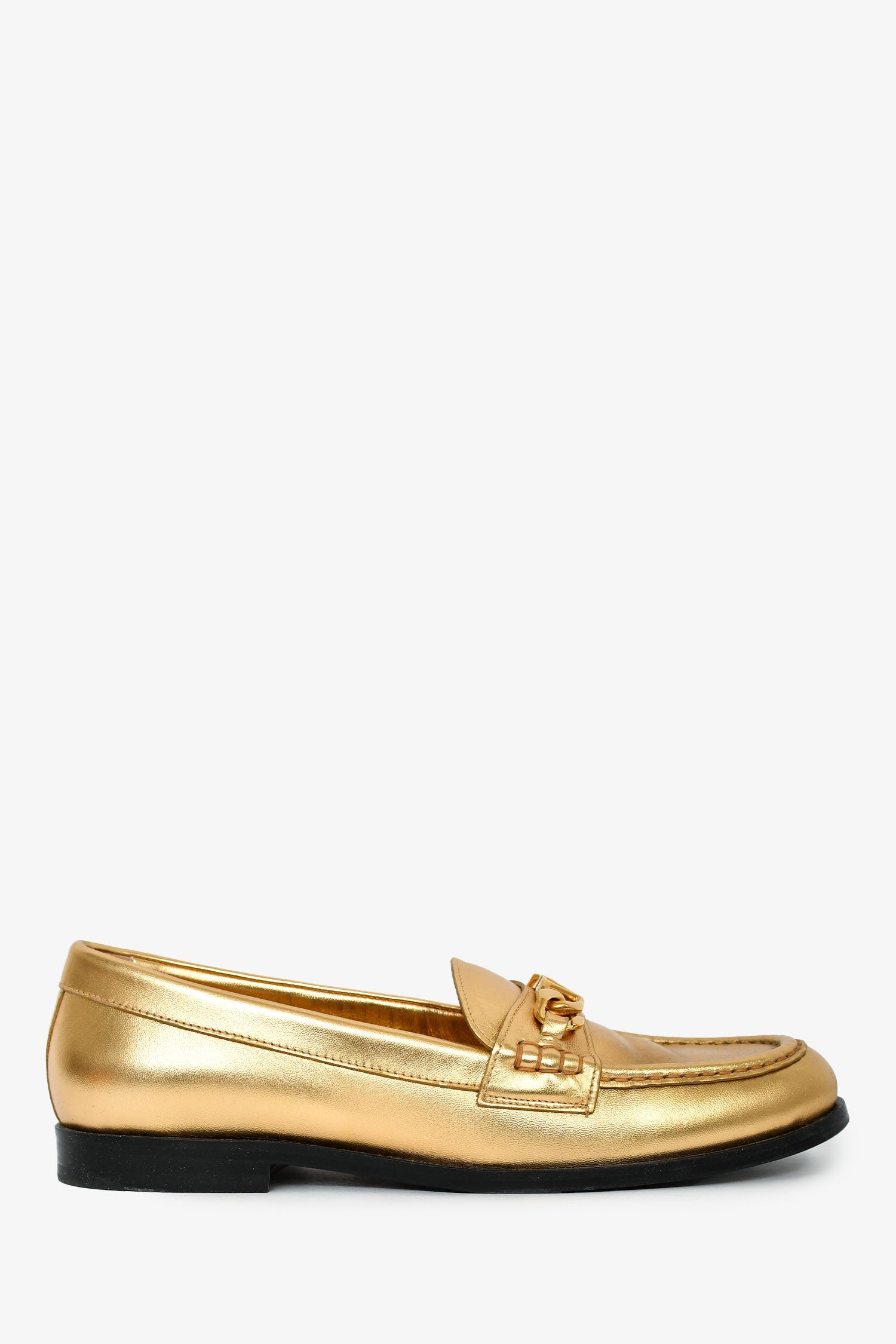 Valentino Gold Leather Chain Link Accents Penny Loafers. Round toe. Leather insoles. Gold-tone hardware. Tonal stitching.