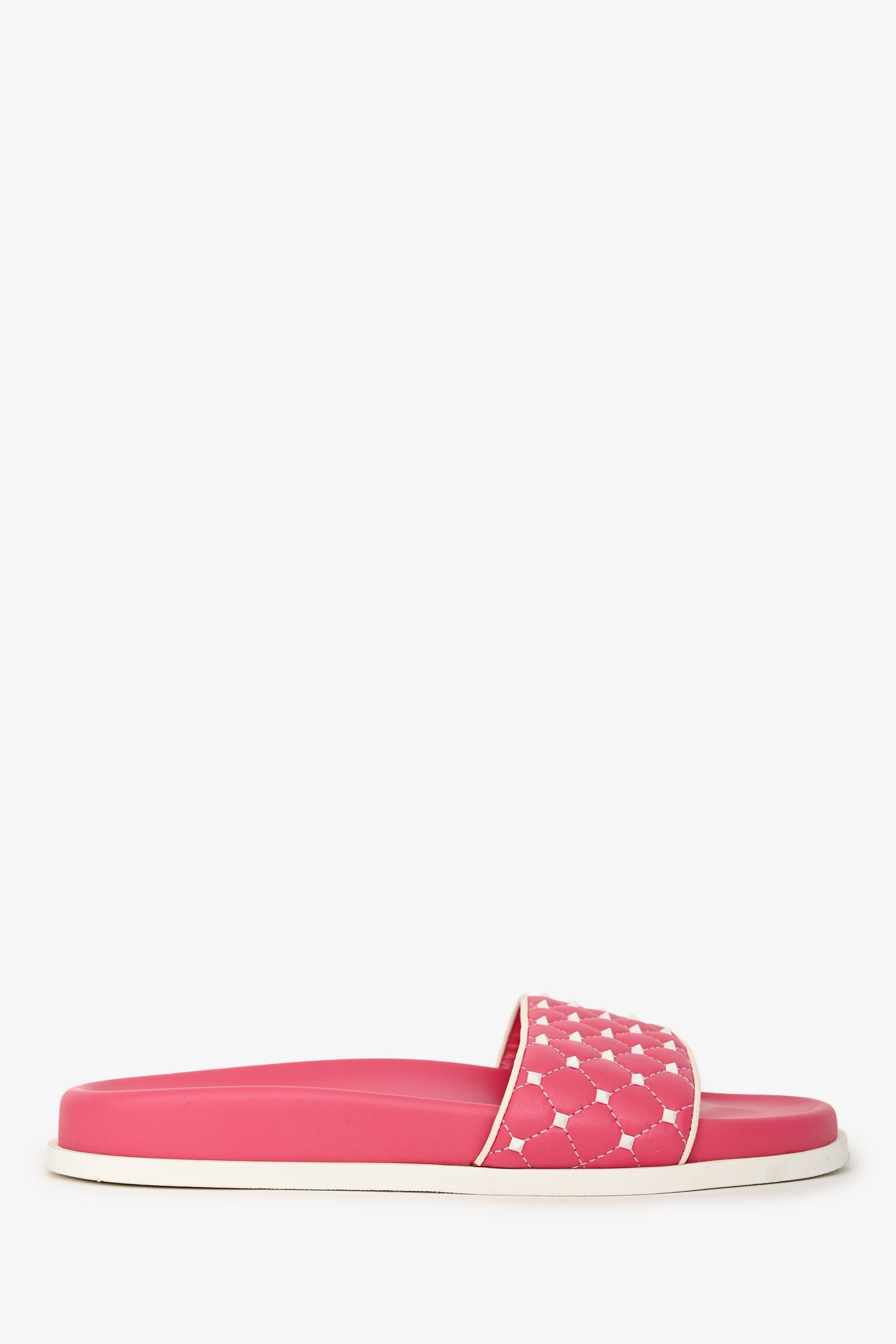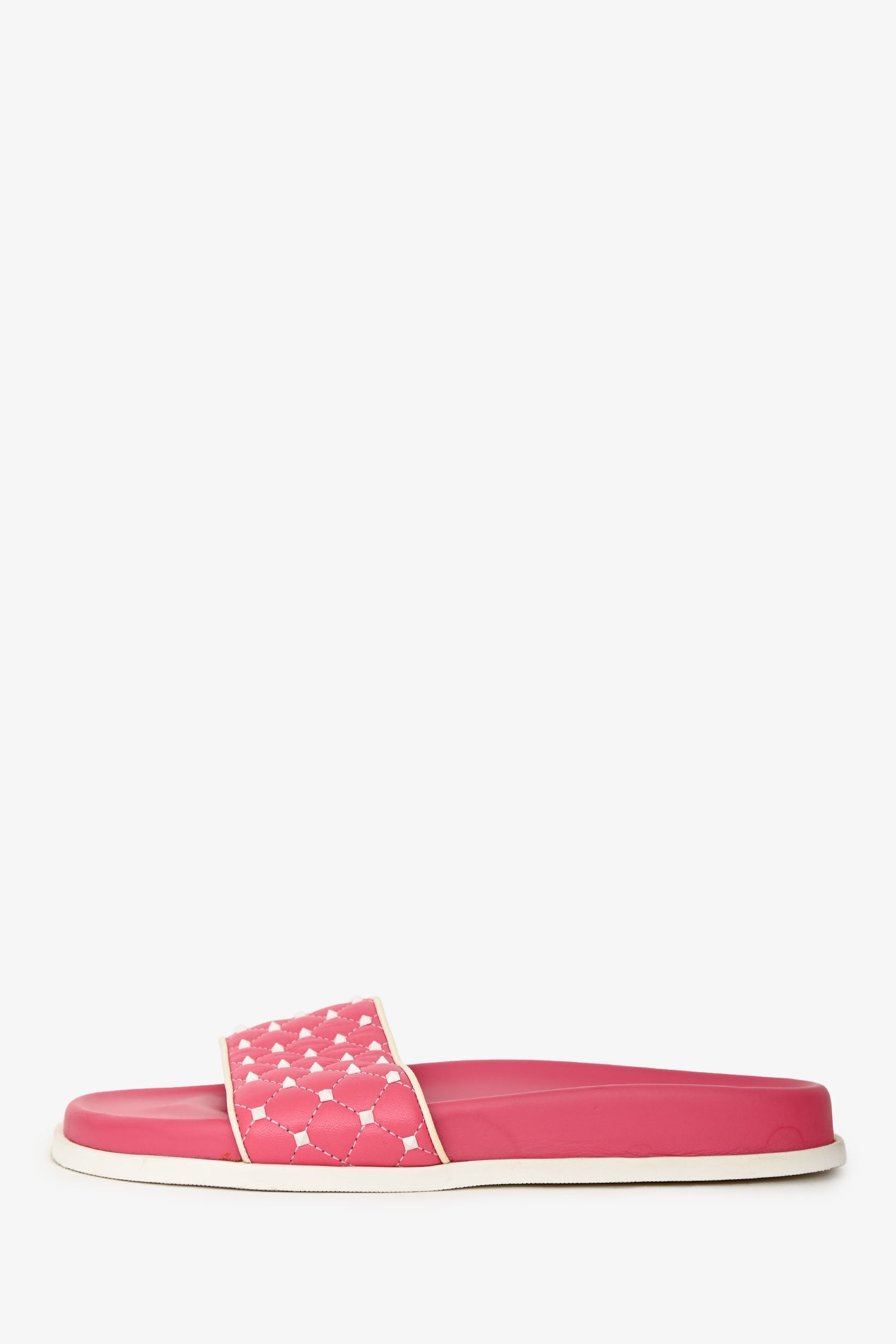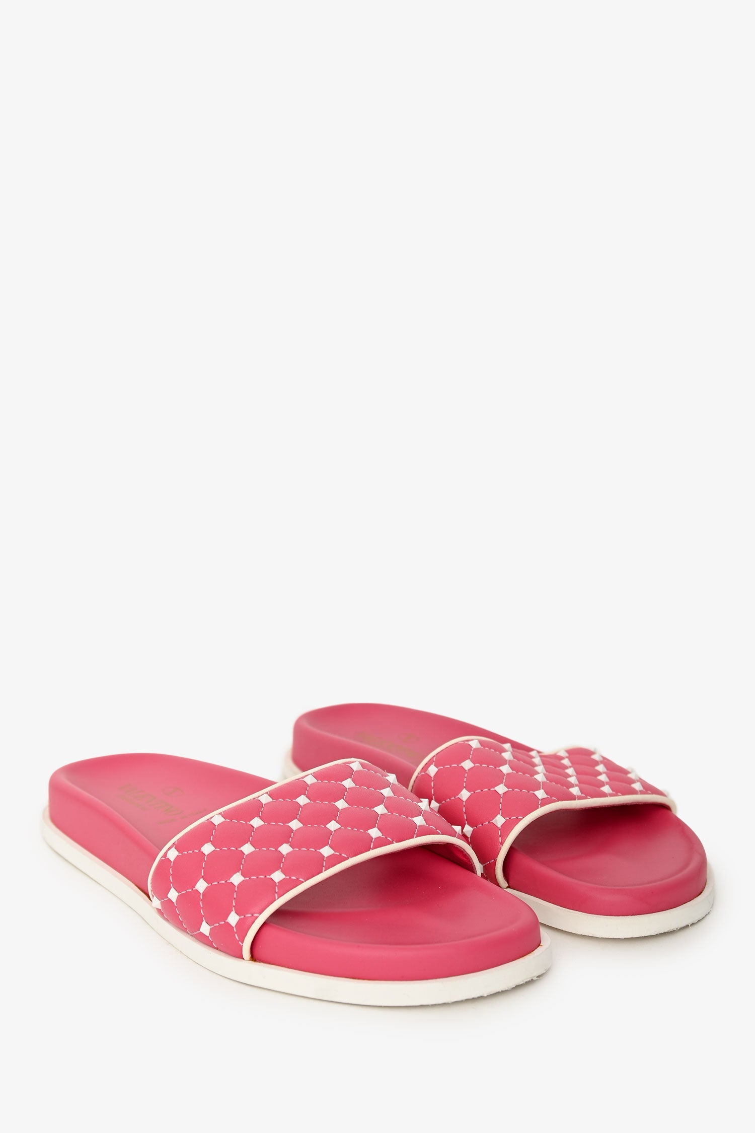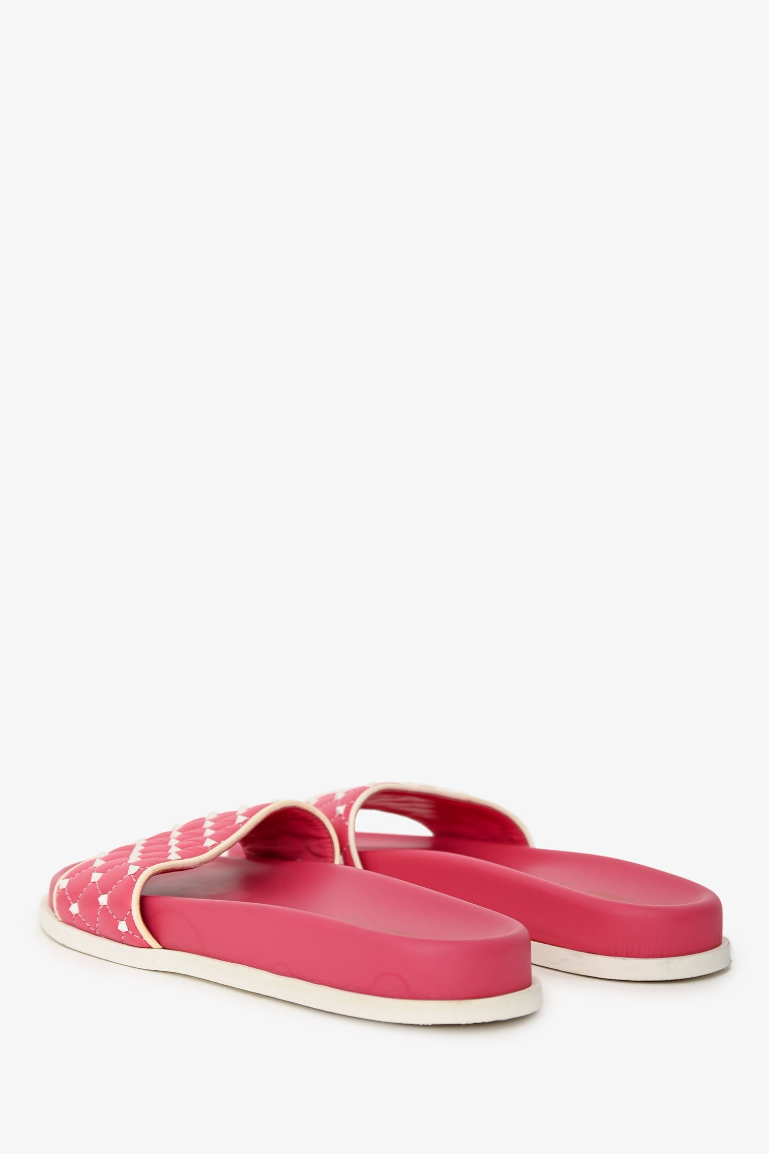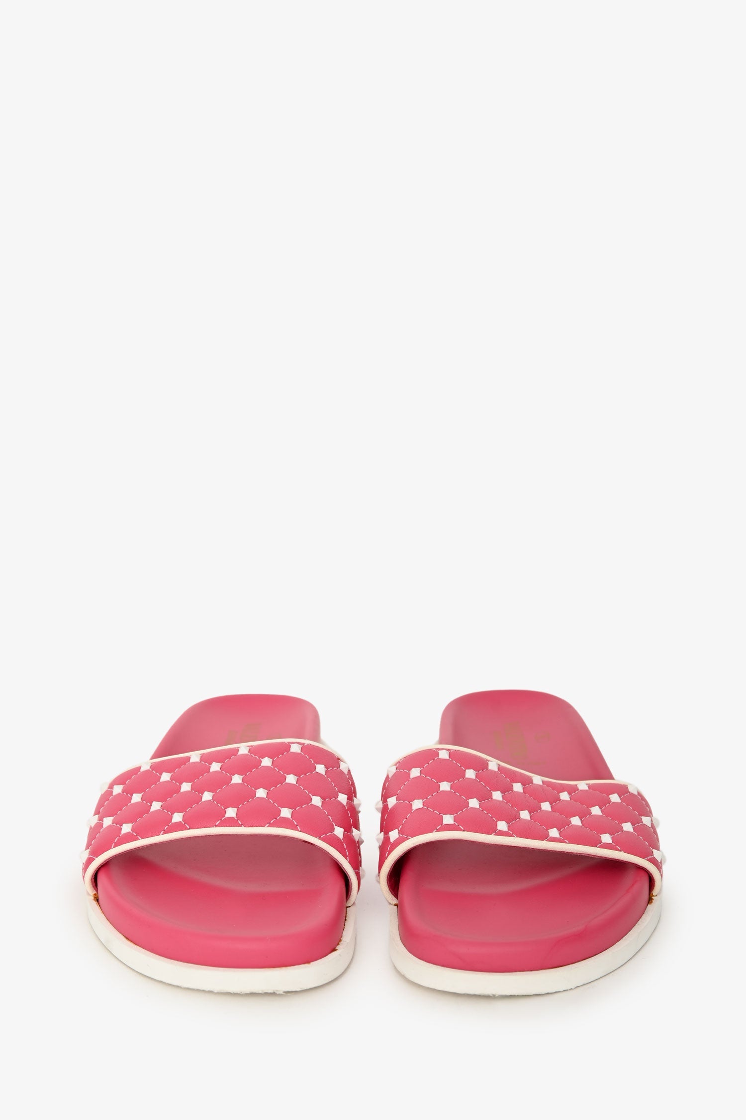 Valentino Pink Leather Rockstud Spike Slides. Open toe. White-tone hardware. Tonal stitching.