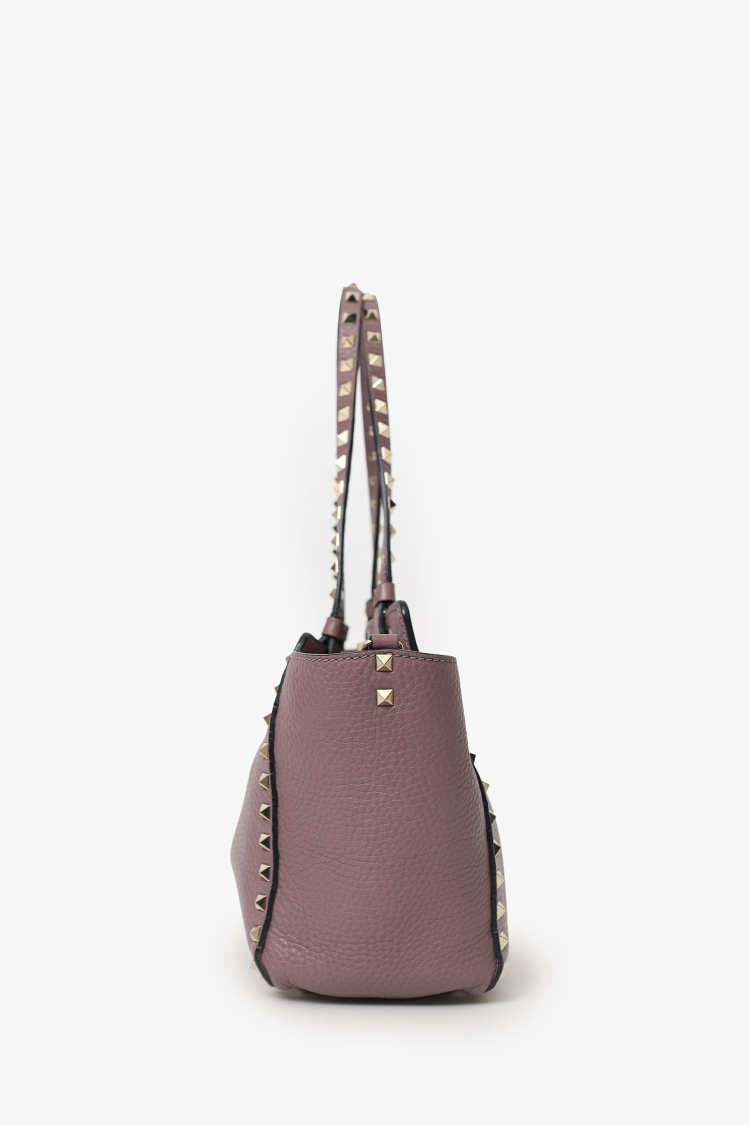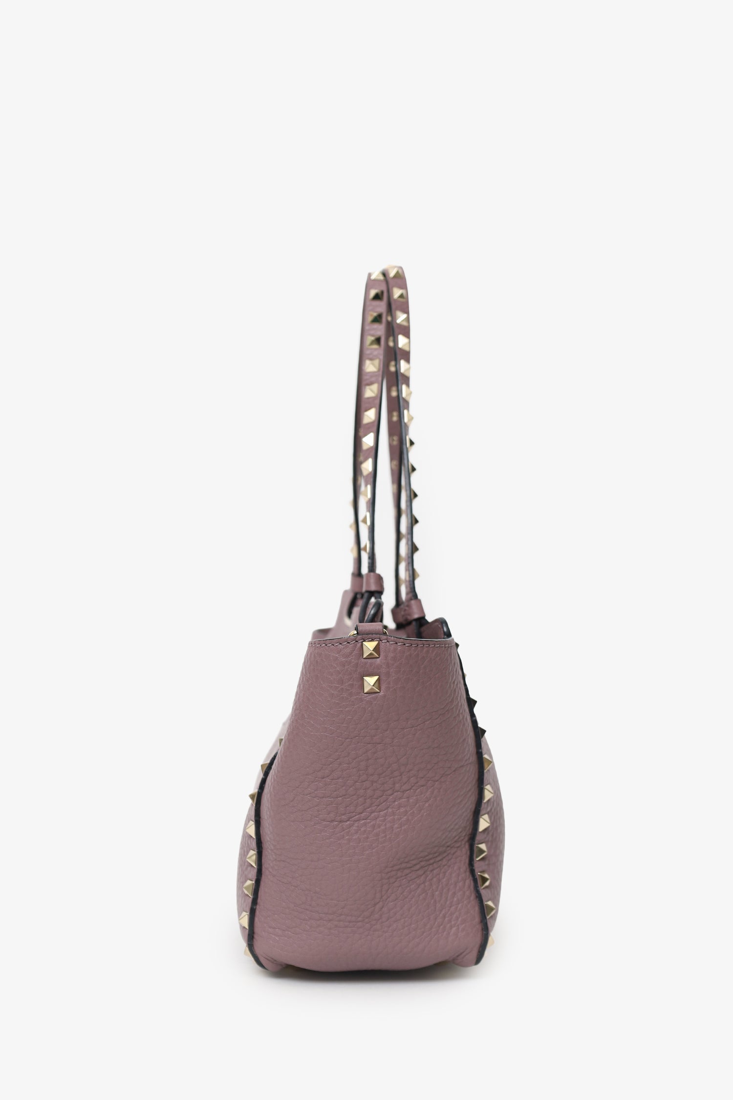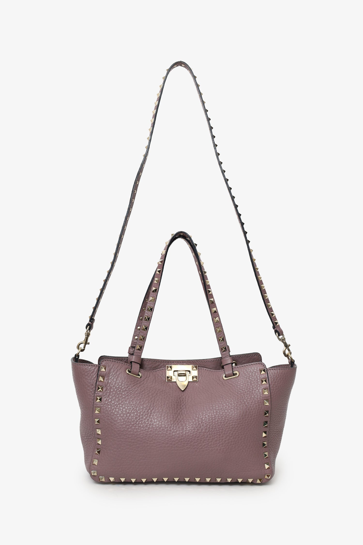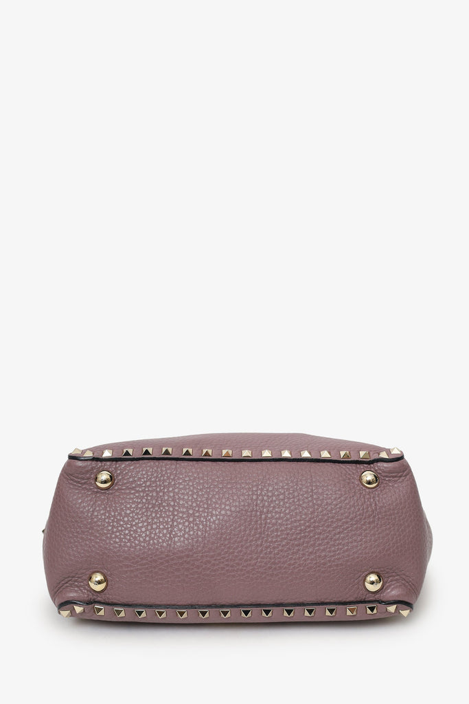 Valentino Pink Leather Small Rockstud Trapeze Tote With Strap. Front flip-lock closure. Twin top straps. Removable crossbody strap with clasp closure. Protective base studs. Suede lined interior. Single interior wall zip pocket. Silver-tone hardware. Tonal stitching.