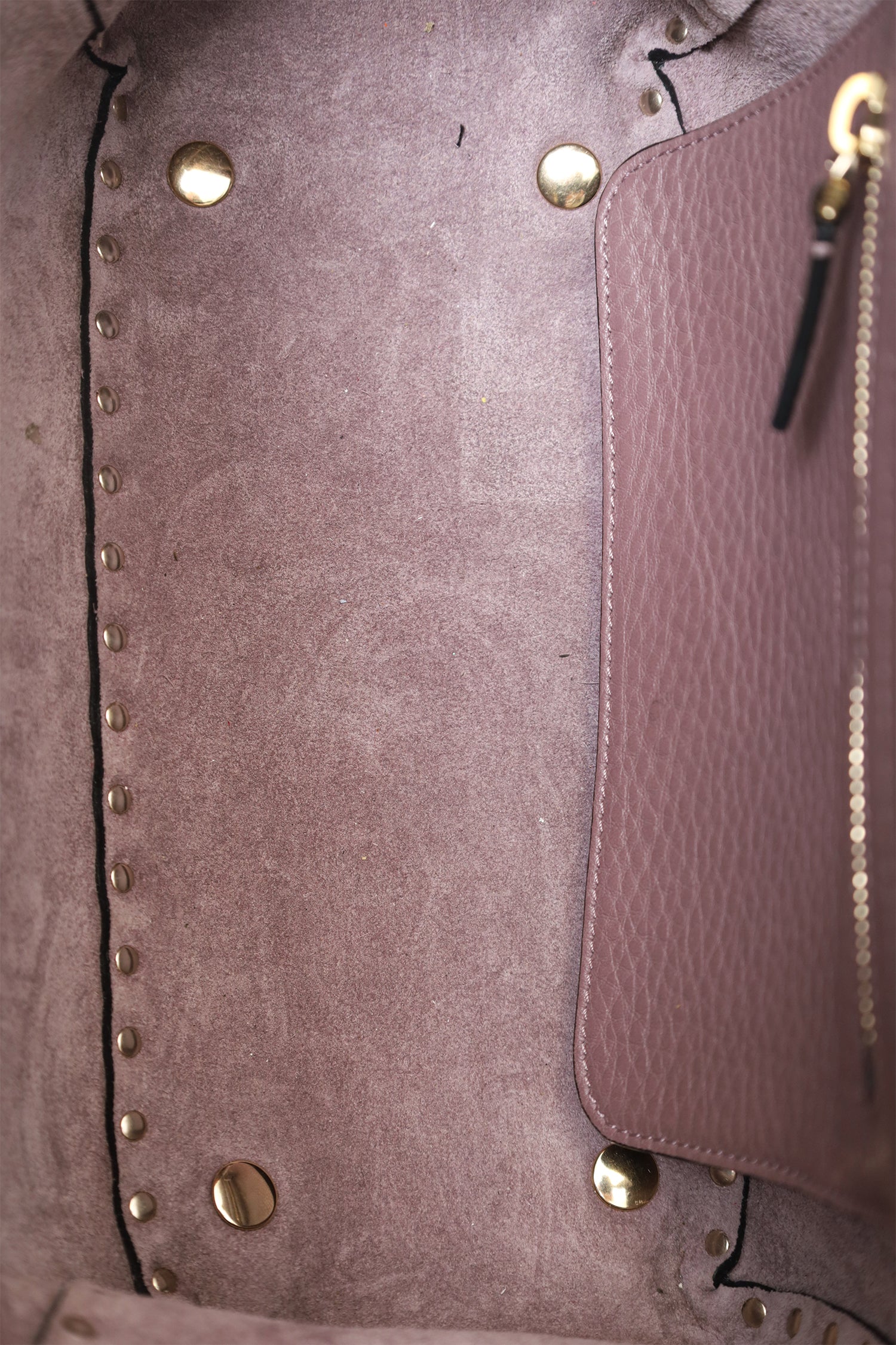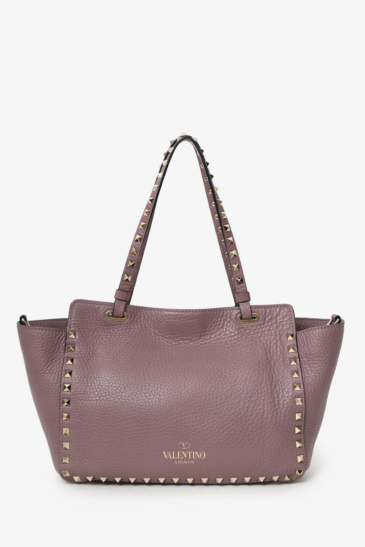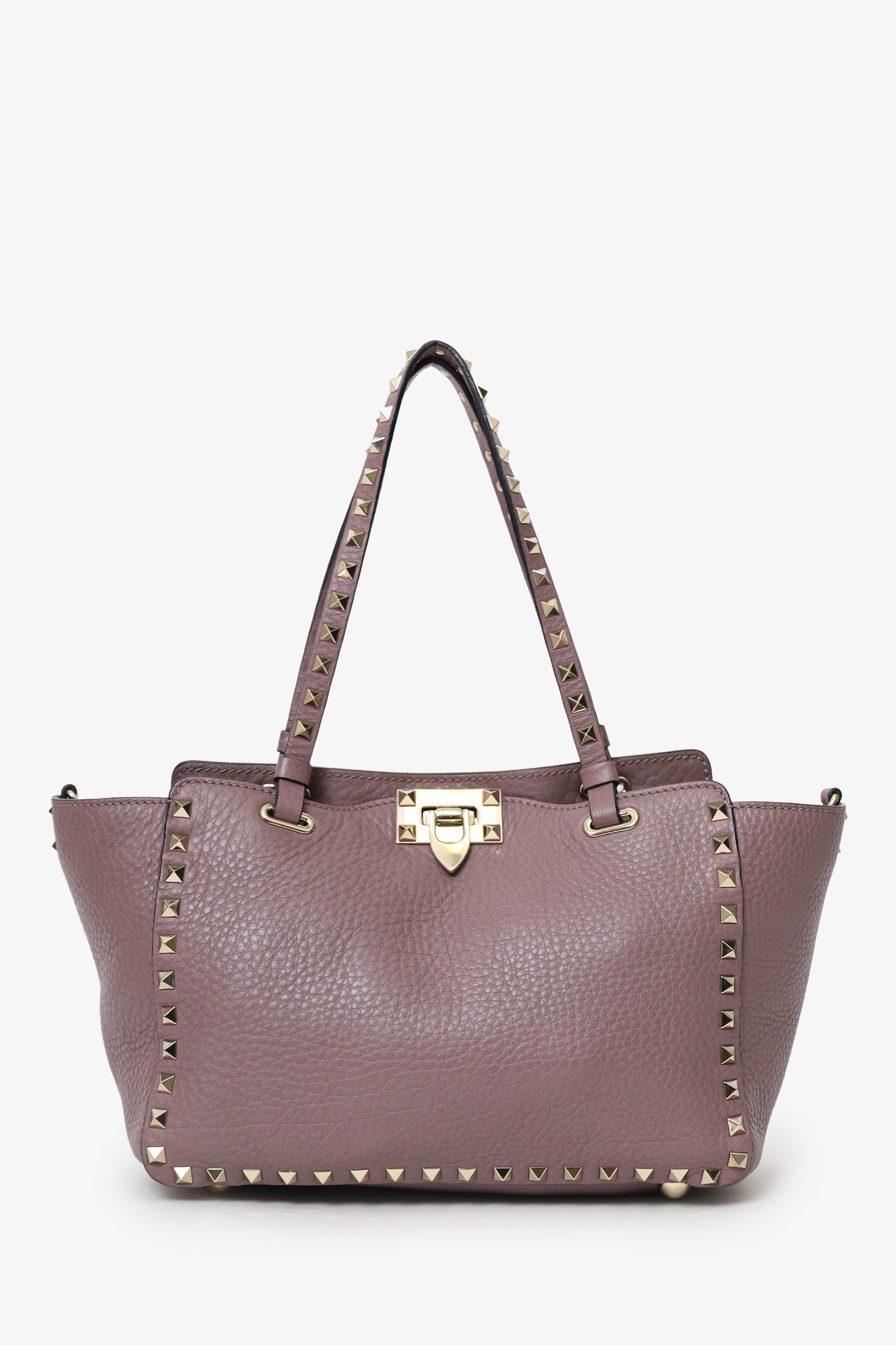 Valentino Pink Leather Small Rockstud Trapeze Tote With Strap. Front flip-lock closure. Twin top straps. Removable crossbody strap with clasp closure. Protective base studs. Suede lined interior. Single interior wall zip pocket. Silver-tone hardware. Tonal stitching.