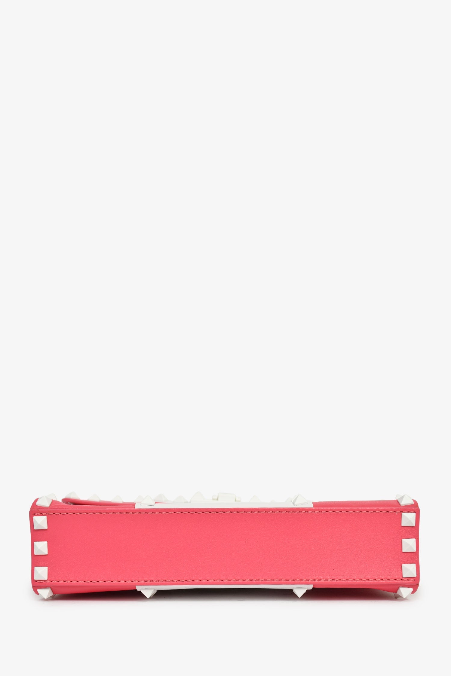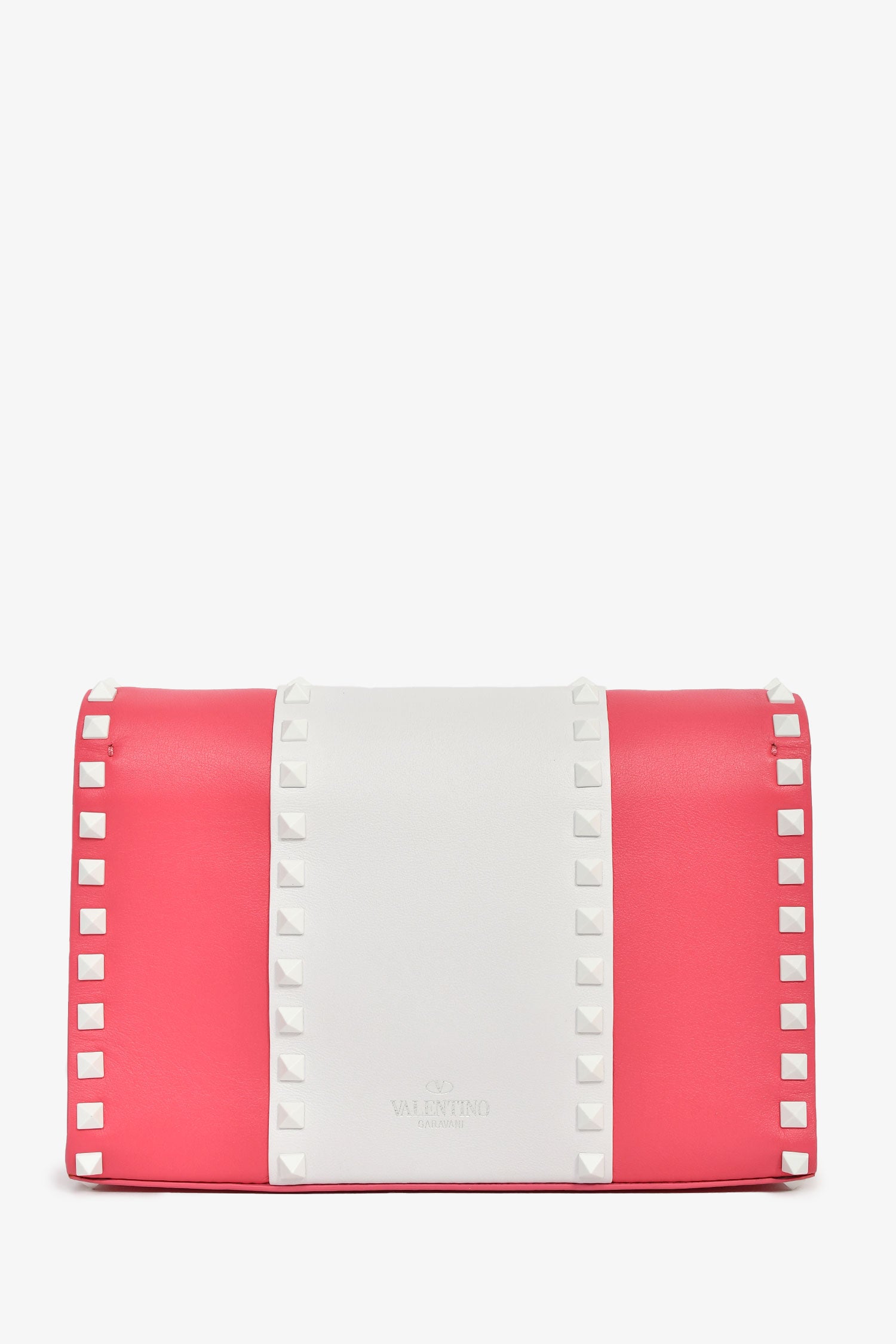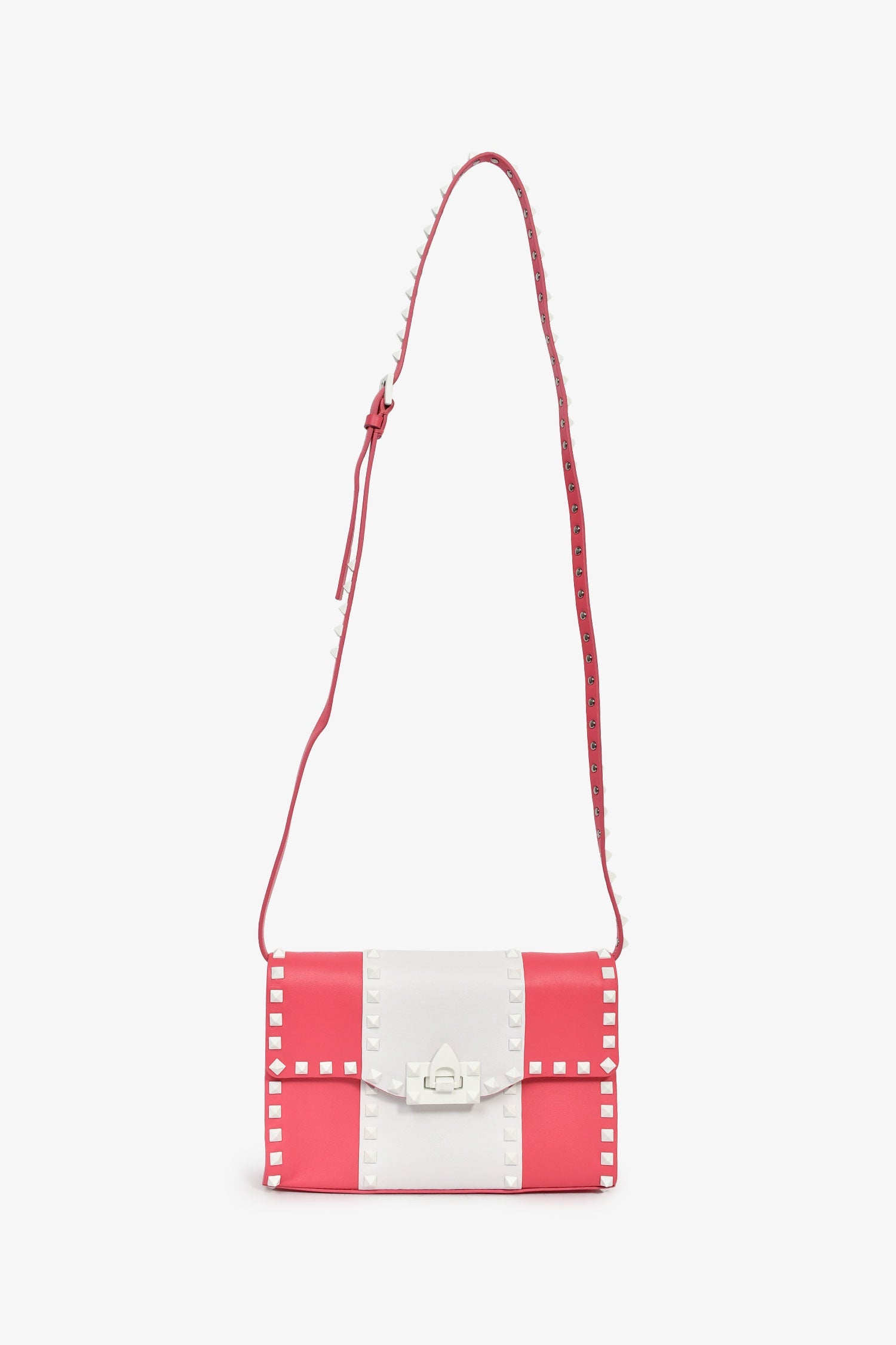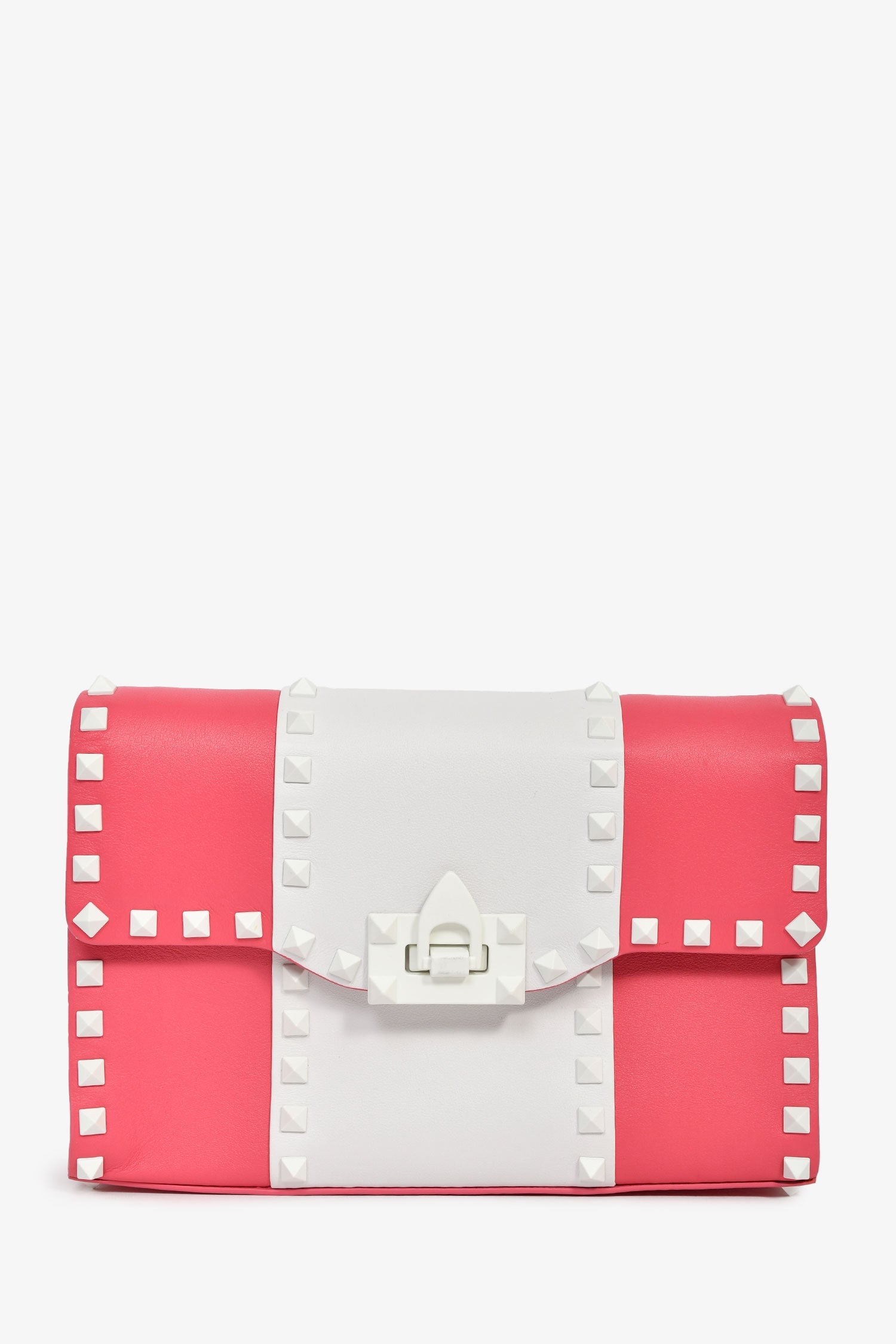 Valentino Pink/White Calfskin Rockstud Shoulder Bag. Fold-over flap with a flip-lock closure. Adjustable crossbody strap. 2 interior compartments: 1 main and 1 slip. White-tone and silver-tone hardware. Tonal stitching.