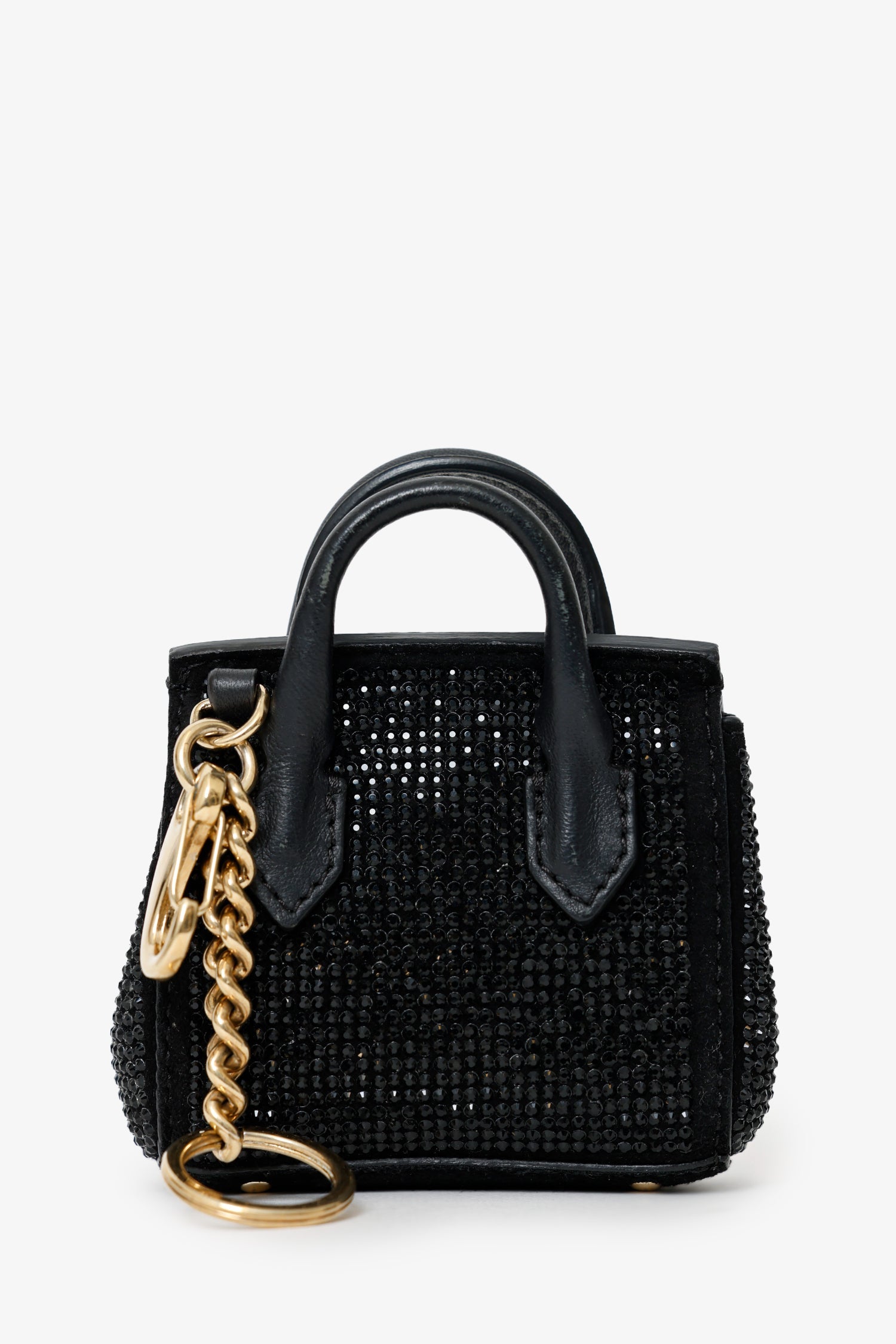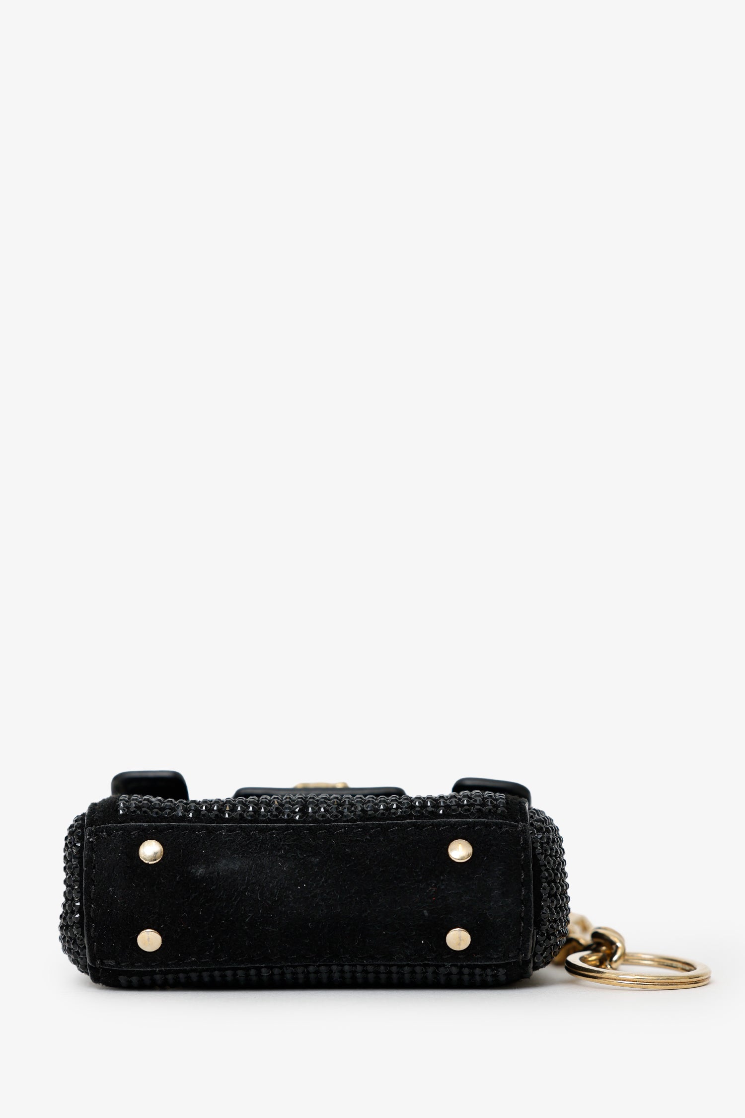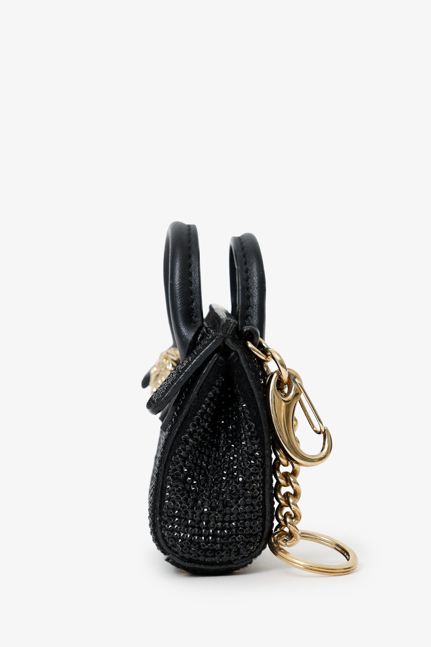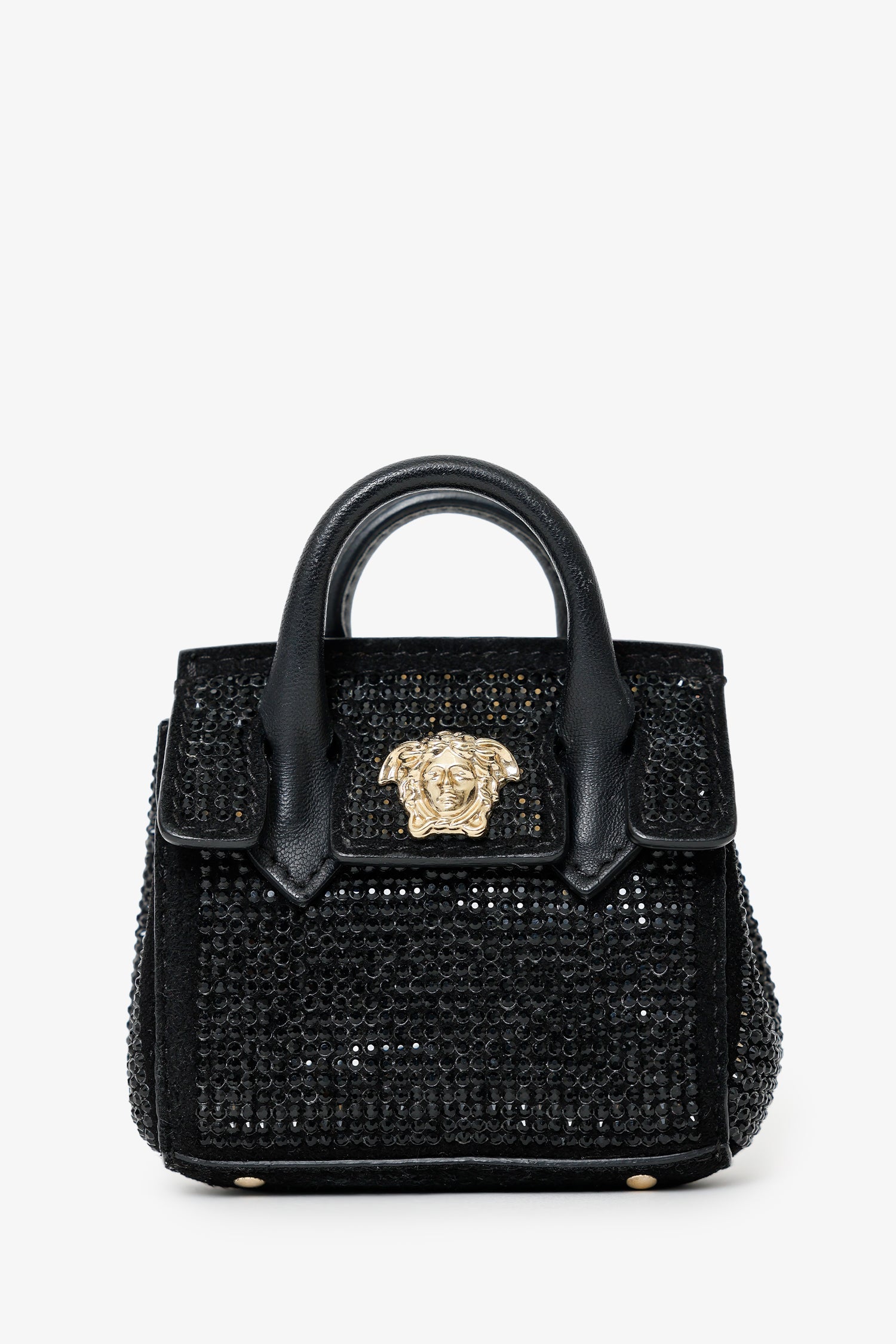 Versace Black Crystal Embellished Medusa Key Pouch. Front-fold-over-flap with snap-button-up closure. Lobster clasp and keyring. Leather-lined interior. Gold-tone hardware. Tonal stitching.