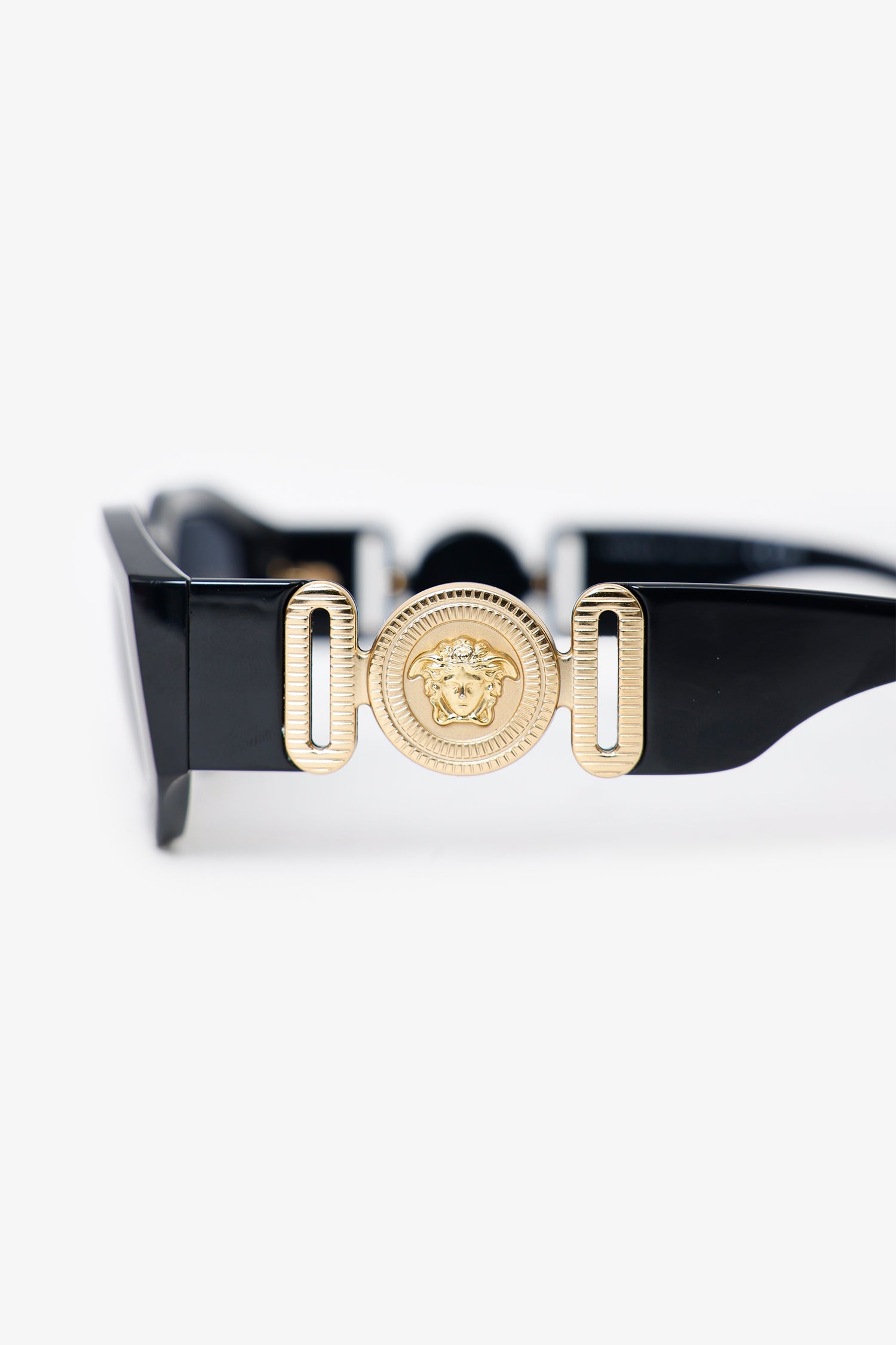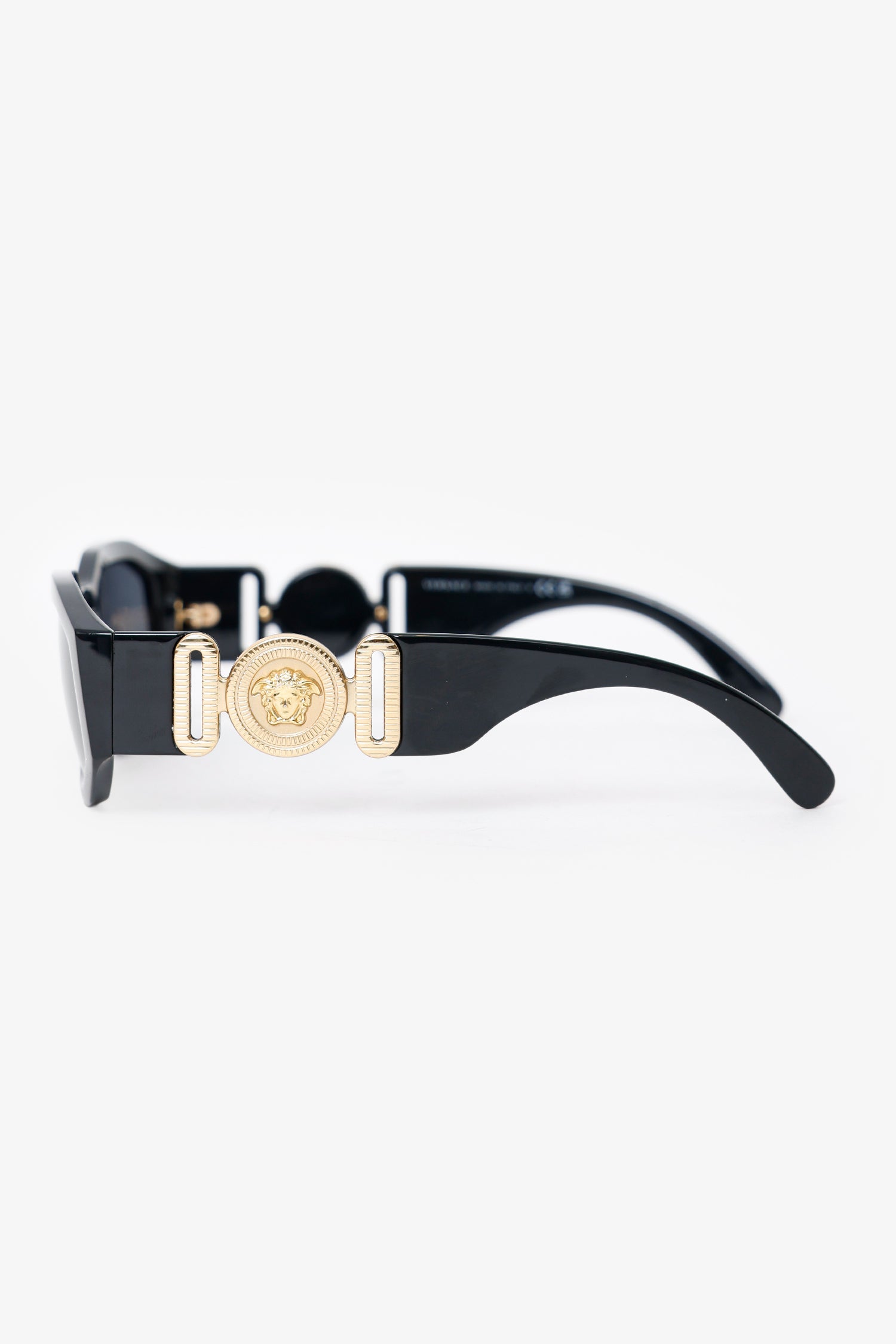 Versace Black Frame Medusa Sunglasses. Built-in nose pads. Gold-tone hardware.