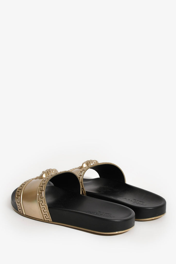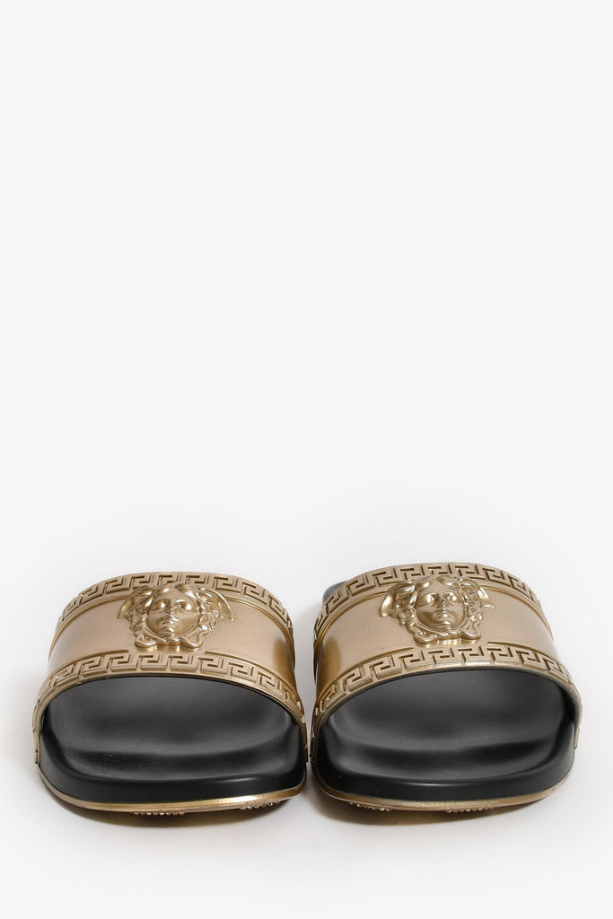 Versace Bronze Rubber Medusa Pool Slides. Rounded, open toe. Rubber vamp and soles. Tonal stitching.