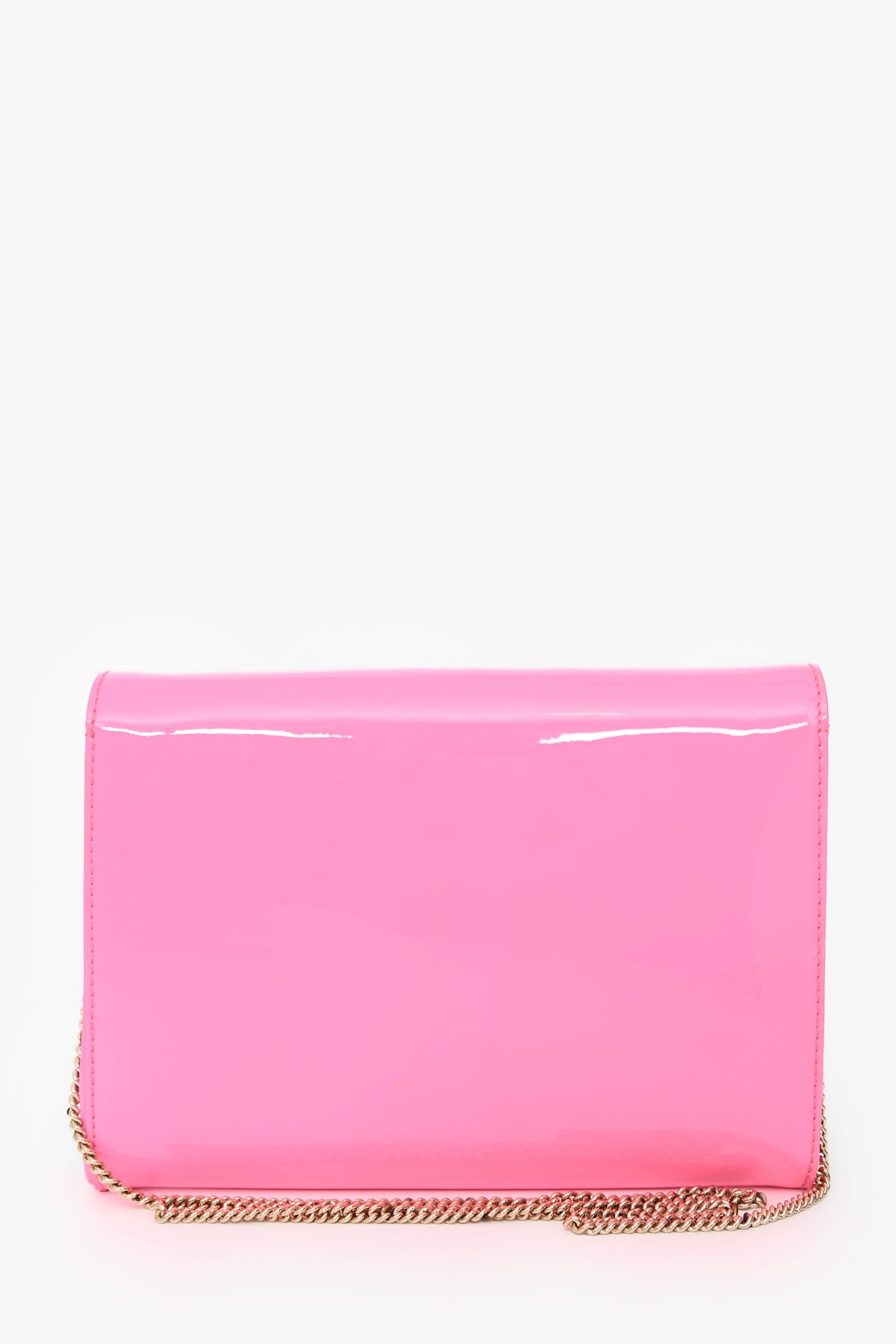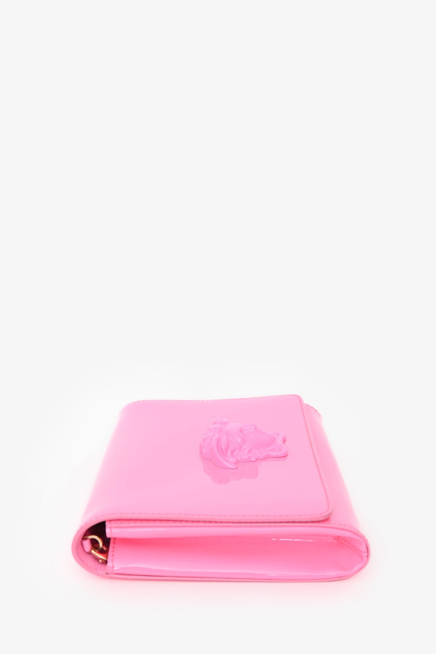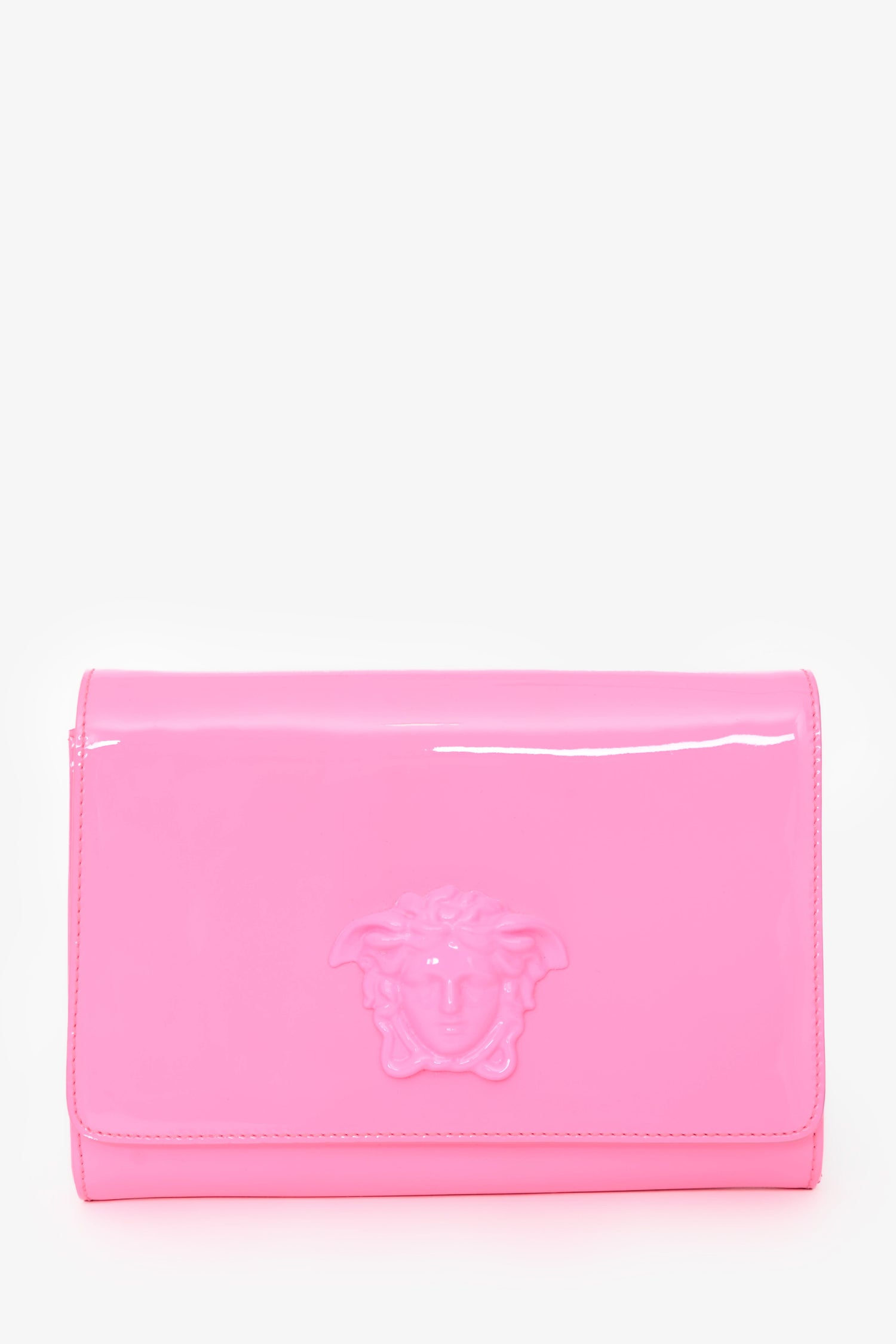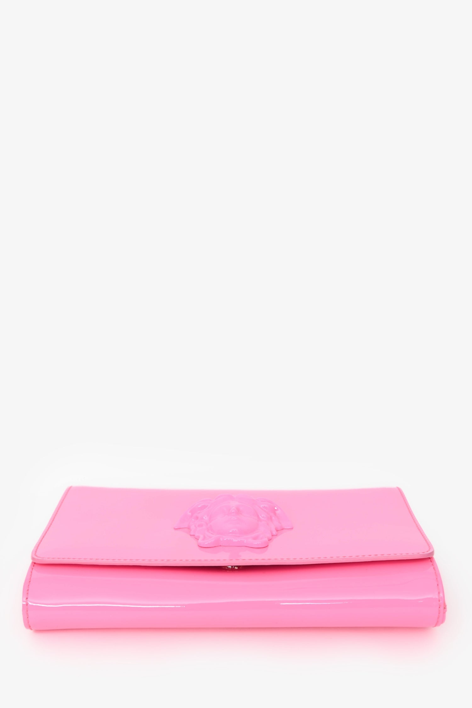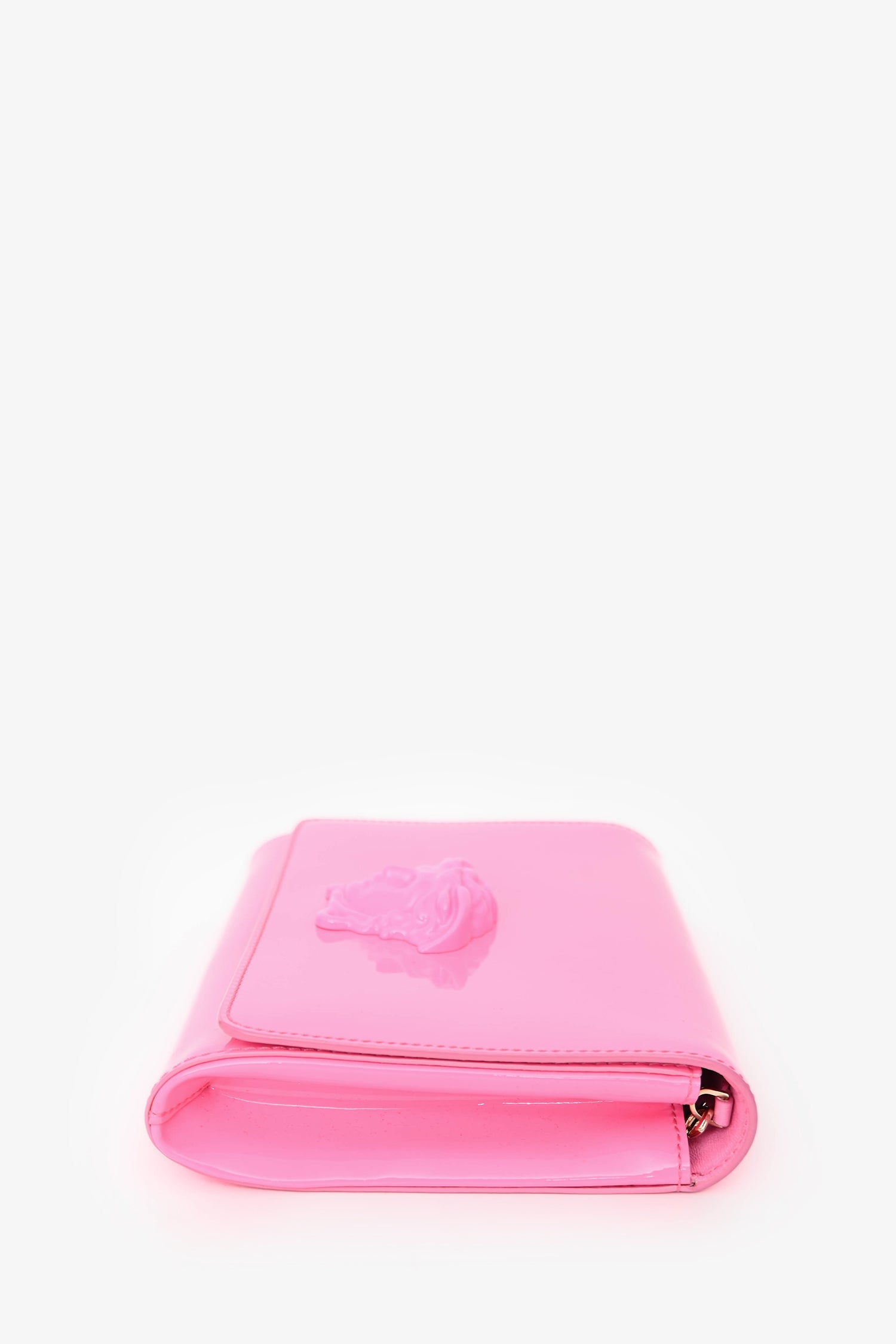 Versace Hot Pink Patent Leather Medusa Clutch with Chain. Front fold-over flap with snap button closure. Detachable chain link strap. Single wall slip pocket on the interior. Fabric-lined interior. Gold-tone hardware. Tonal stitching.