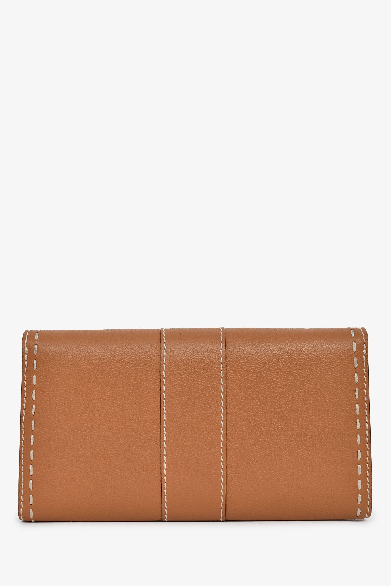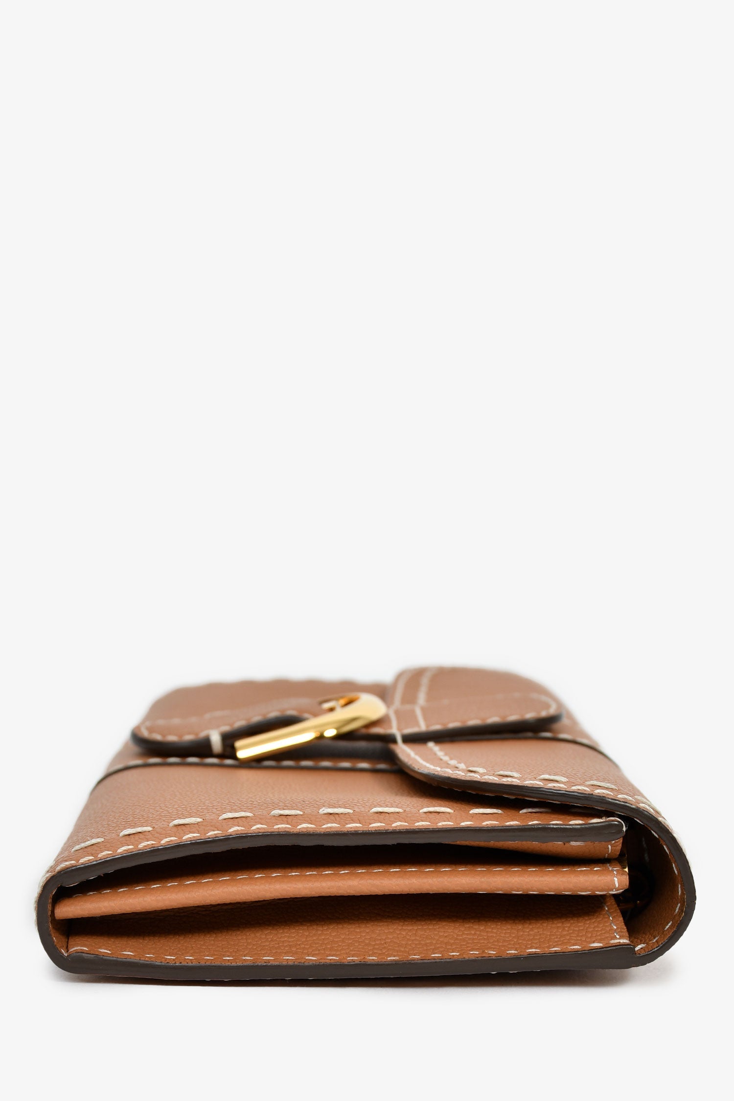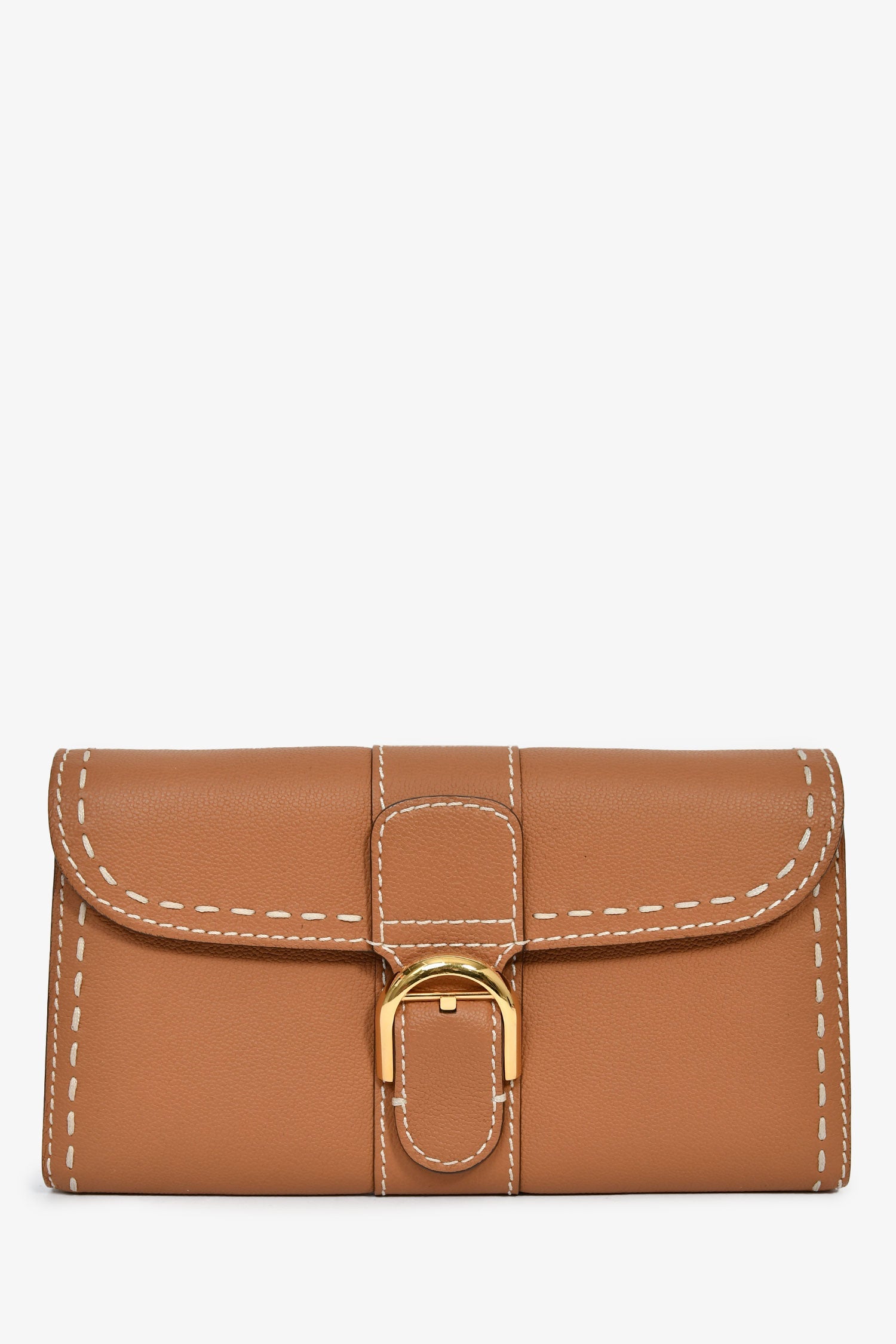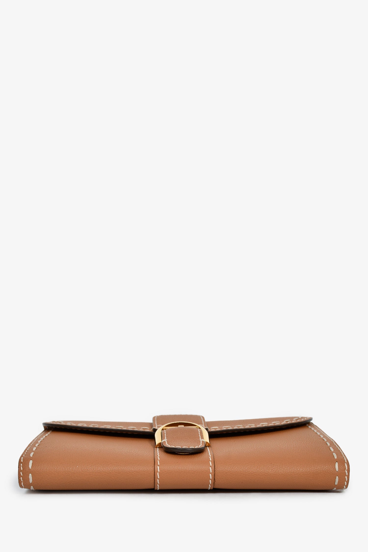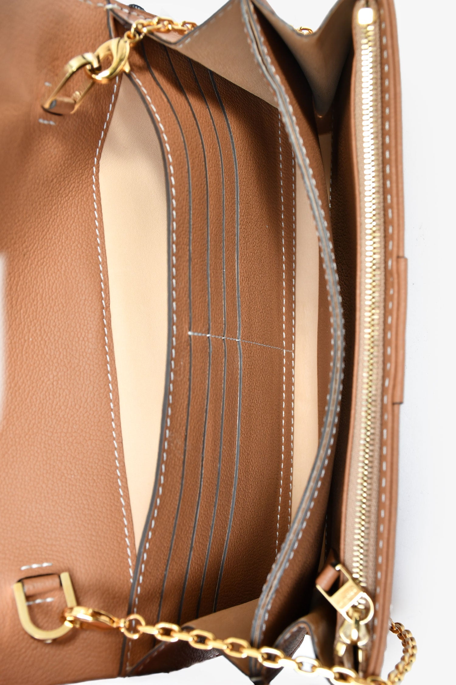 Delvaux Brown Rodéo Calf Brillant Long Wallet Chain. Fold-over flap with a magnetic closure. Chain-link crossbody strap. 4 interior compartments, 1 zip, and 8 card slots. Gold-tone hardware. Contrast stitching.