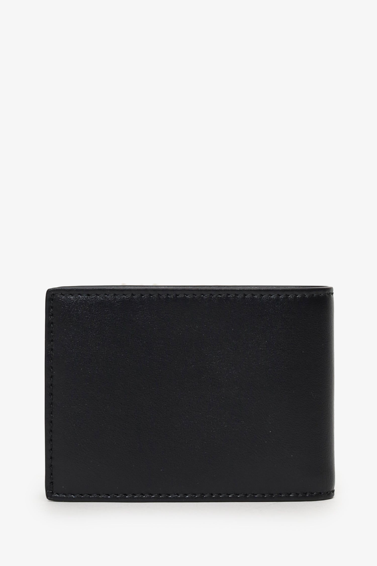 Gucci Black Leather Bi-Fold Wallet. Side fold-over flap. Leather-lined interior with 7 pockets; 4 card slots, 2 slip, and 1 bill. Tonal stitching.