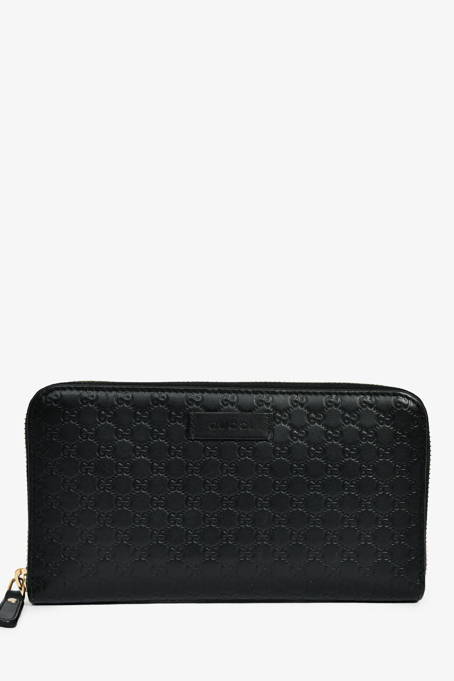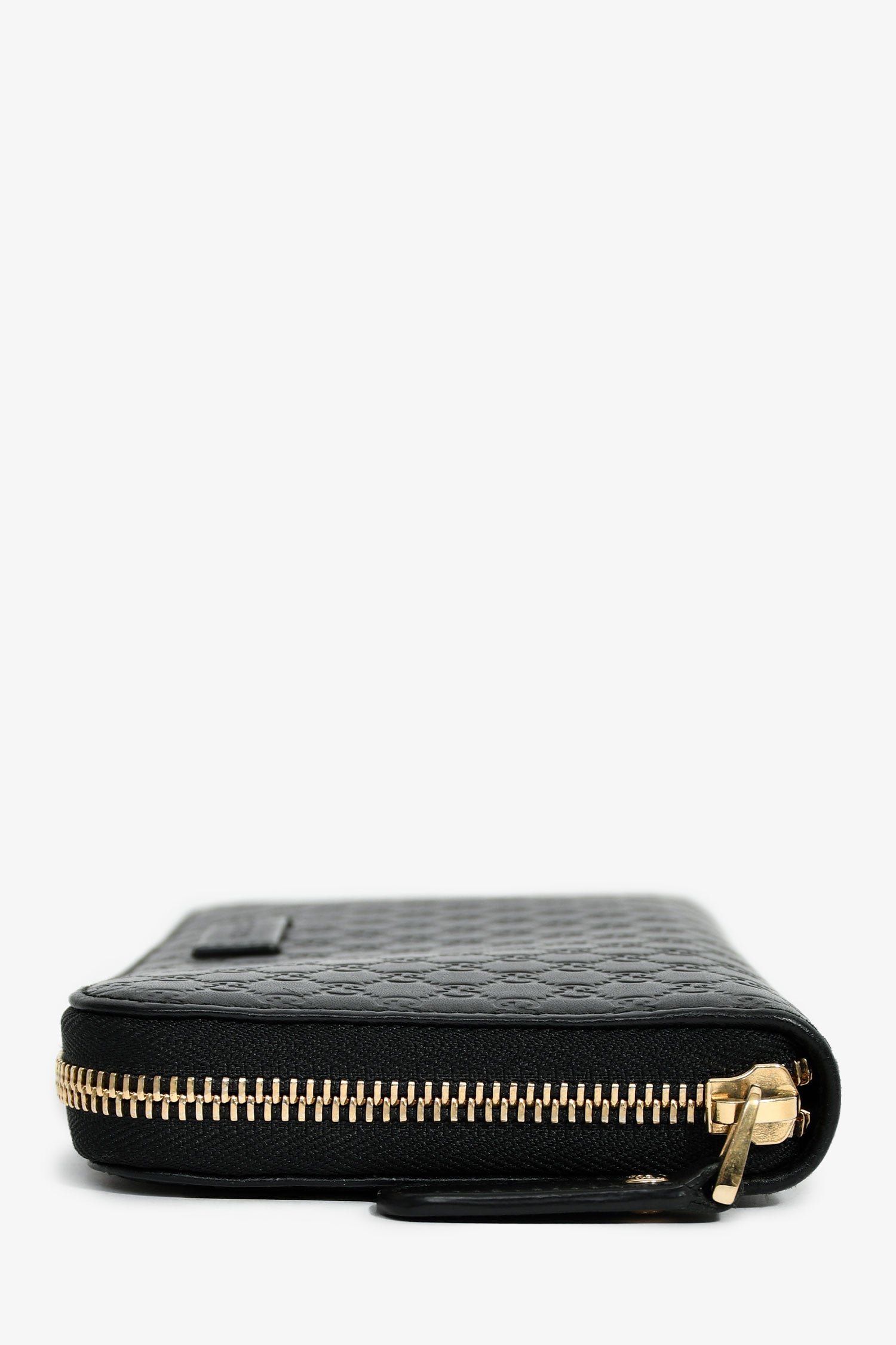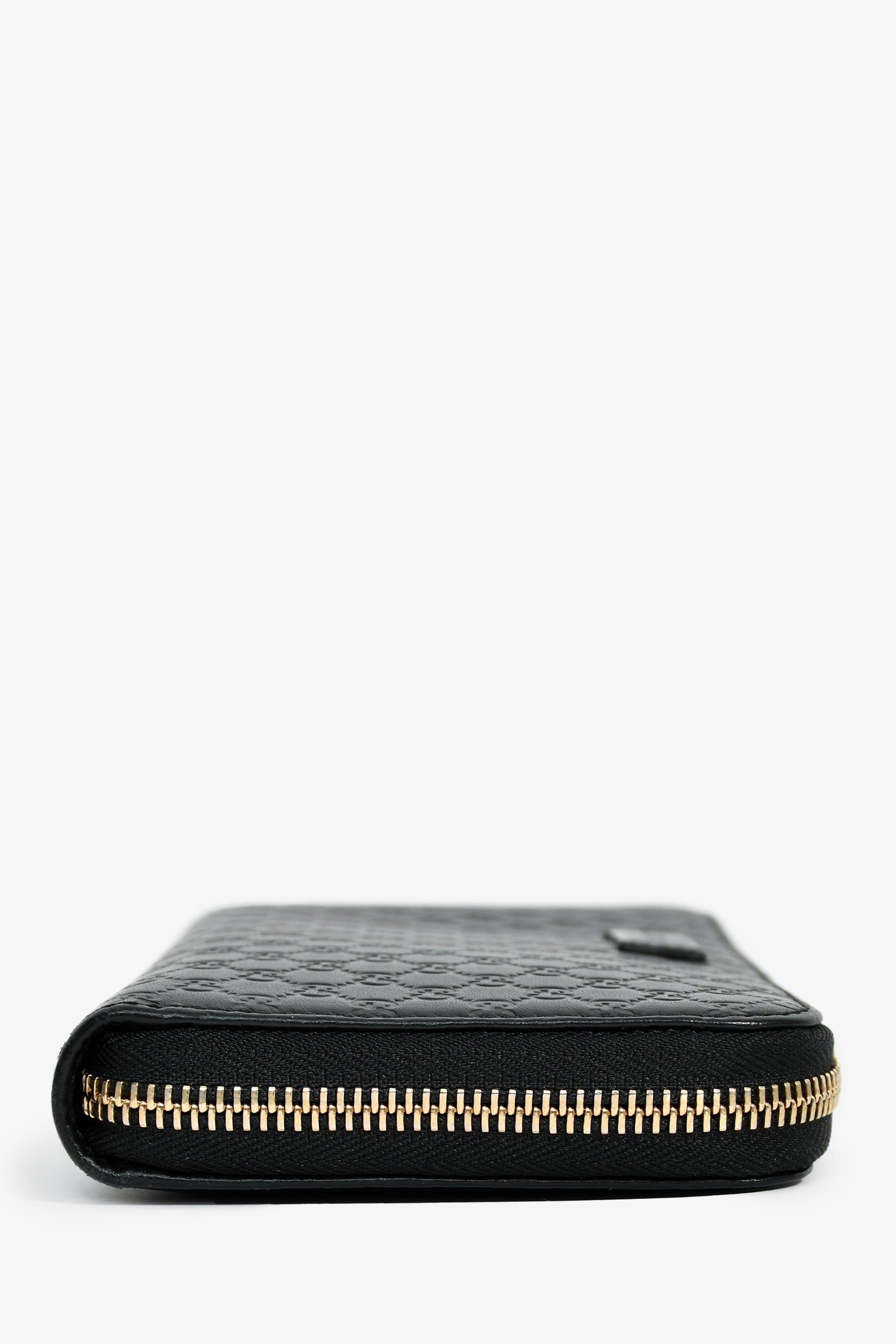 Gucci Black Leather Microguccissima Zip Around Wallet. Zip closure. 2 interior compartments; 1 coin pouch and 12 card slots. Gold-tone hardware. Tonal stitching.