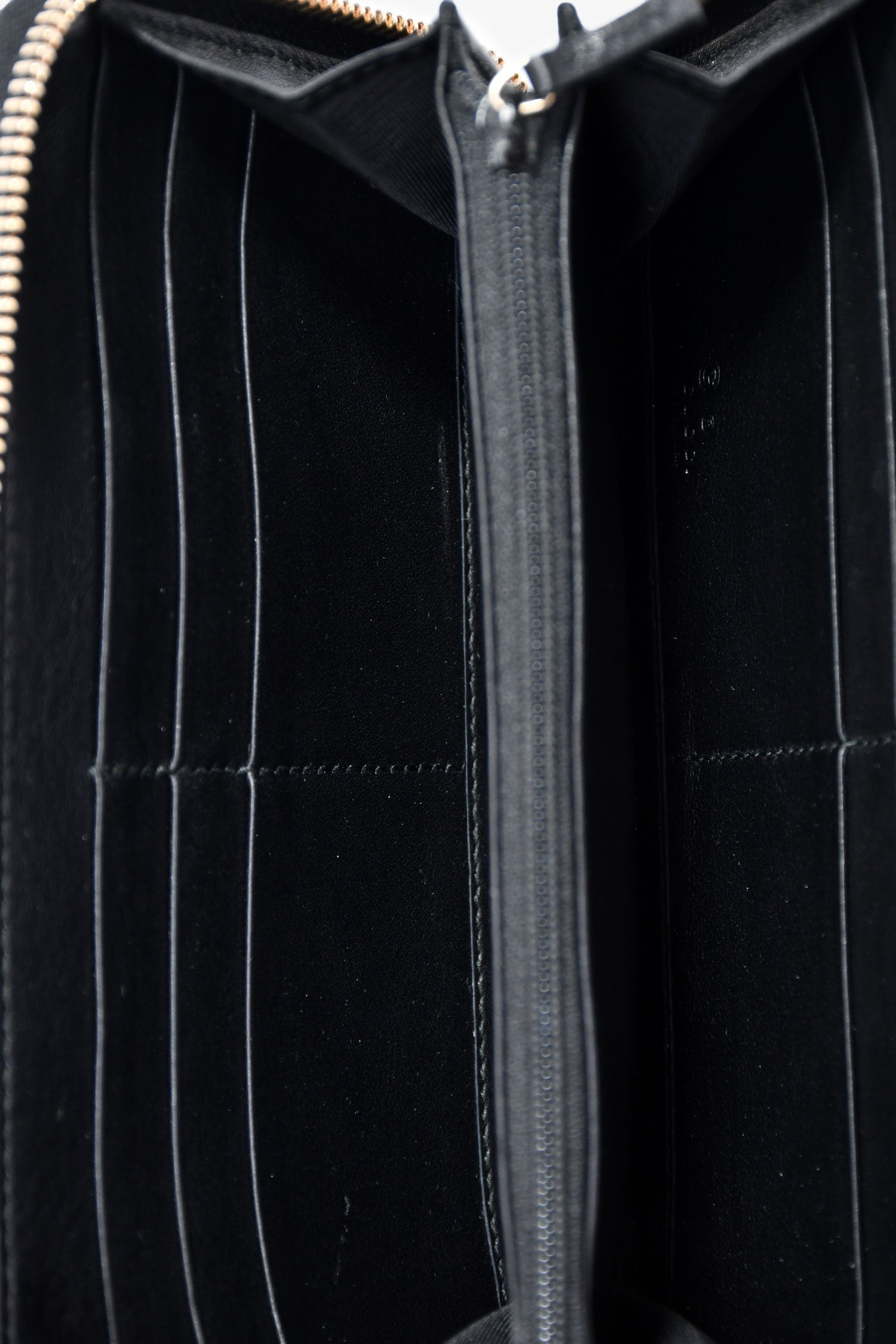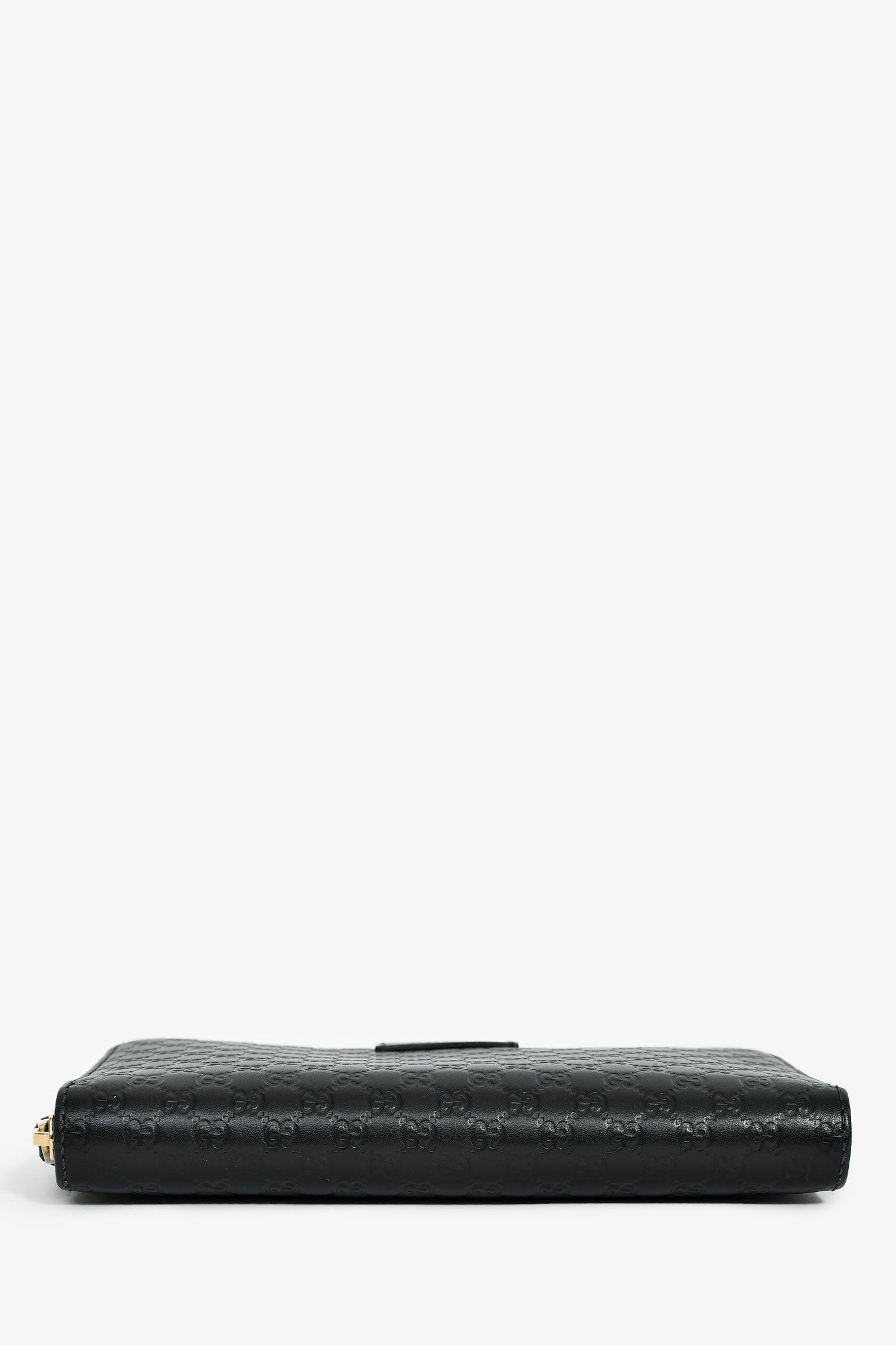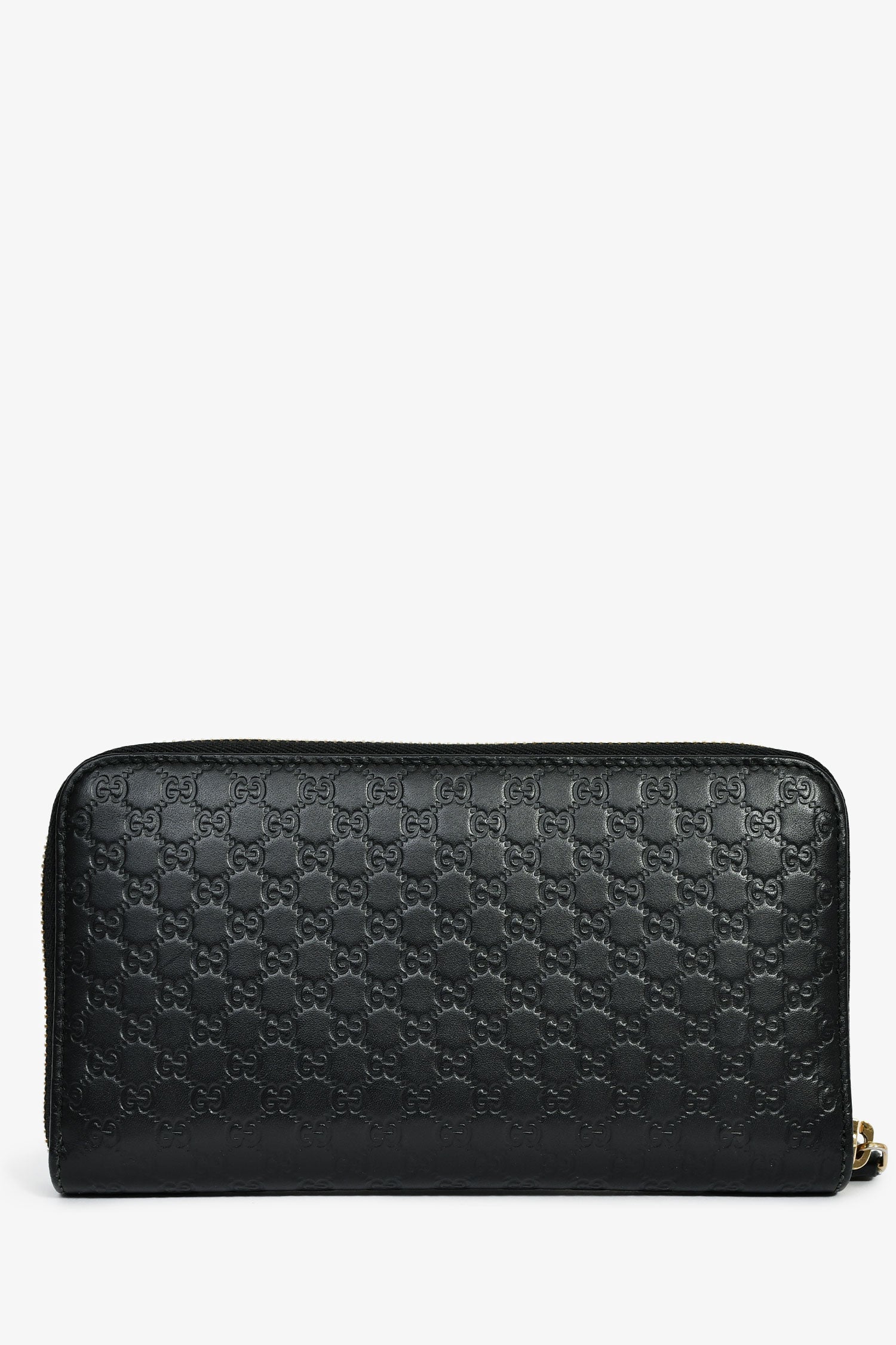 Gucci Black Leather Microguccissima Zip Around Wallet. Zip closure. 2 interior compartments; 1 coin pouch and 12 card slots. Gold-tone hardware. Tonal stitching.