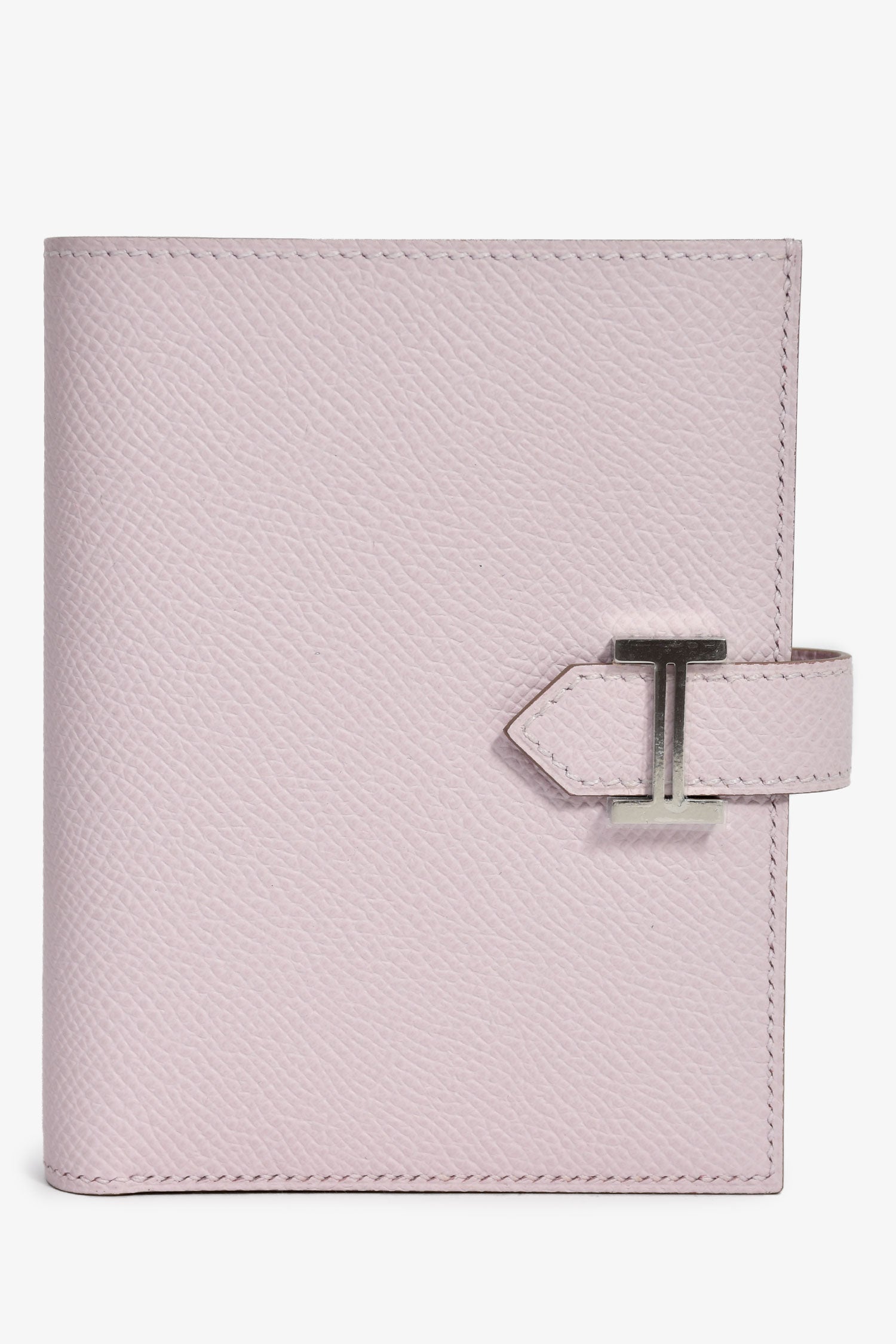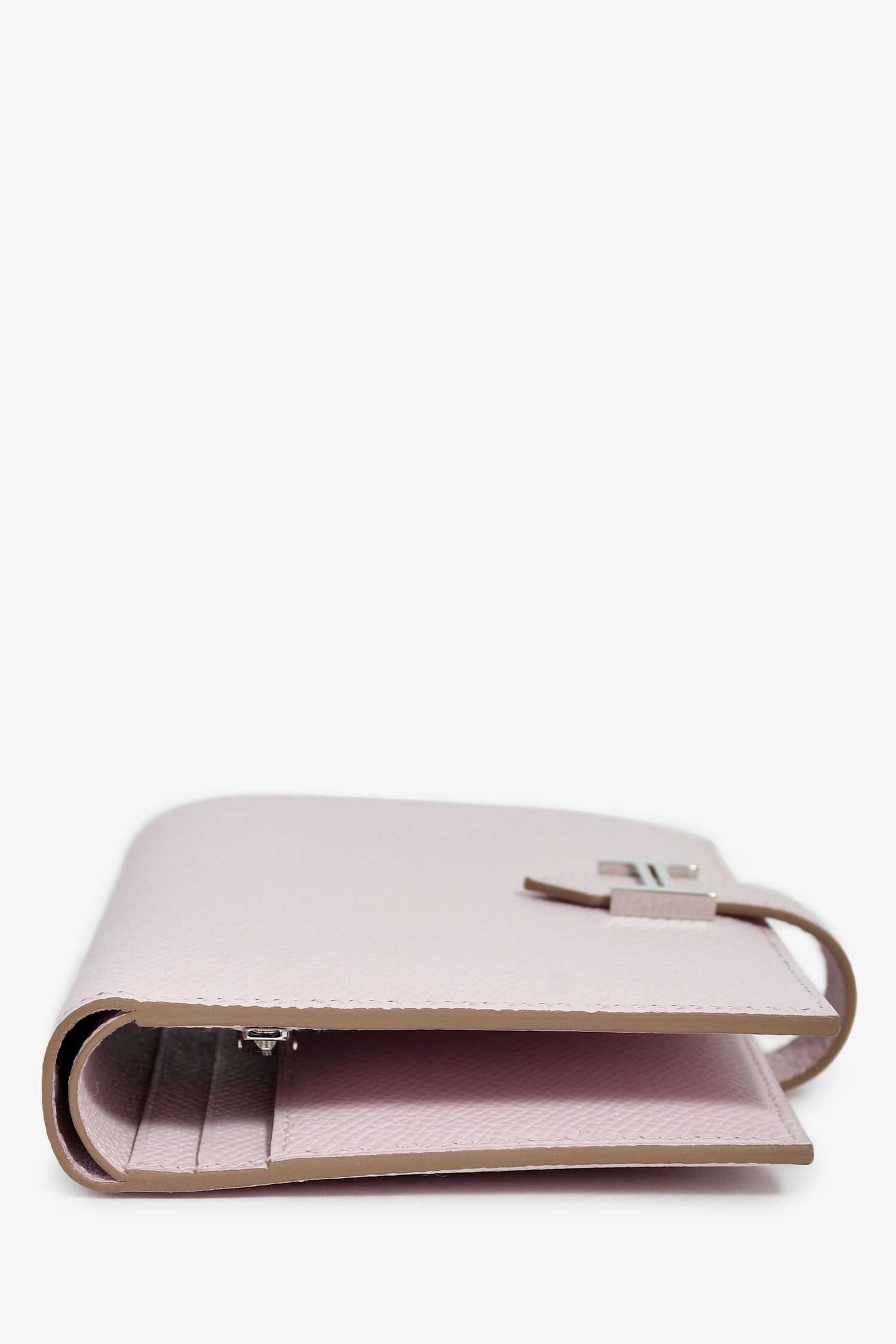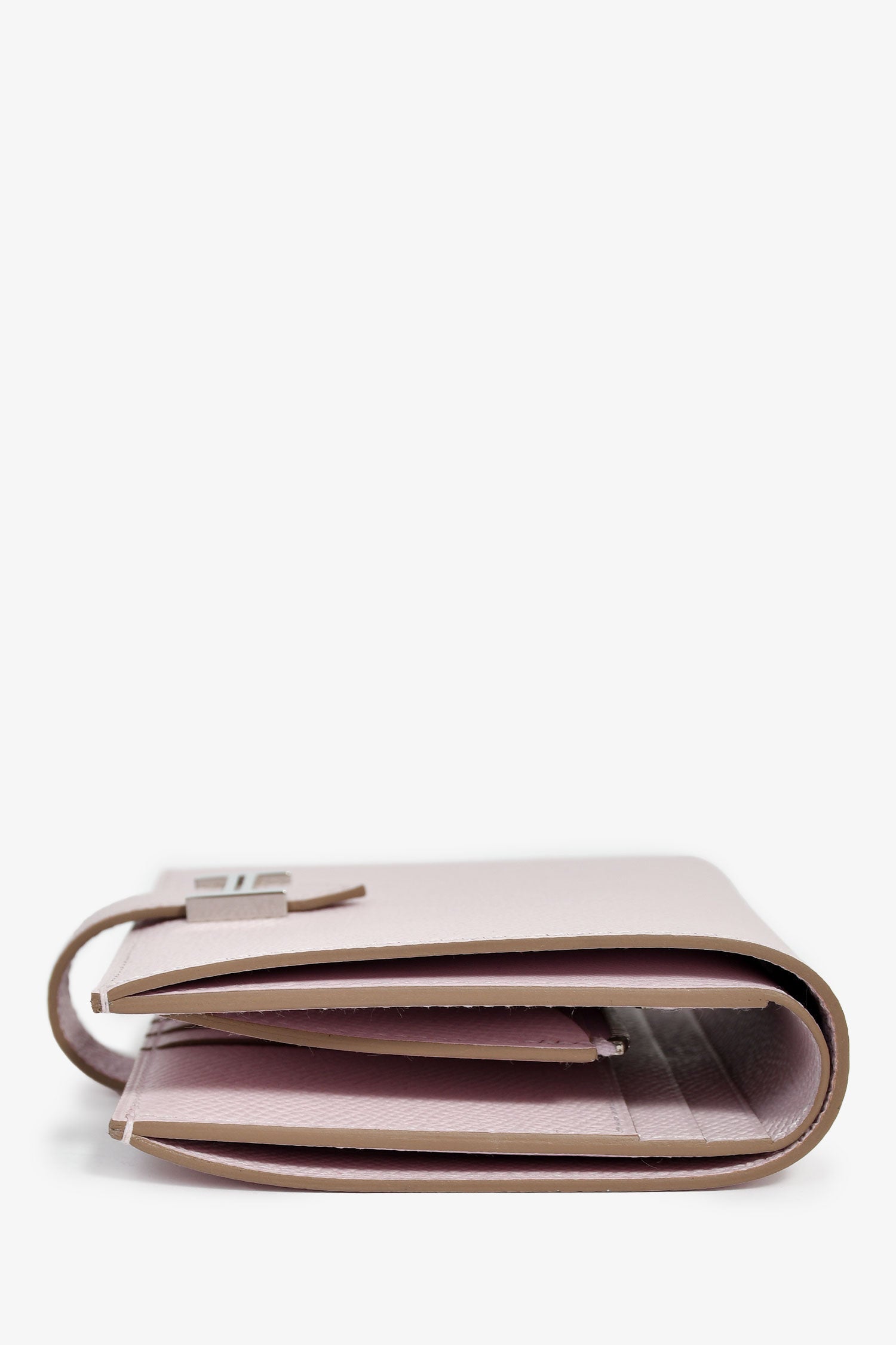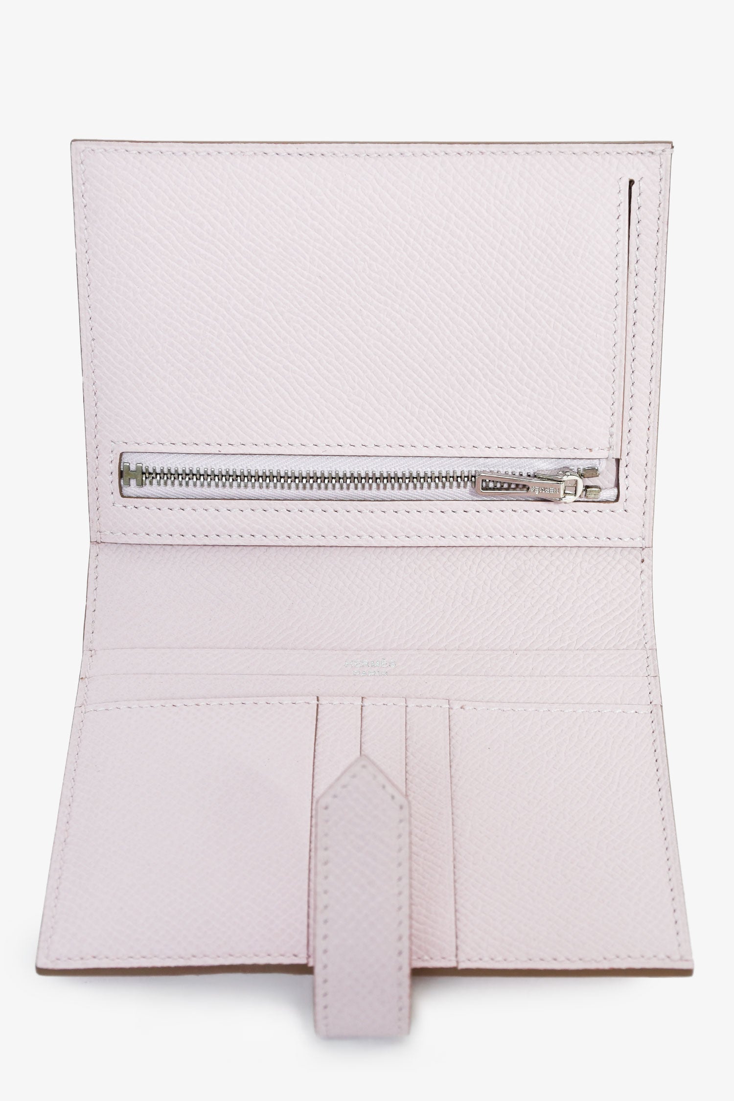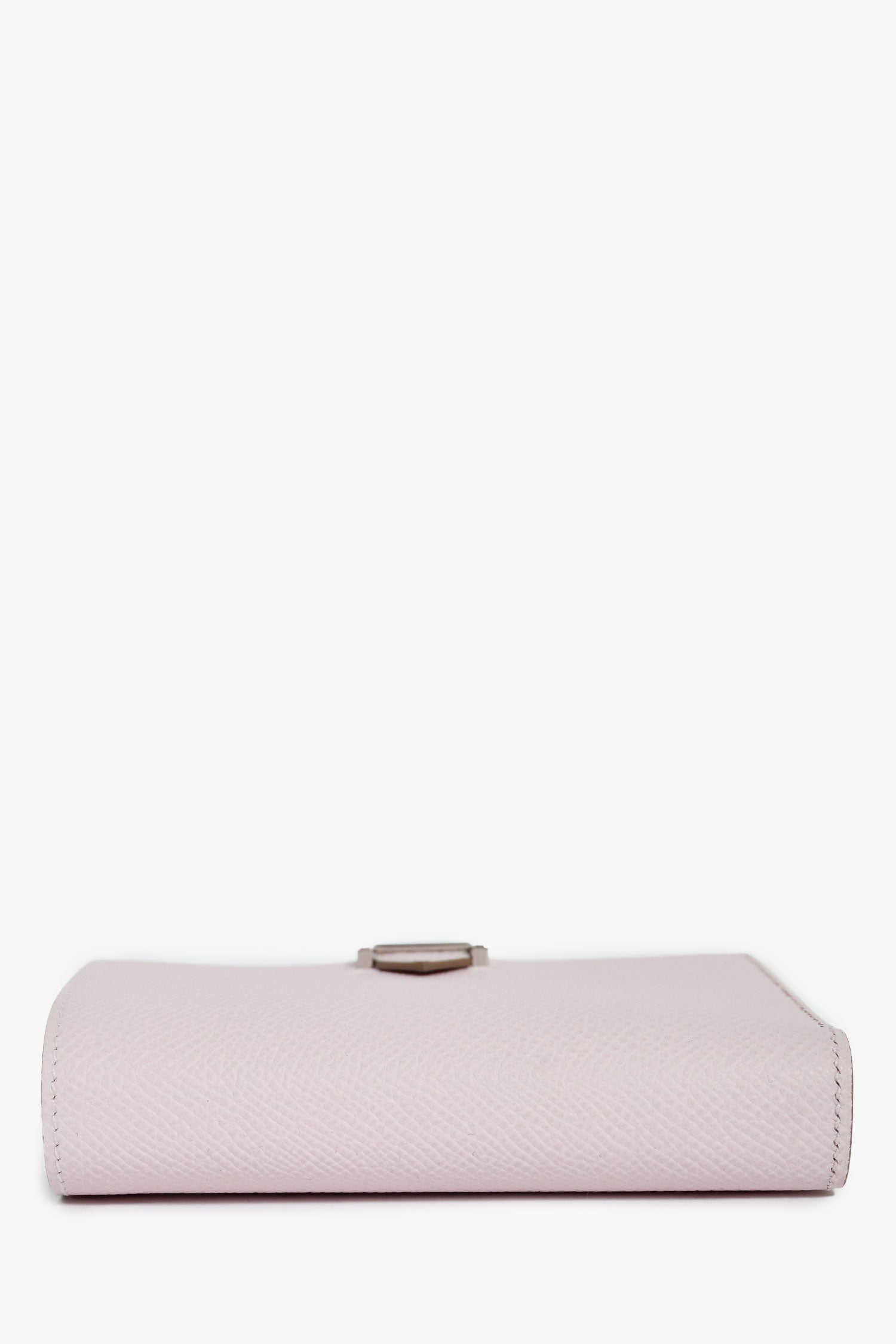 Hermes 2023 Pale Pink Epsom Leather 'H' Bearn Compact Wallet. Bi-fold opening with pull-through strap closure. 10 interior compartments; 1 bill slot, 1 coin pouch, and 8 card slots. Silver-tone hardware. Tonal stitching.