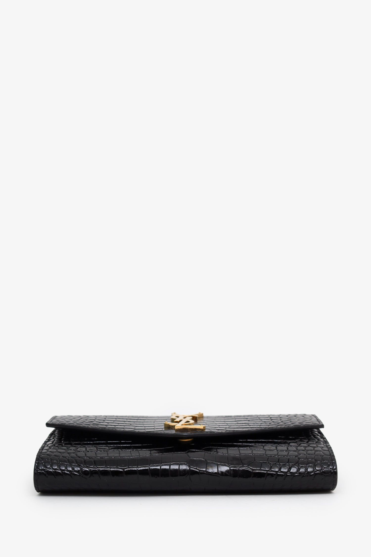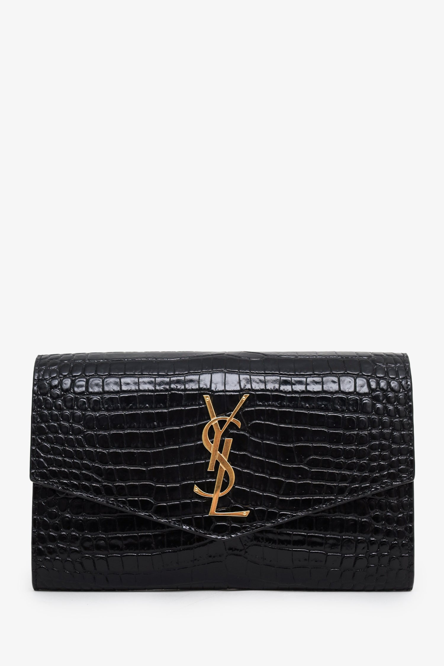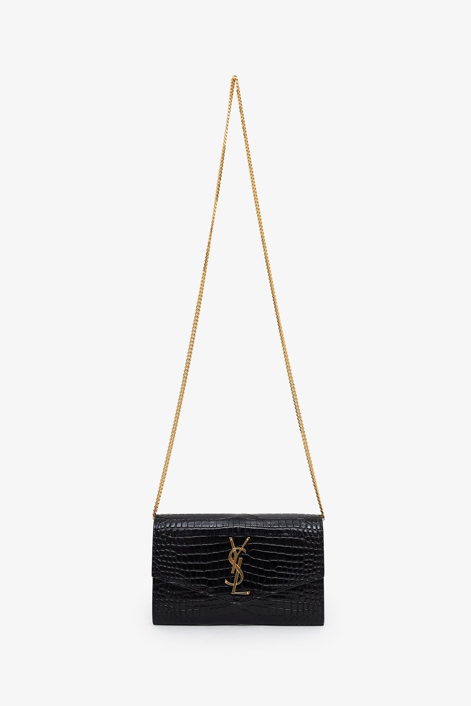 Saint Laurent Black Croc Embossed Leather Uptown Chain Wallet With Insert. Front fold-over flap with snap-button-up closure. Removable chain link crossbody strap with clasp closure. Leather-lined interior with single rear slip pocket. Additional insert with 4 slip pockets. Gold-tone hardware. Tonal stitching.
