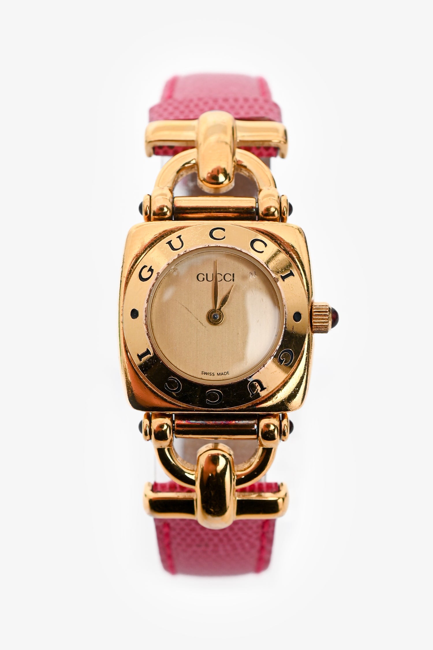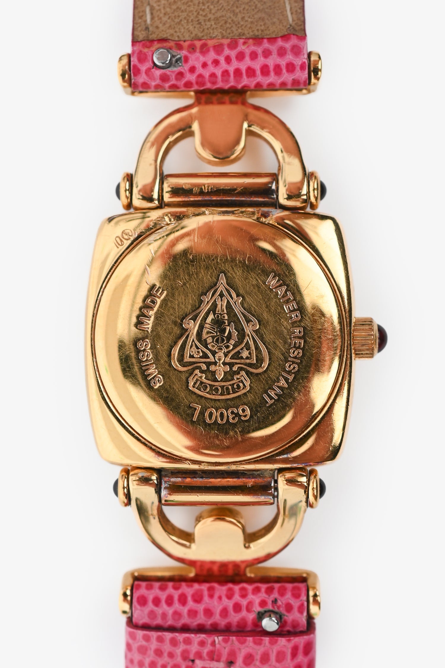 Gucci Vintage Gold Tone Metal/Pink Lizard Embossed Strap Watch