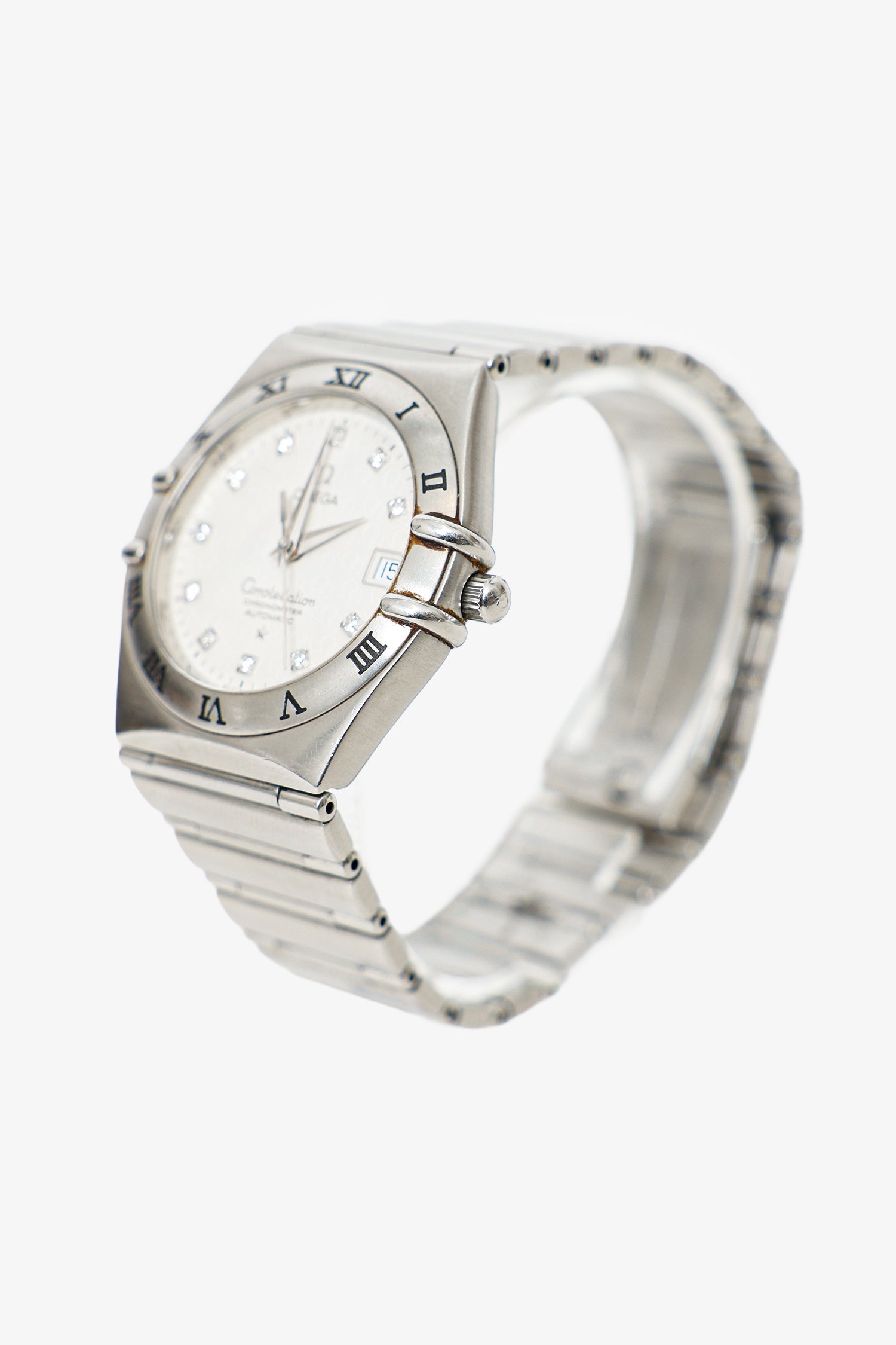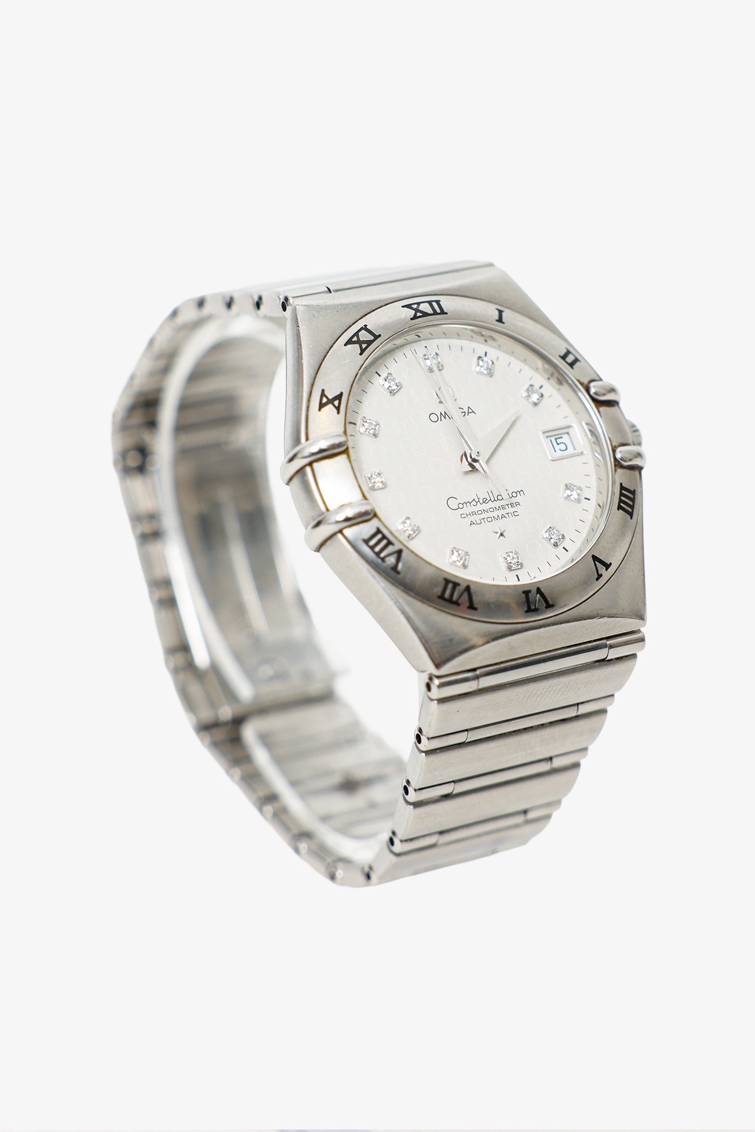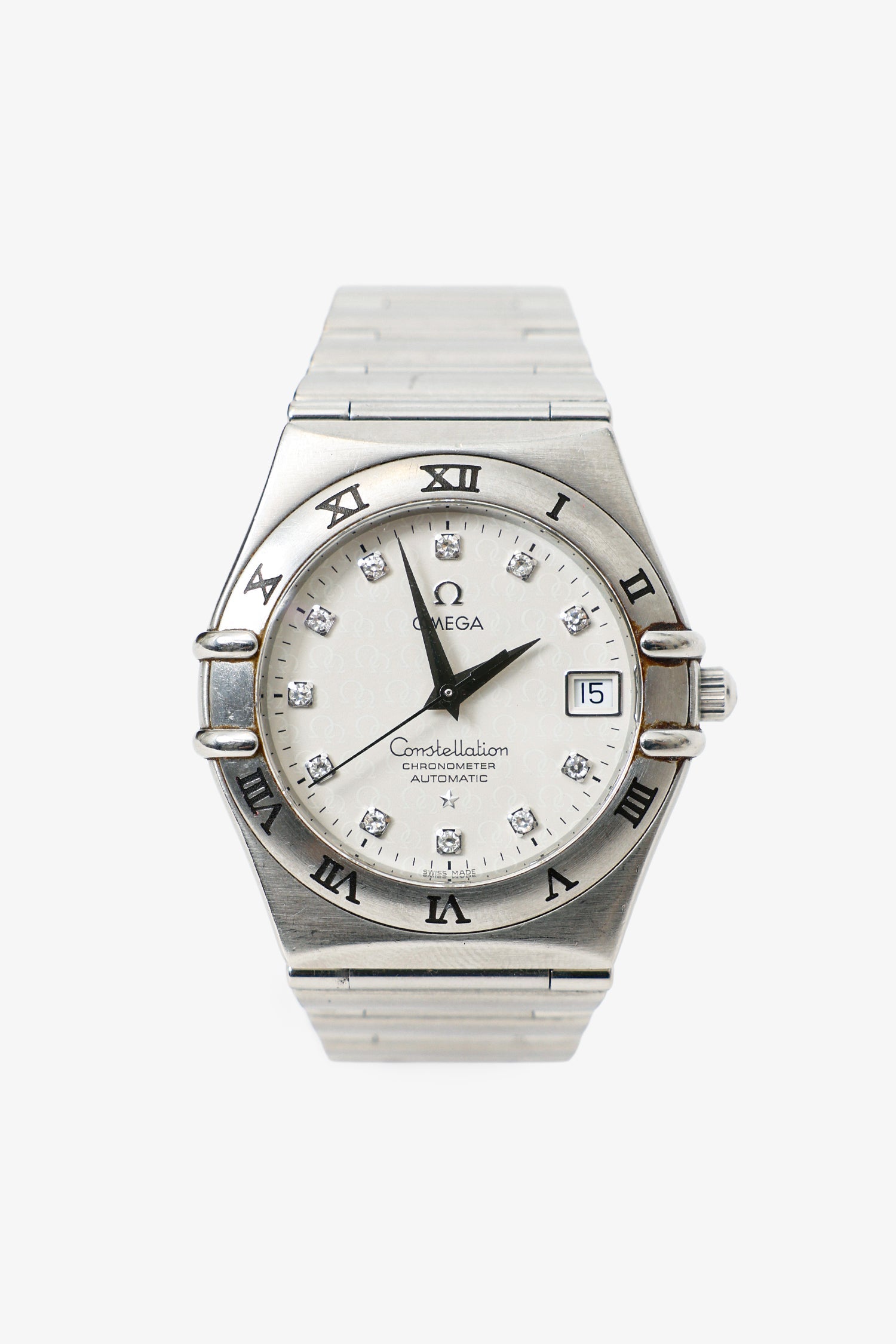 Omega 50th Anniversary Silver Steel Automatic Diamond Constellation Watch 35.5MM. One stainless steel, diamond dial at hour makers. Omega Swiss made. Silver-tone hardware.