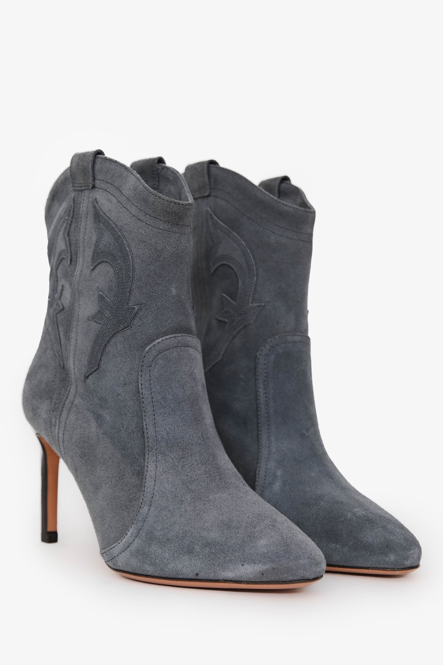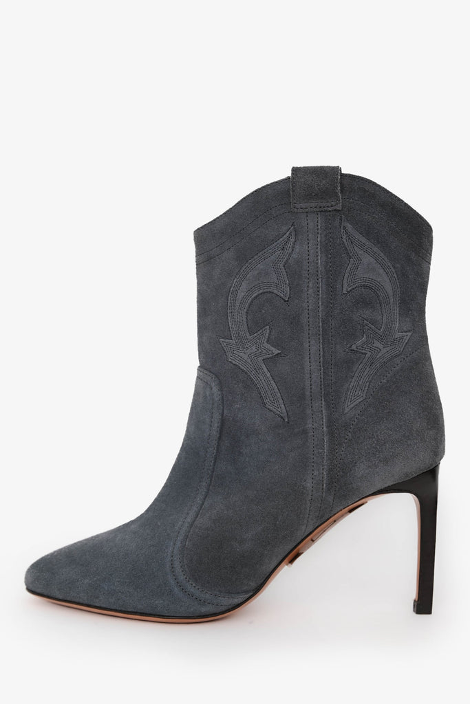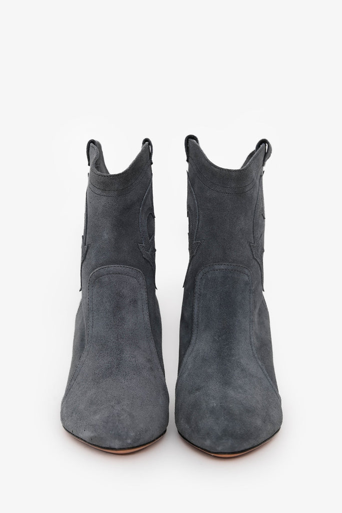Ba&sh Grey Suede Western Ankle Boots. Pull-on. Almond toe. Leather insole. Tonal stitching.