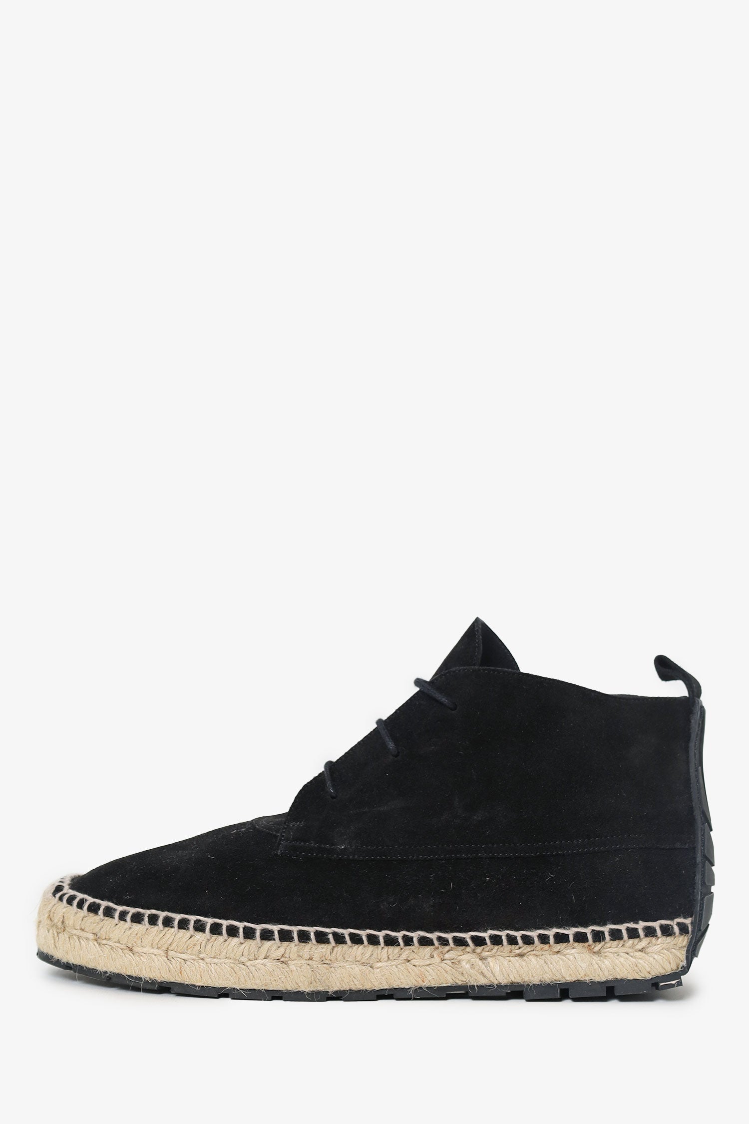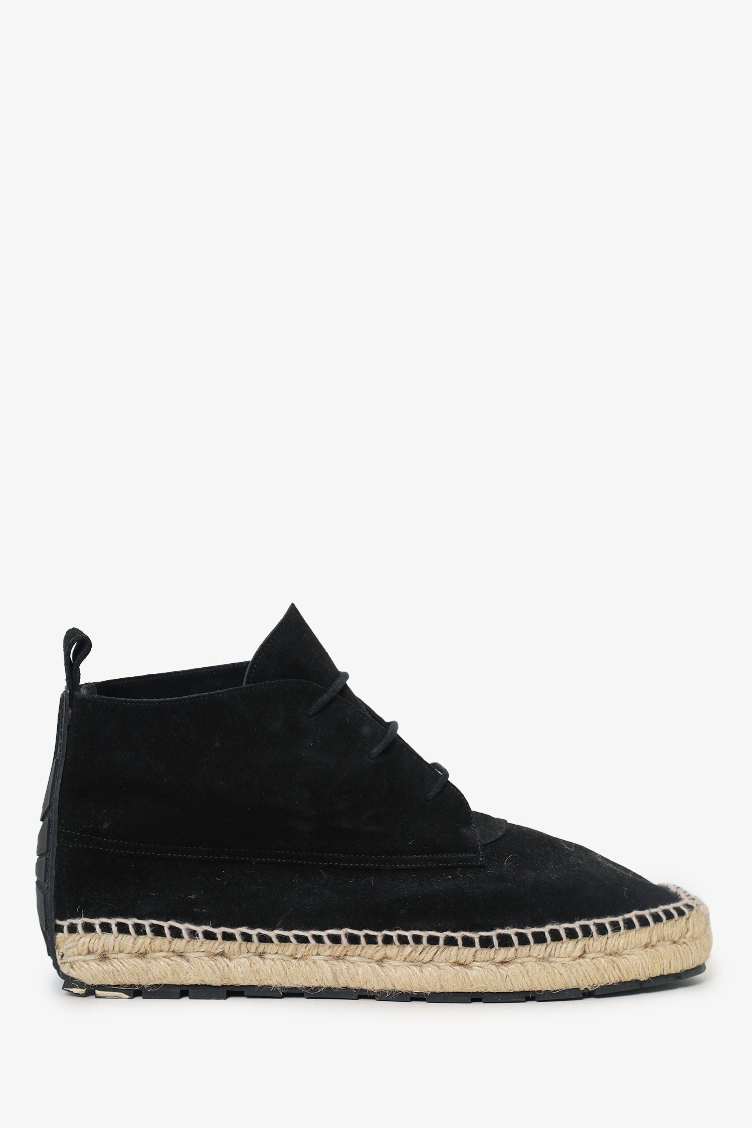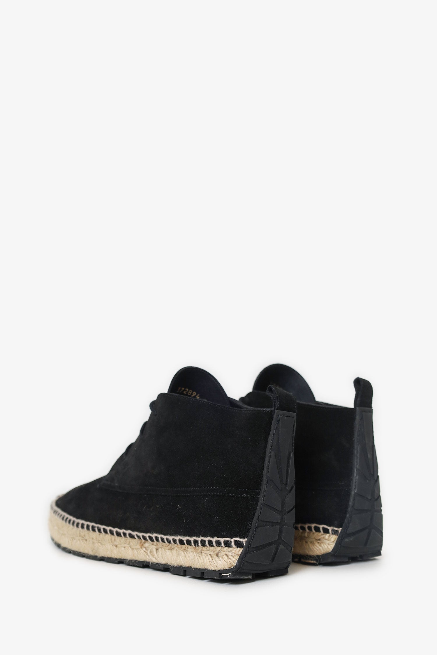 Balenciaga Black Suede Espadrille Boots. Pull-on. Front lace closure. Round toe. Tonal stitching.