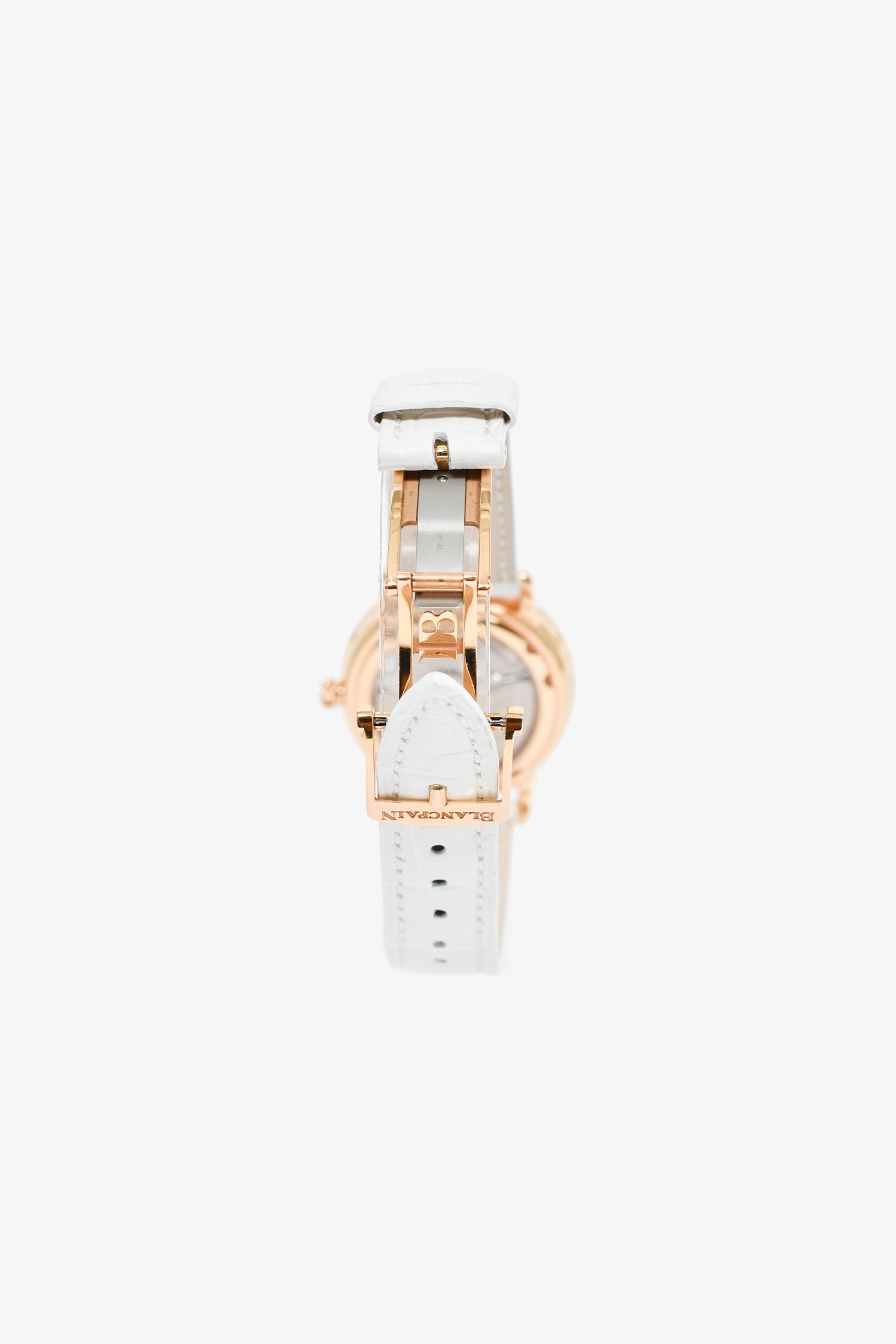 Blancpain 18K Rose Gold/Mother of Pearl/Diamond Set Quantième Complet 35m Watch. Mother of Pearl and diamond dial. 18K Gold case and buckle. Diamond bezel. Leather wristlet. Tonal stitching.