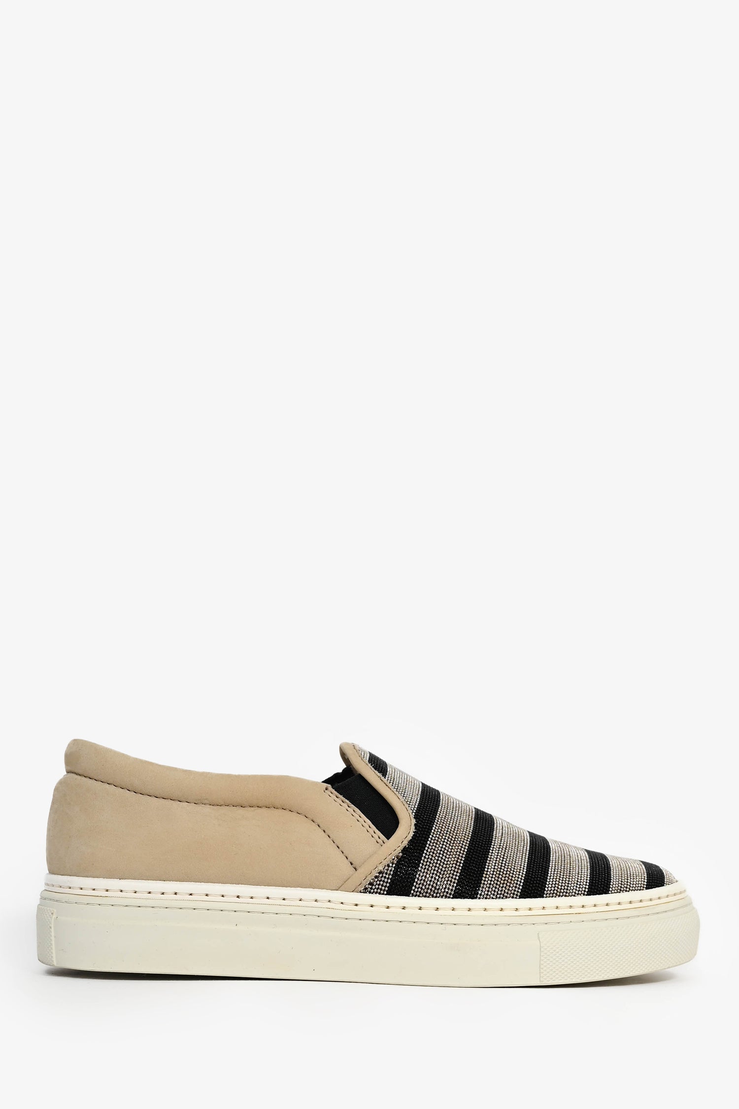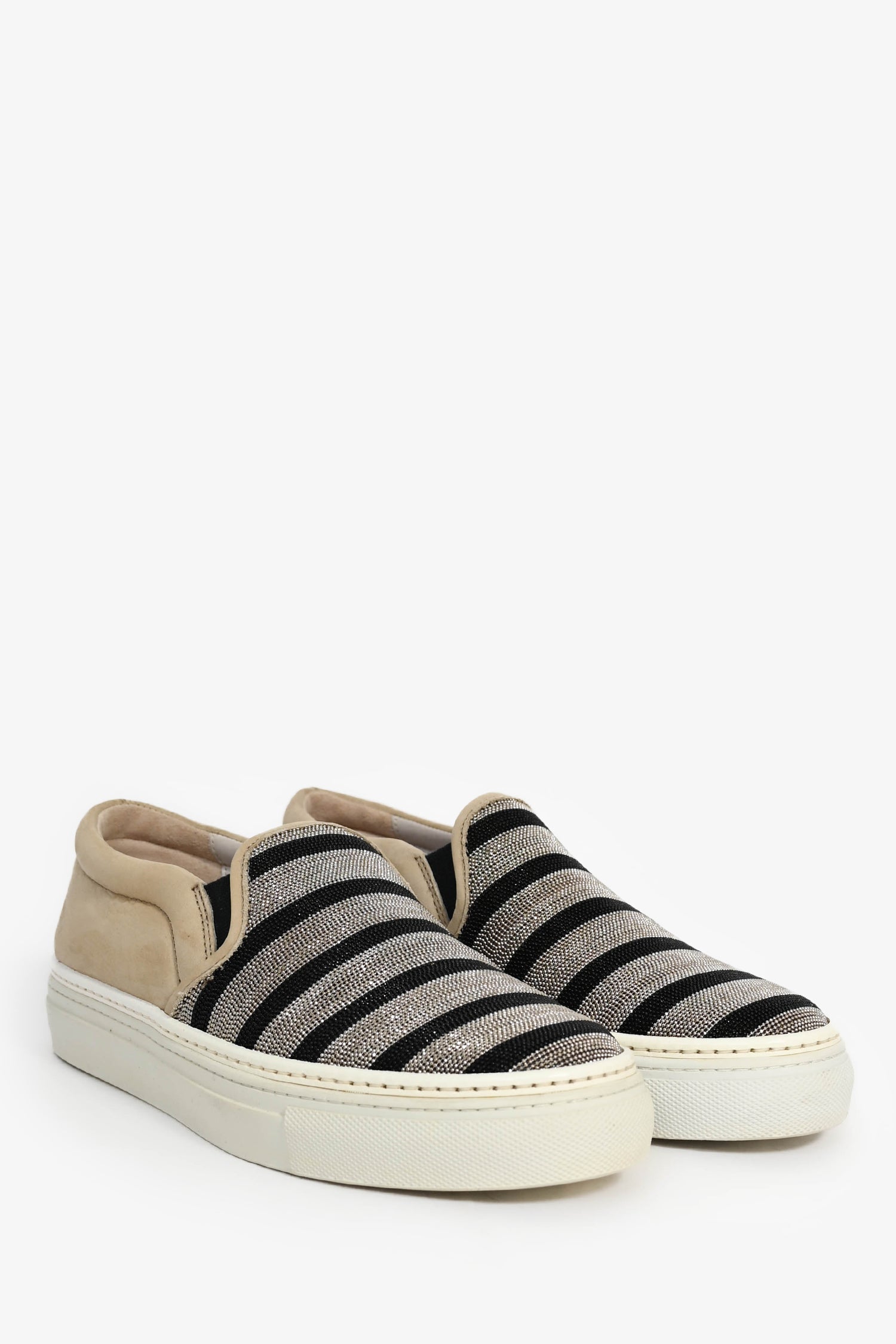 Brunello Cuccinelli Beige Leather/Beaded Slip On Sneakers. Rounded toe. Leather insoles. Beige/navy alternating monili stripes. Rubber soles.