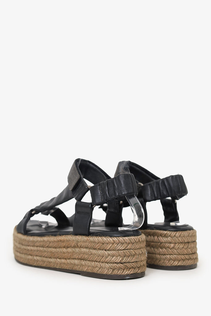 Brunello Cucinelli Black Beaded Leather Espadrille Platform Sandals. Slip-on. Round-open toe. Velcro closure. Silver-tone hardware. Tonal stitching.