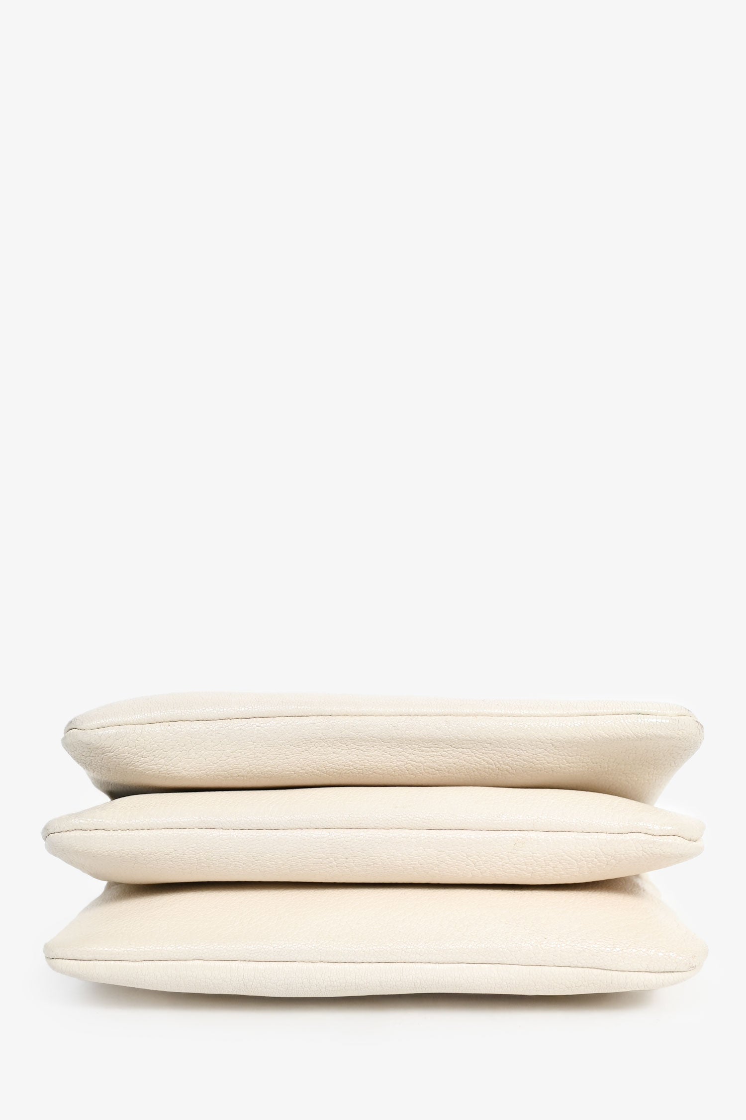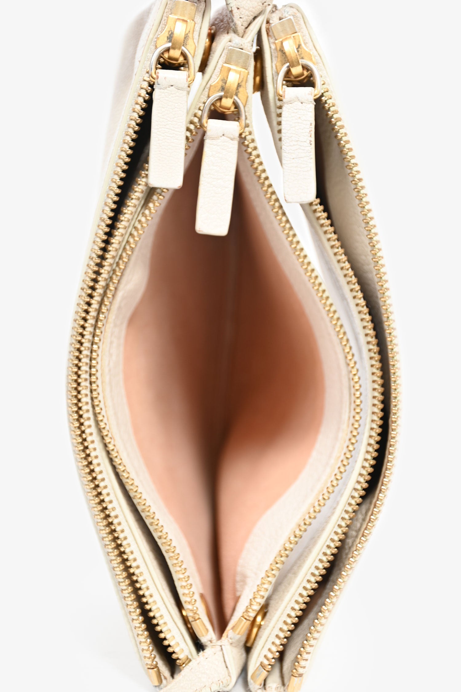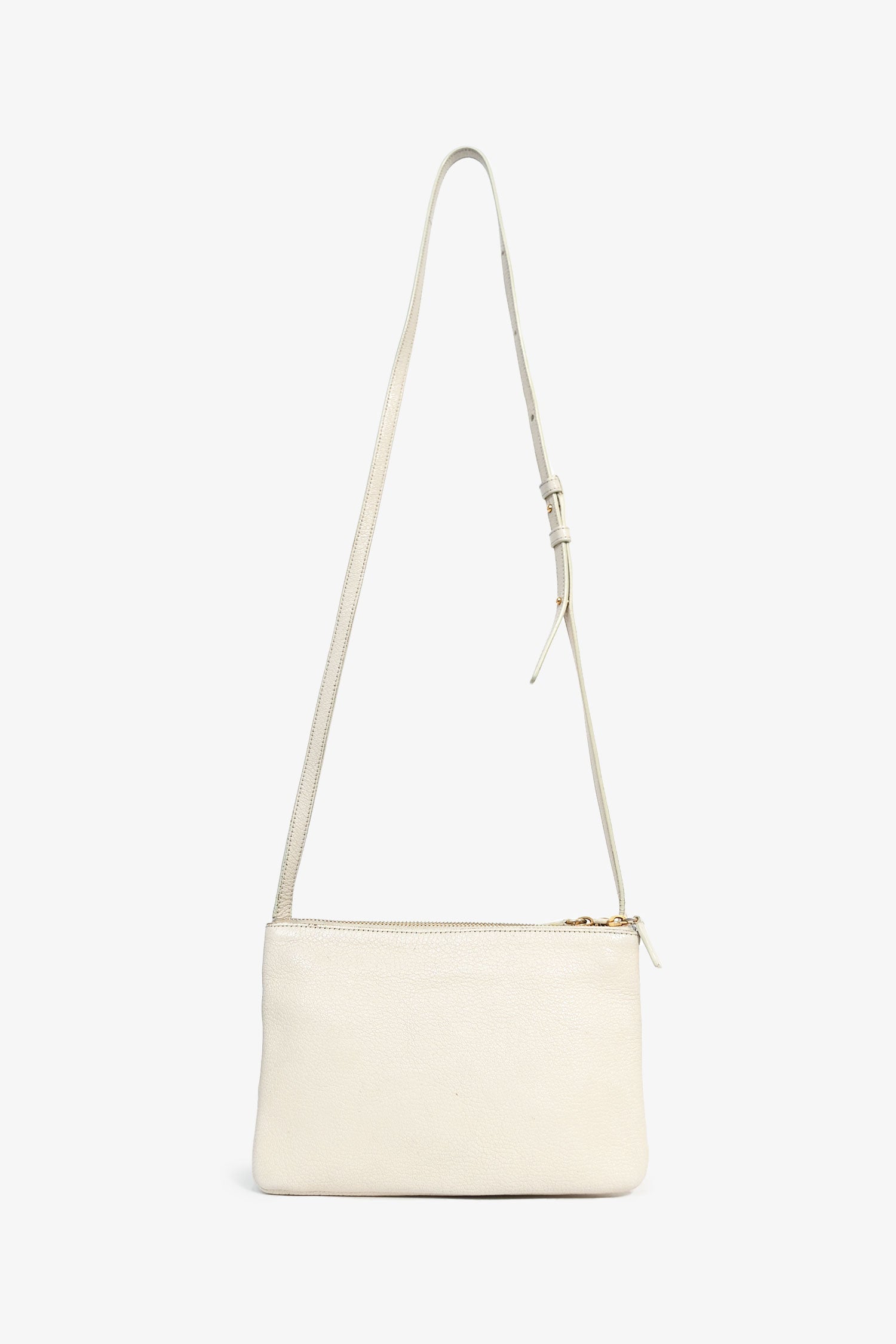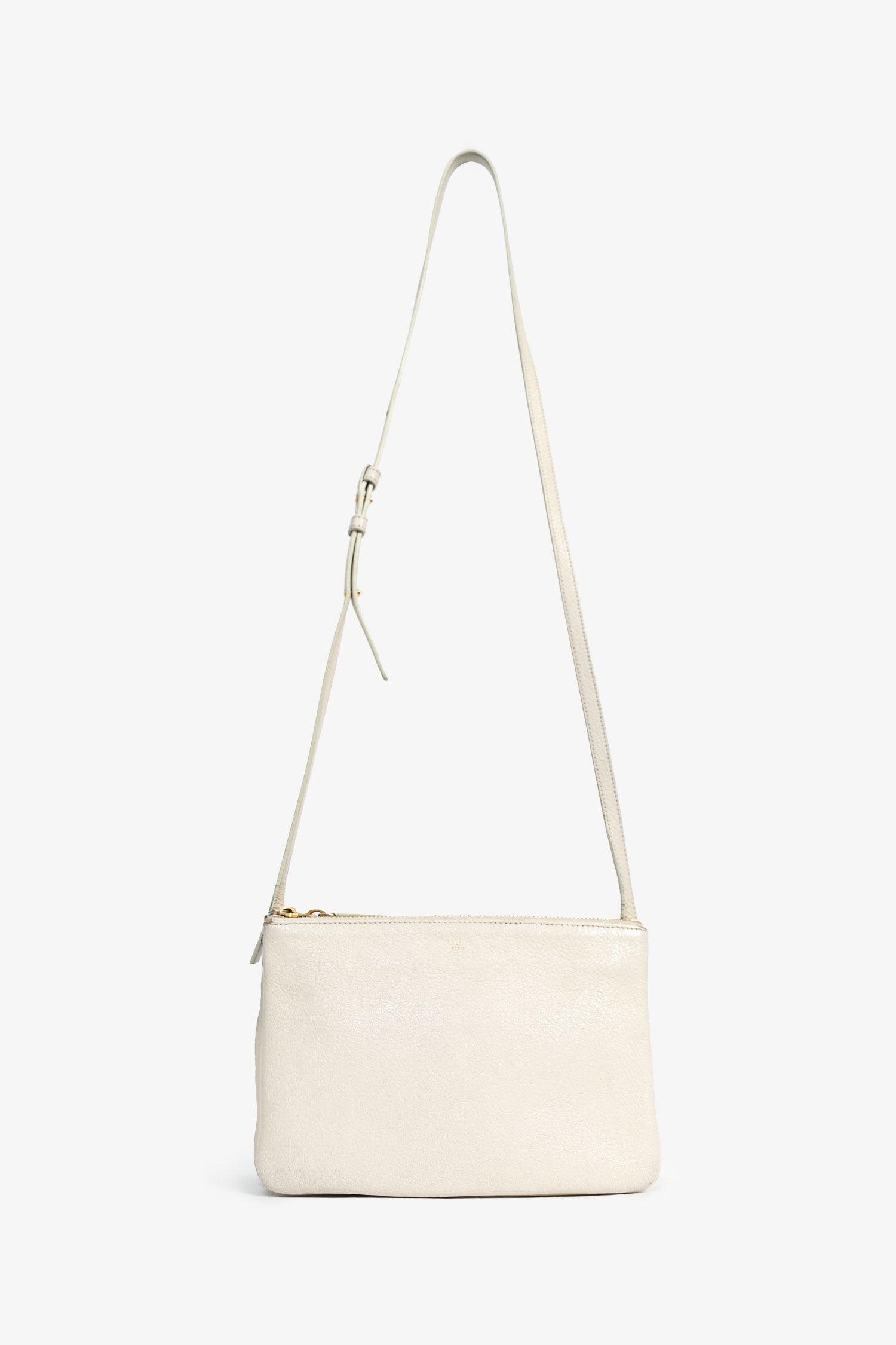 Celine 2015 Cream Grained Leather Small Trio Crossbody Bag. Top zipper closure. Three removable compartments with snap button closure. Adjustable strap. Suede lining. Gold-tone hardware. Tonal stitching.
