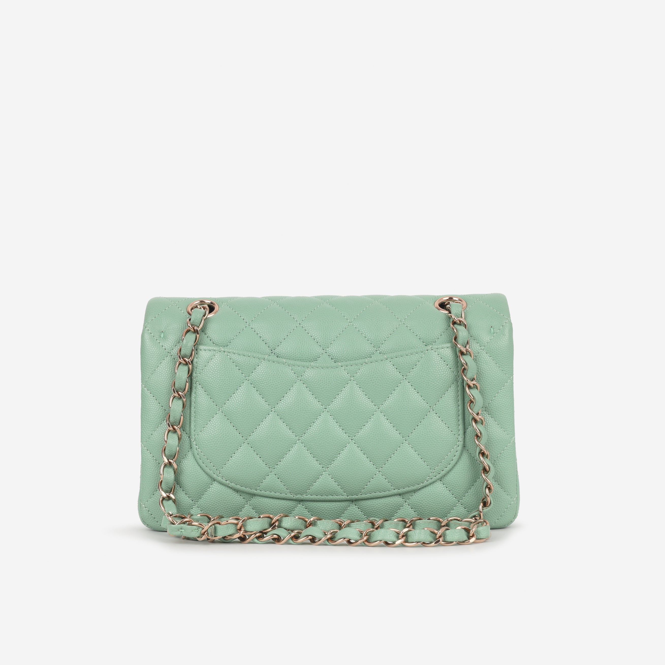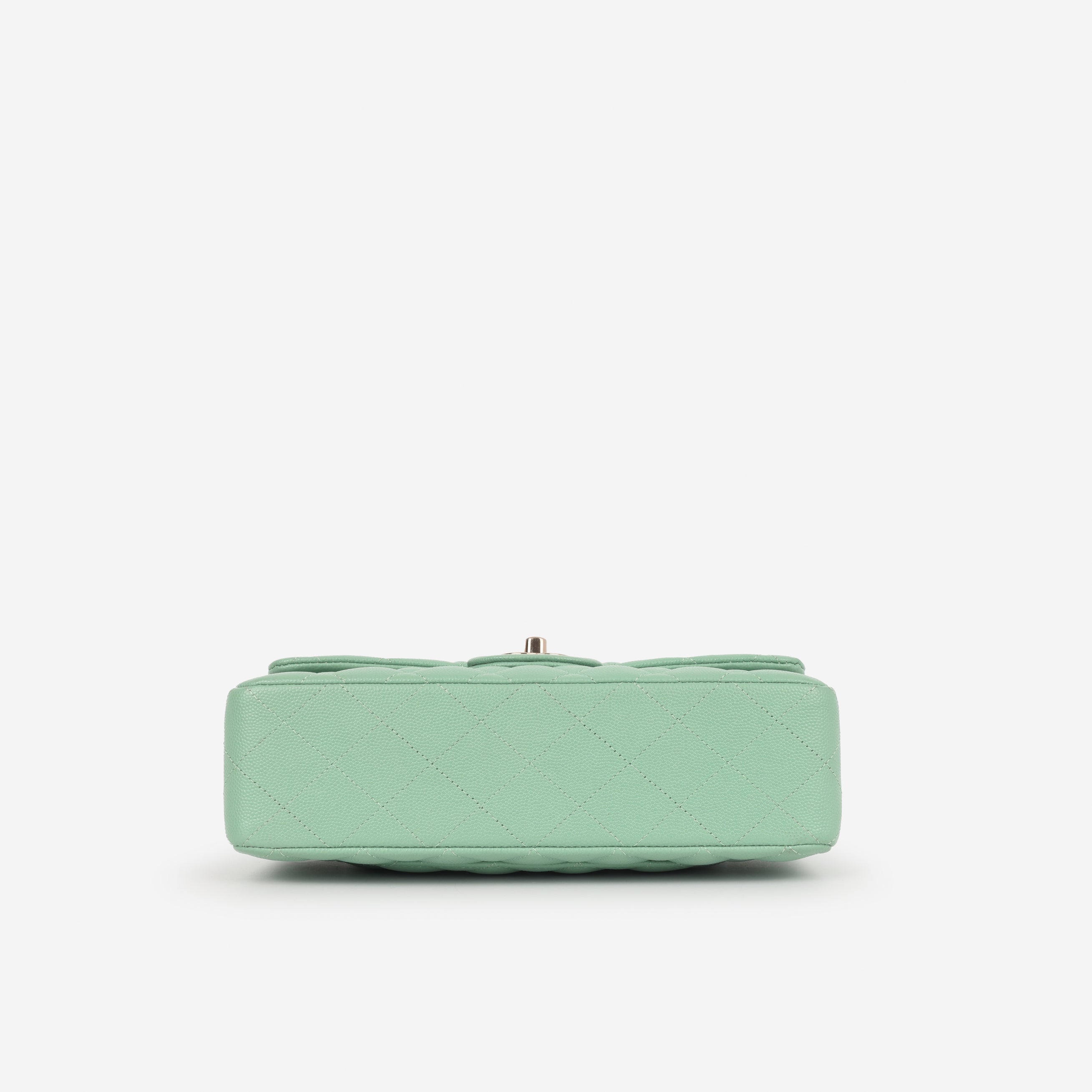 Make a fresh style statement with the Chanel Small Classic Flap in Mint Green Caviar leather, beautifully accented with Champagne Gold hardware. This timeless design features the iconic diamond quilting and CC turn-lock, offering a perfect blend of elegance and modern charm in a unique pastel hue.