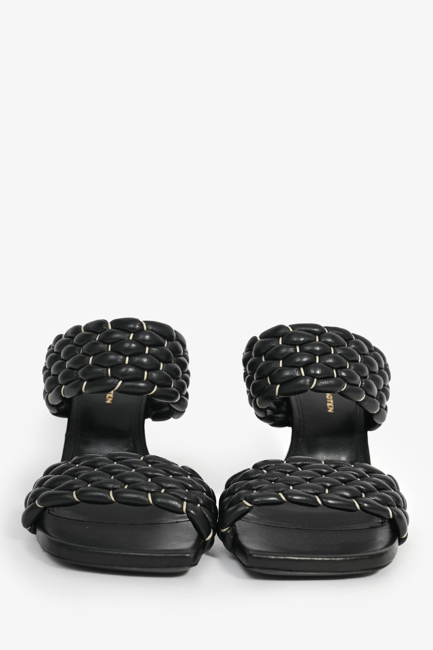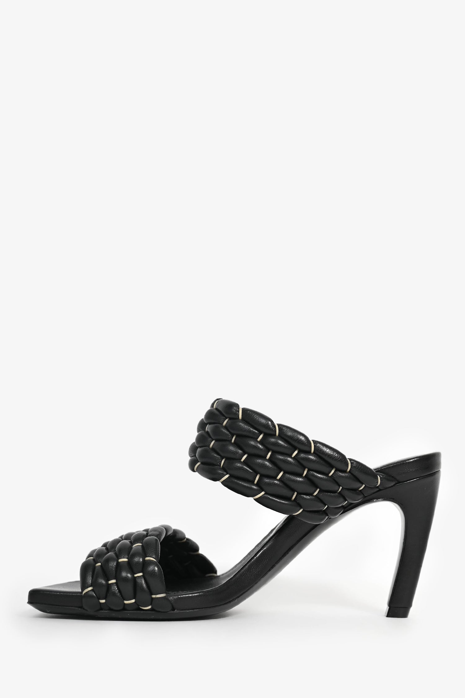 Dries Van Noten Black Woven Leather Heeled Mules. Open toe. Slip-on. Tonal stitching.