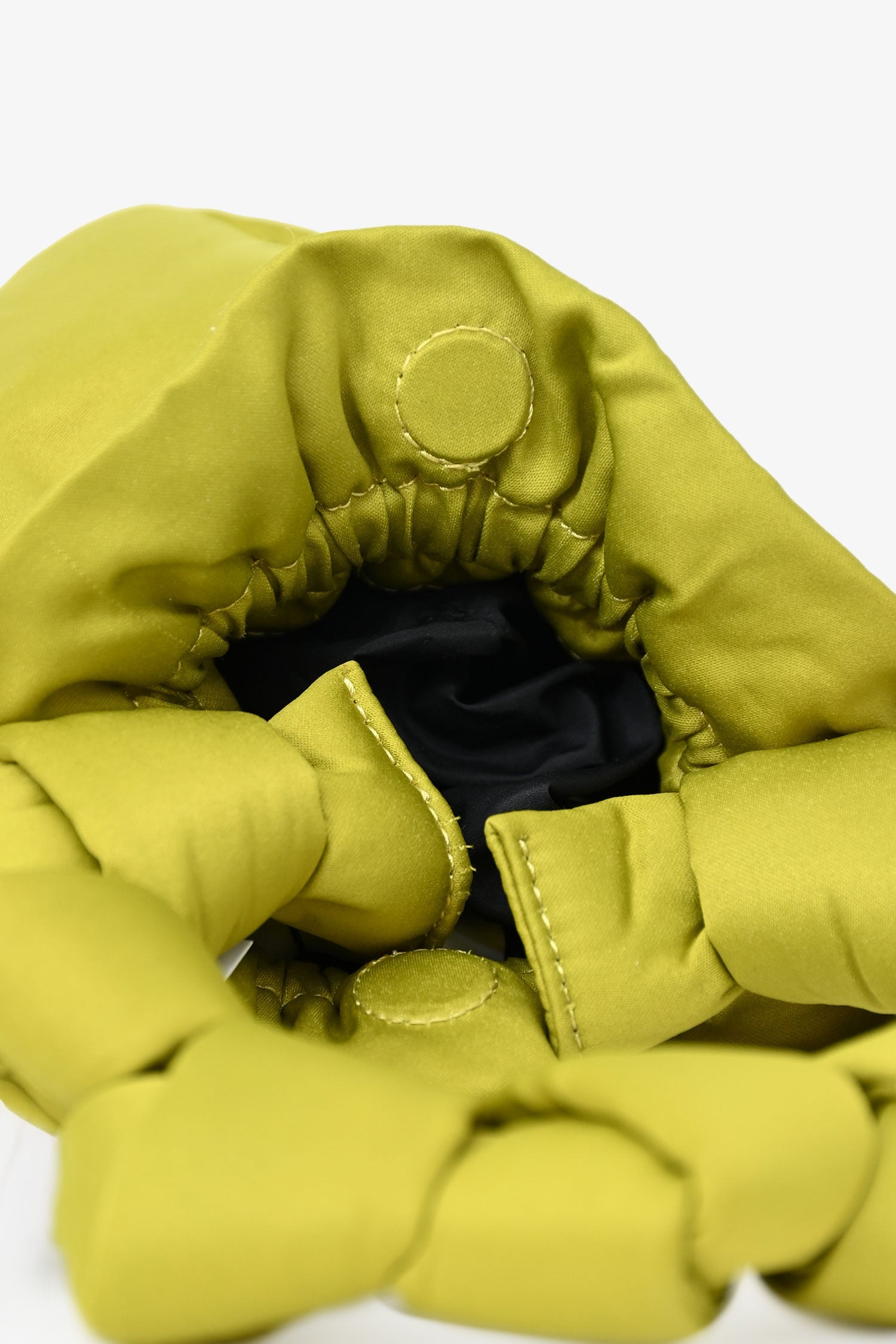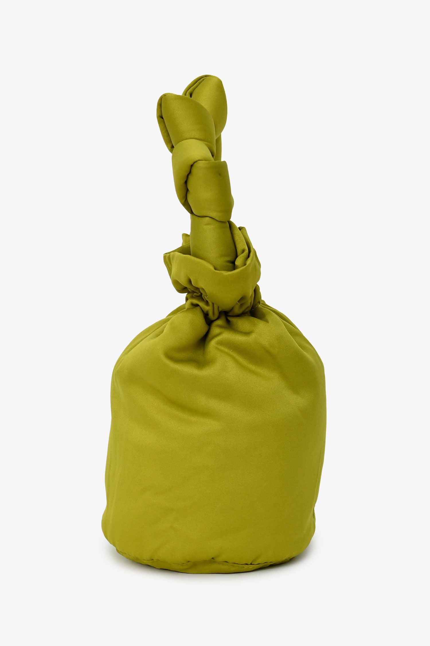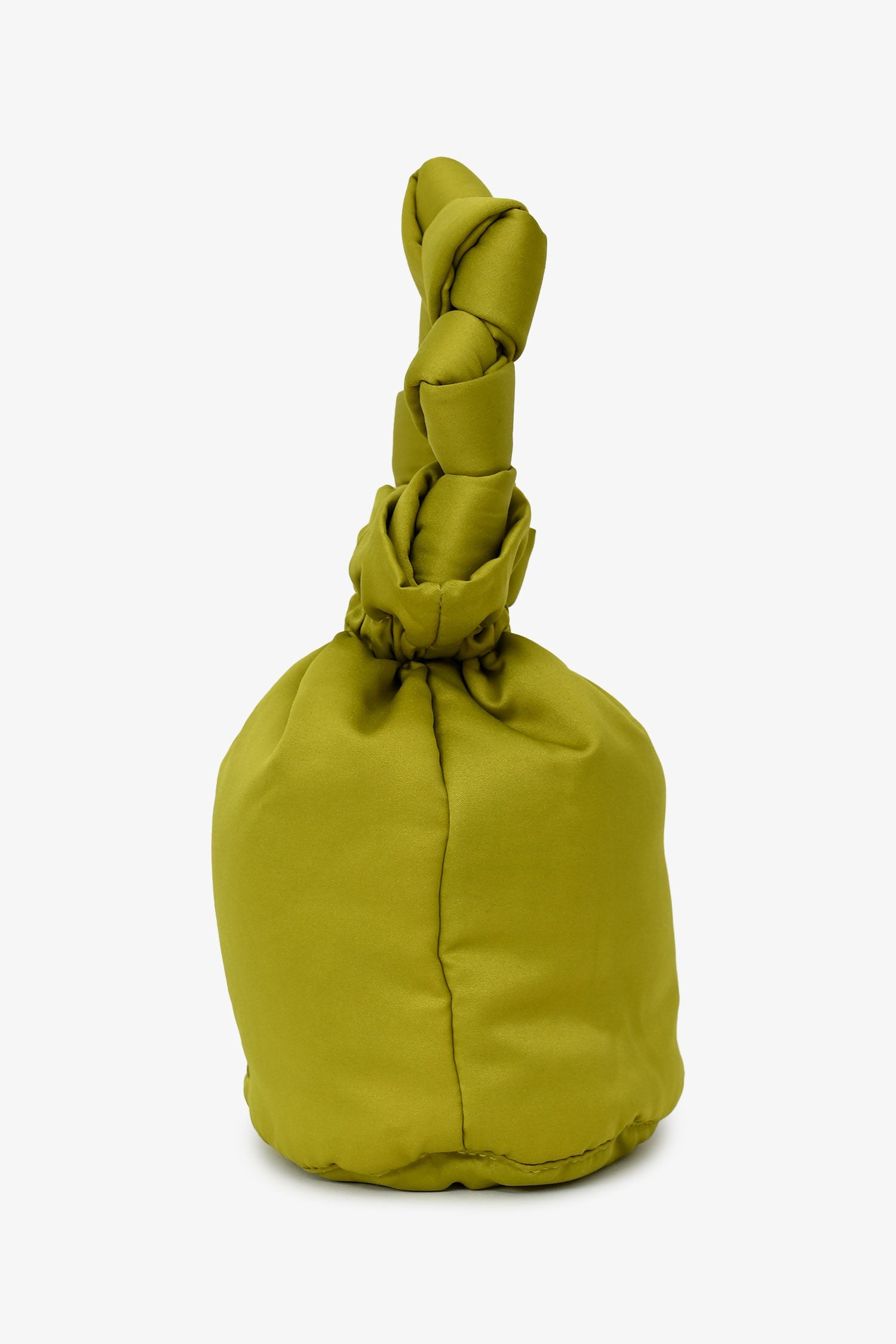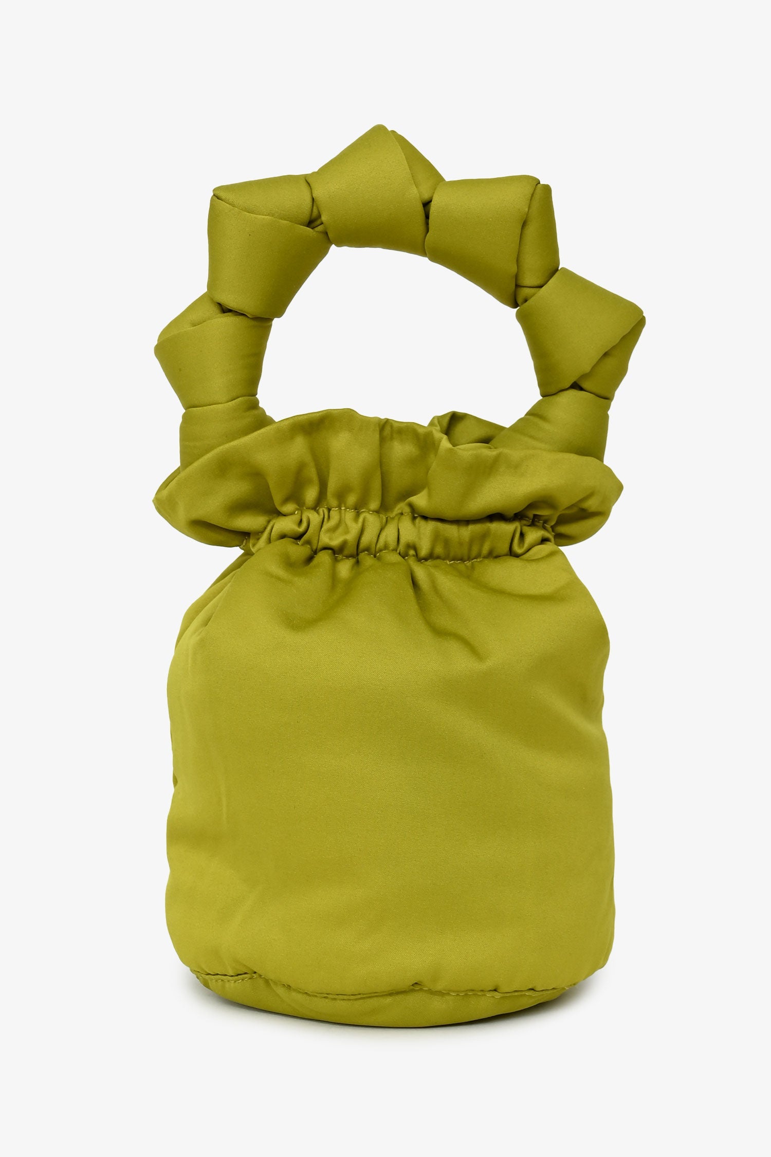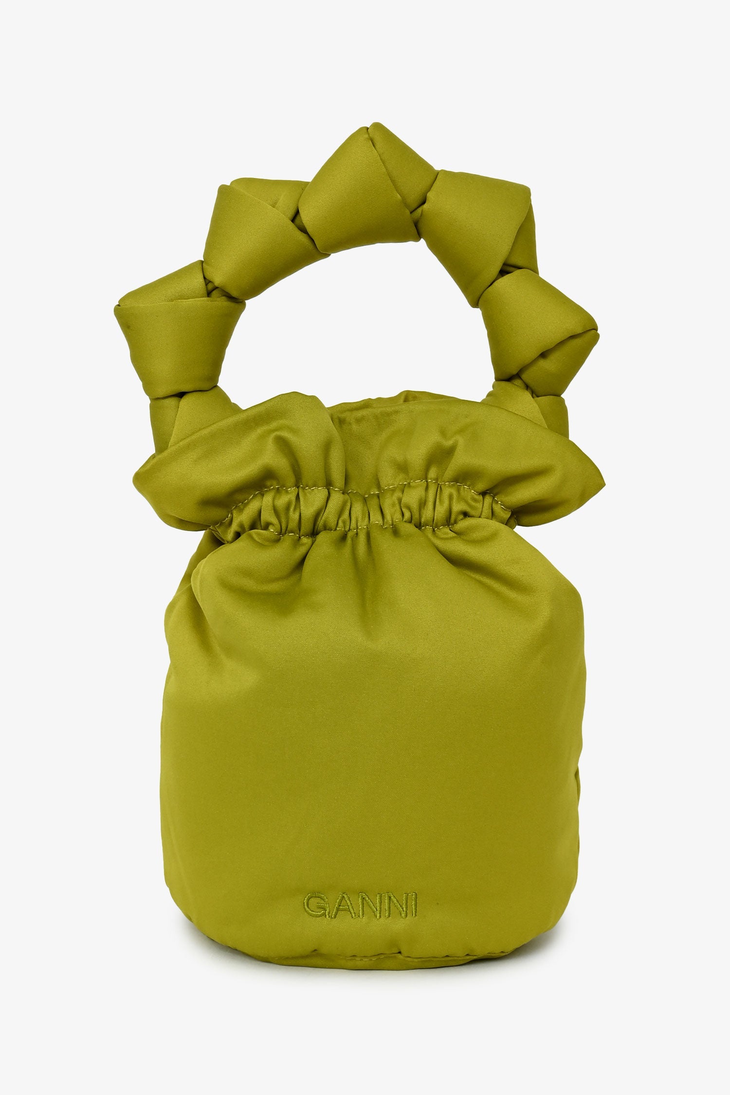 Ganni Green Satin Top Handle Bag. Magnetic snap closure. Single top handle. Tonal stitching.