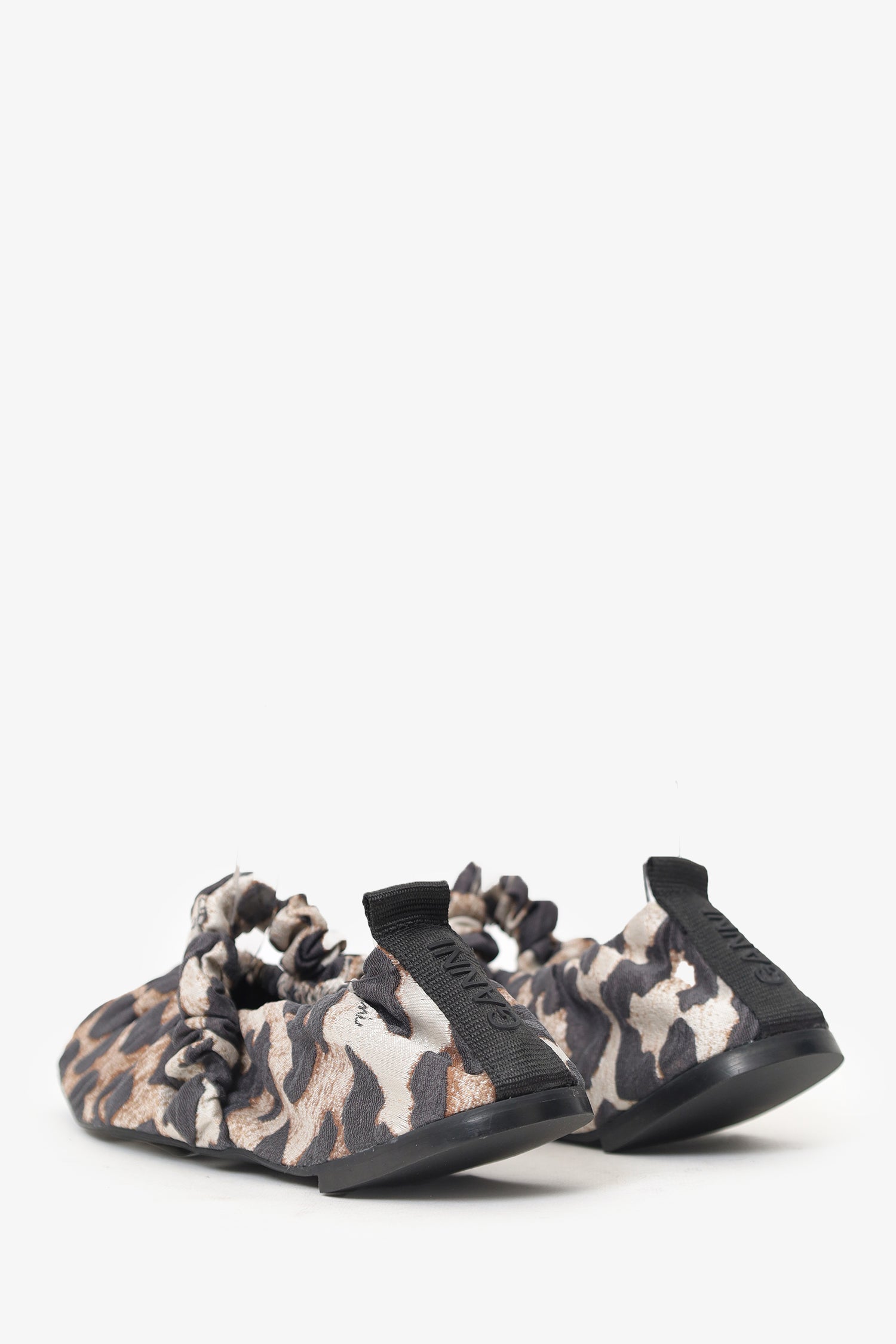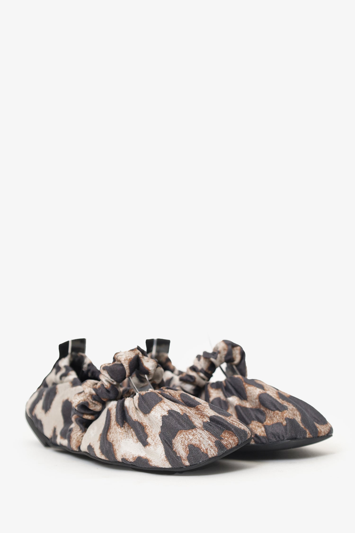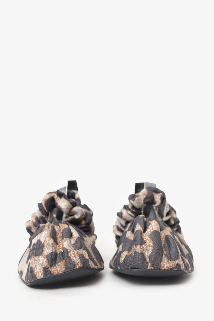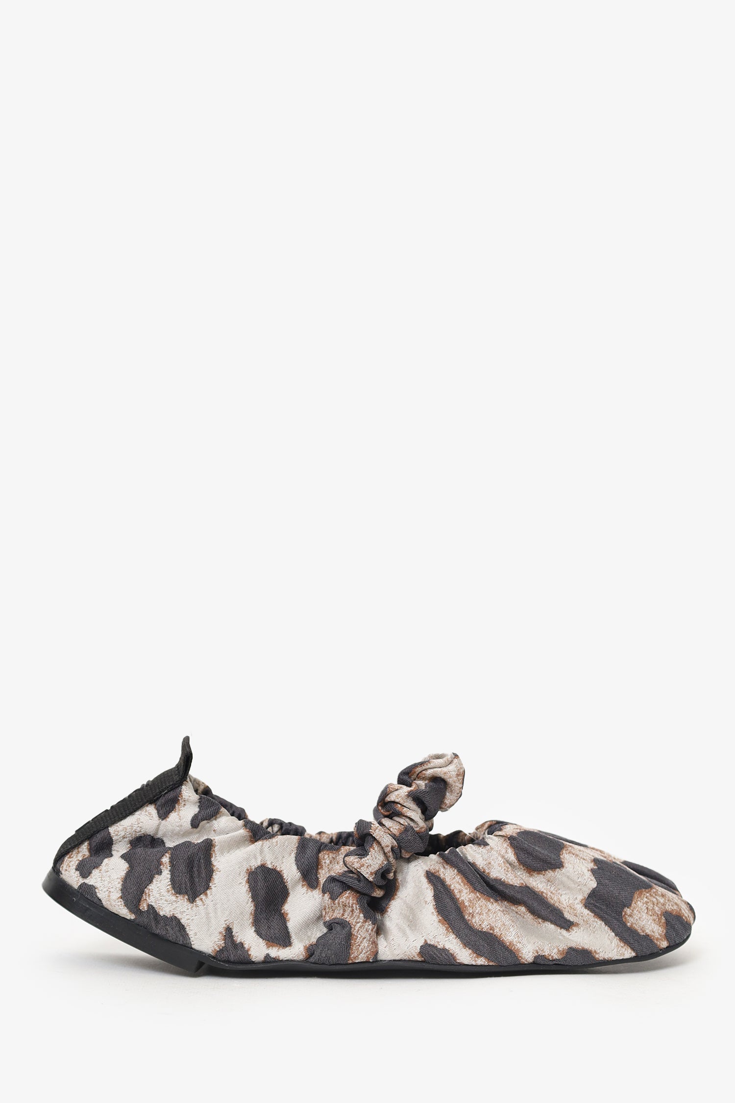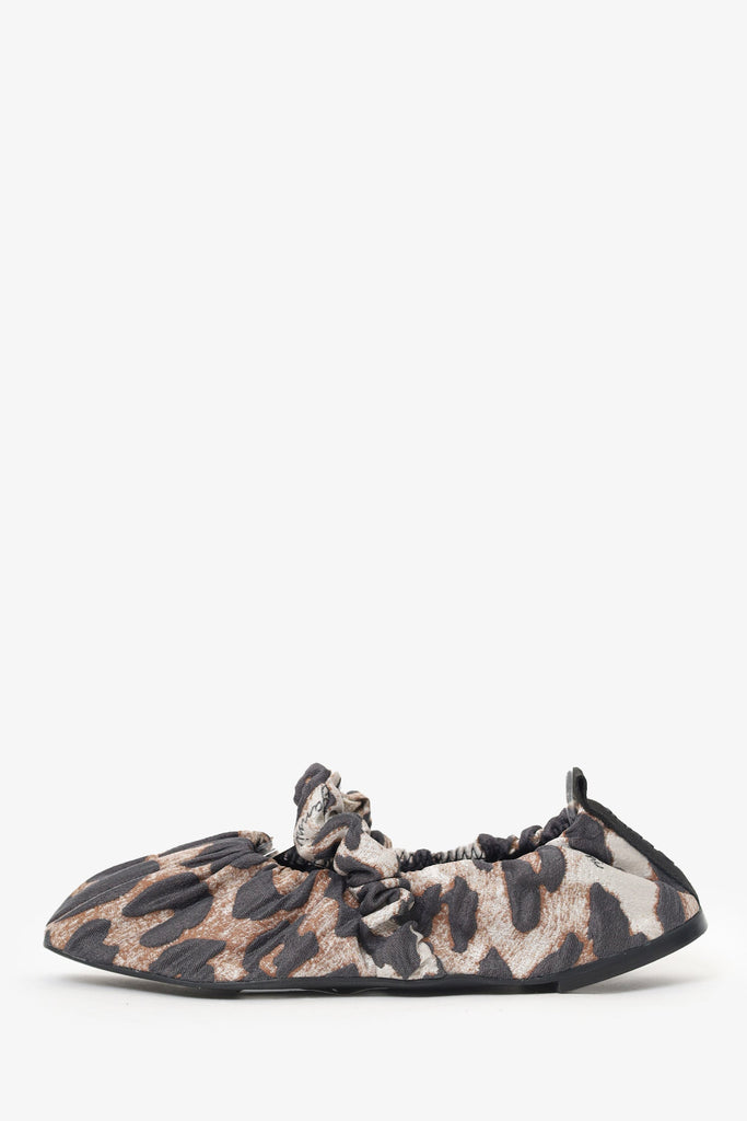 Ganni Leopard Ballet Flats. Slip-on. Squared-toe. Elasticized opening and strap. Tonal stitching.