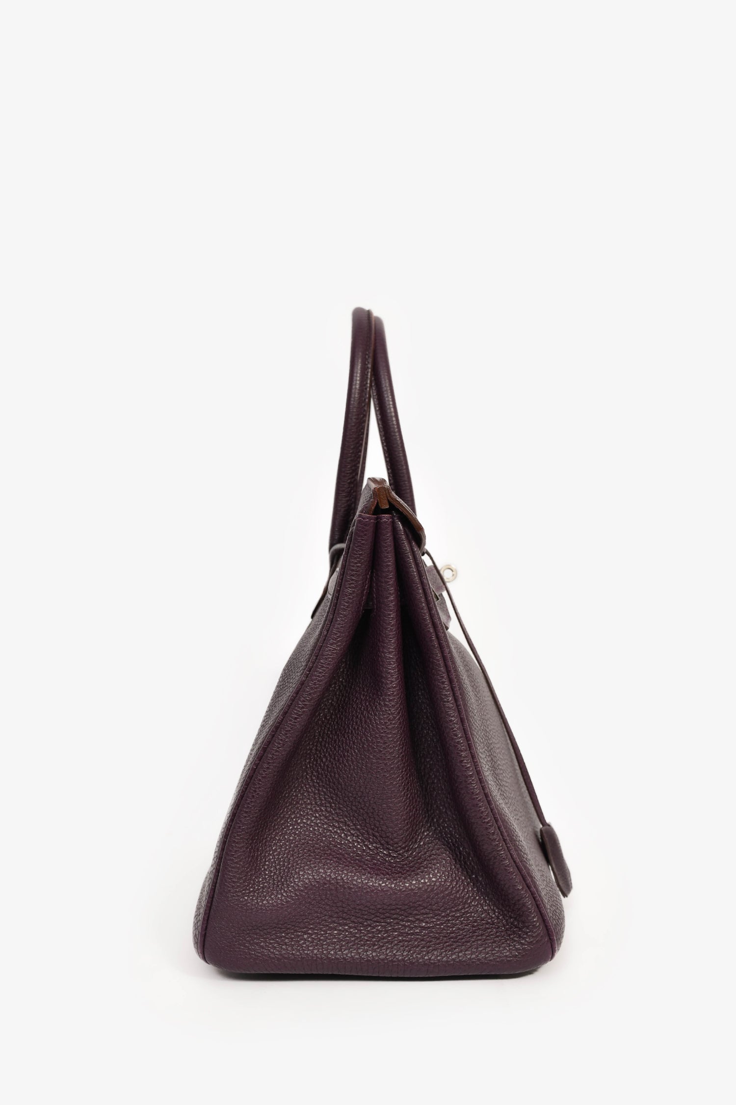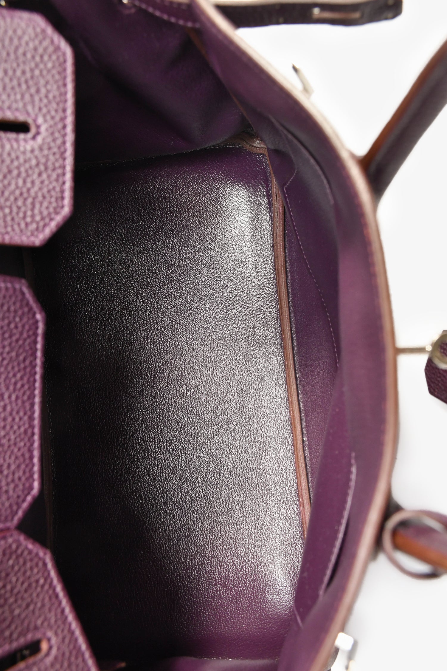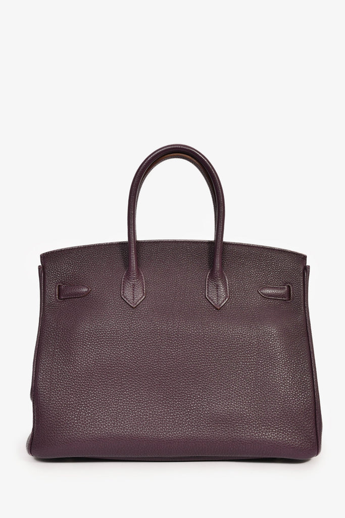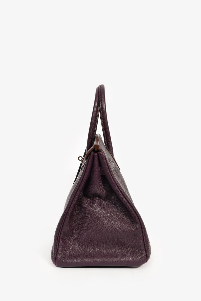 SHermes 2008 Raisin Clemence Leather Birkin 35. Dual rolled top handles. Fold-over flap. Attached clochette. Dual straps with a turn-lock closure. 1 zip compartment and 1 slip compartment. Palladium hardware. Tonal stitching.