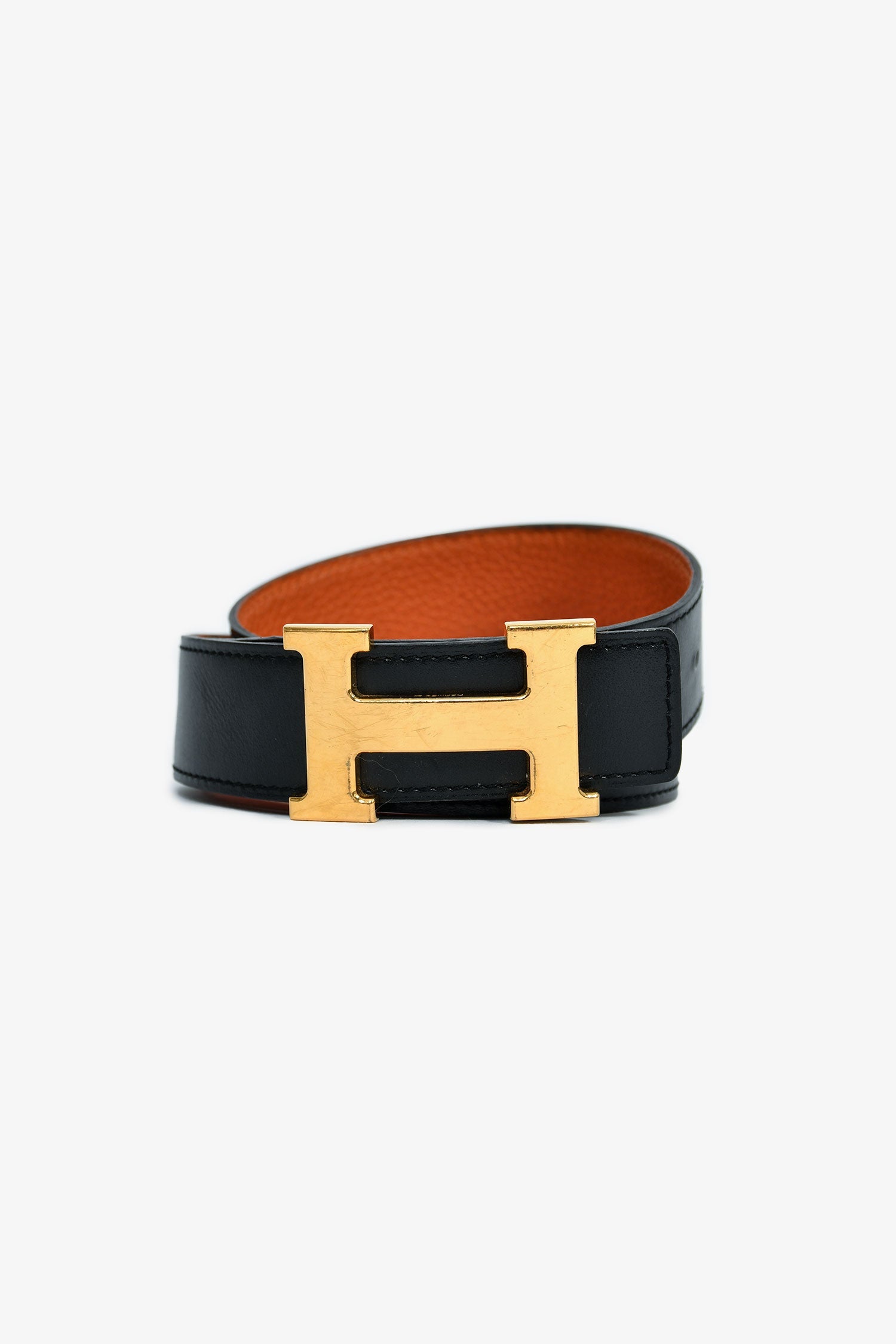 Hermes 2011 Black/Orange Reversible 'H' Belt 95. Gold-tone hardware. Reversible. Coated trim. Tonal stitching.