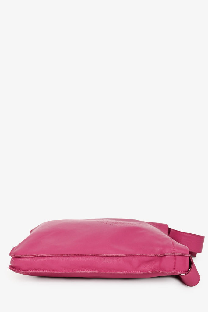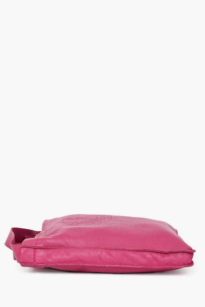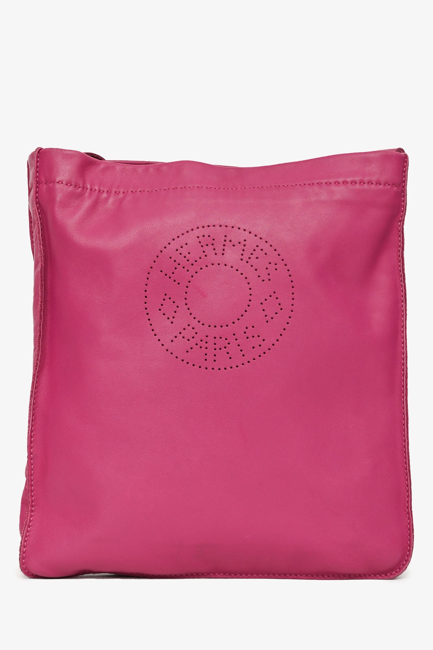 Hermès 2012 Pink Leather 'Milo Clou de Selle' Crossbody Bag. Perforated holes. Concealed snap closure. Flat crossbody strap. Tonal stitching.