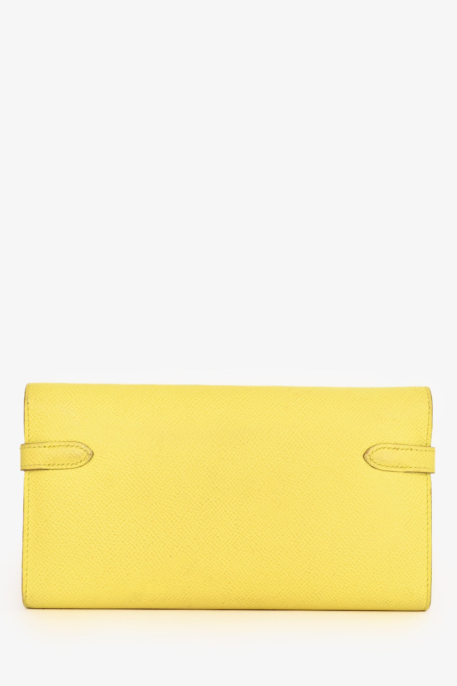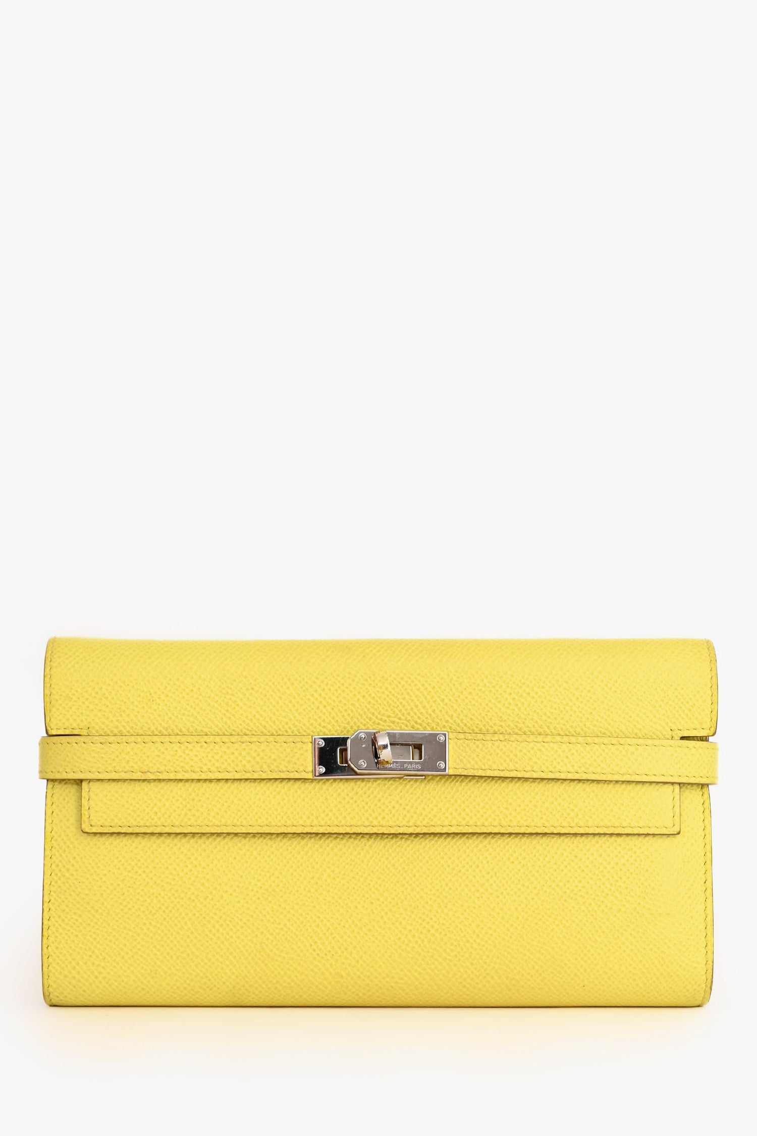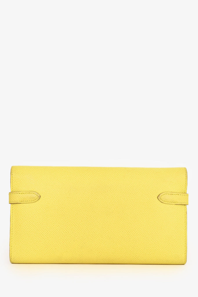 Hermès 2013 Yellow Epsom Kelly Wallet. Front fold-over flap with two straps and turn-lock closure. Six interior wall cards lots. Two billfold compartments. One zippered coin compartment. Silver-tone hardware. Tonal stitching.