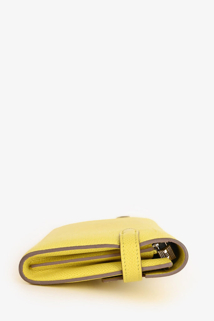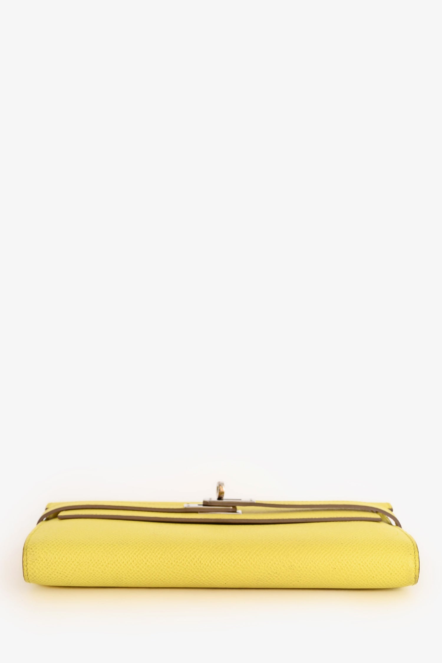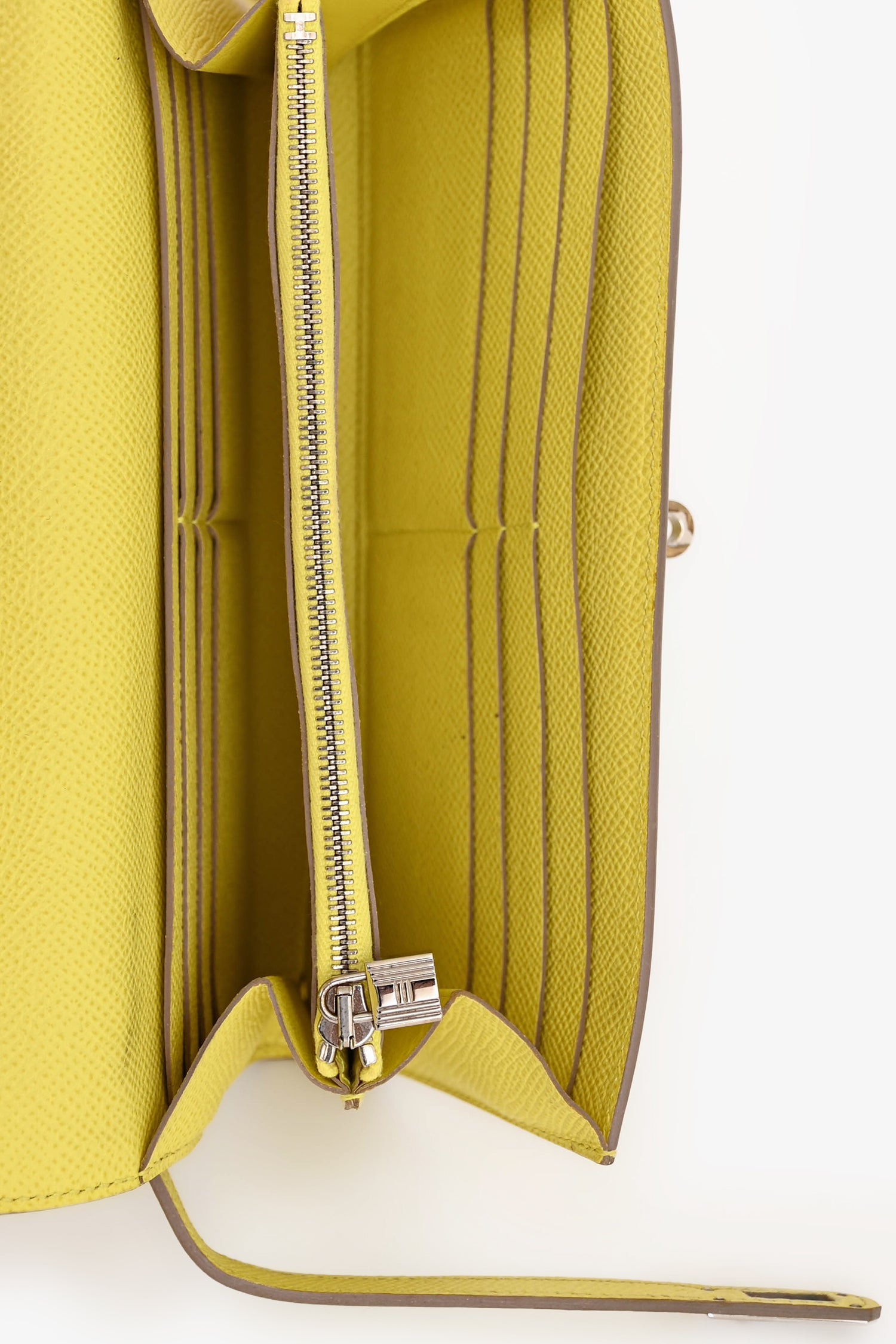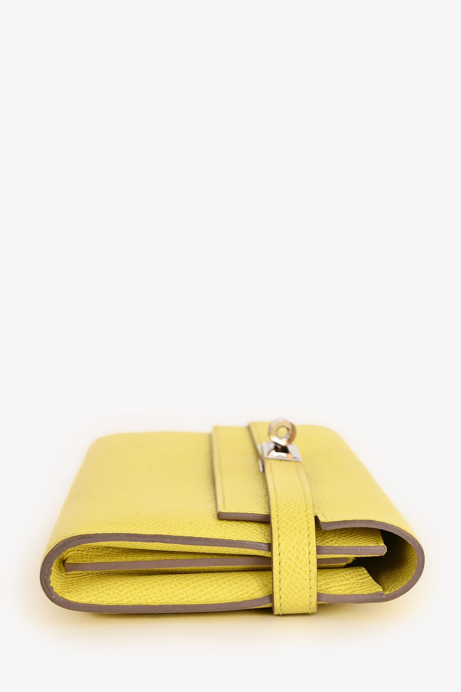 Hermès 2013 Yellow Epsom Kelly Wallet. Front fold-over flap with two straps and turn-lock closure. Six interior wall cards lots. Two billfold compartments. One zippered coin compartment. Silver-tone hardware. Tonal stitching.