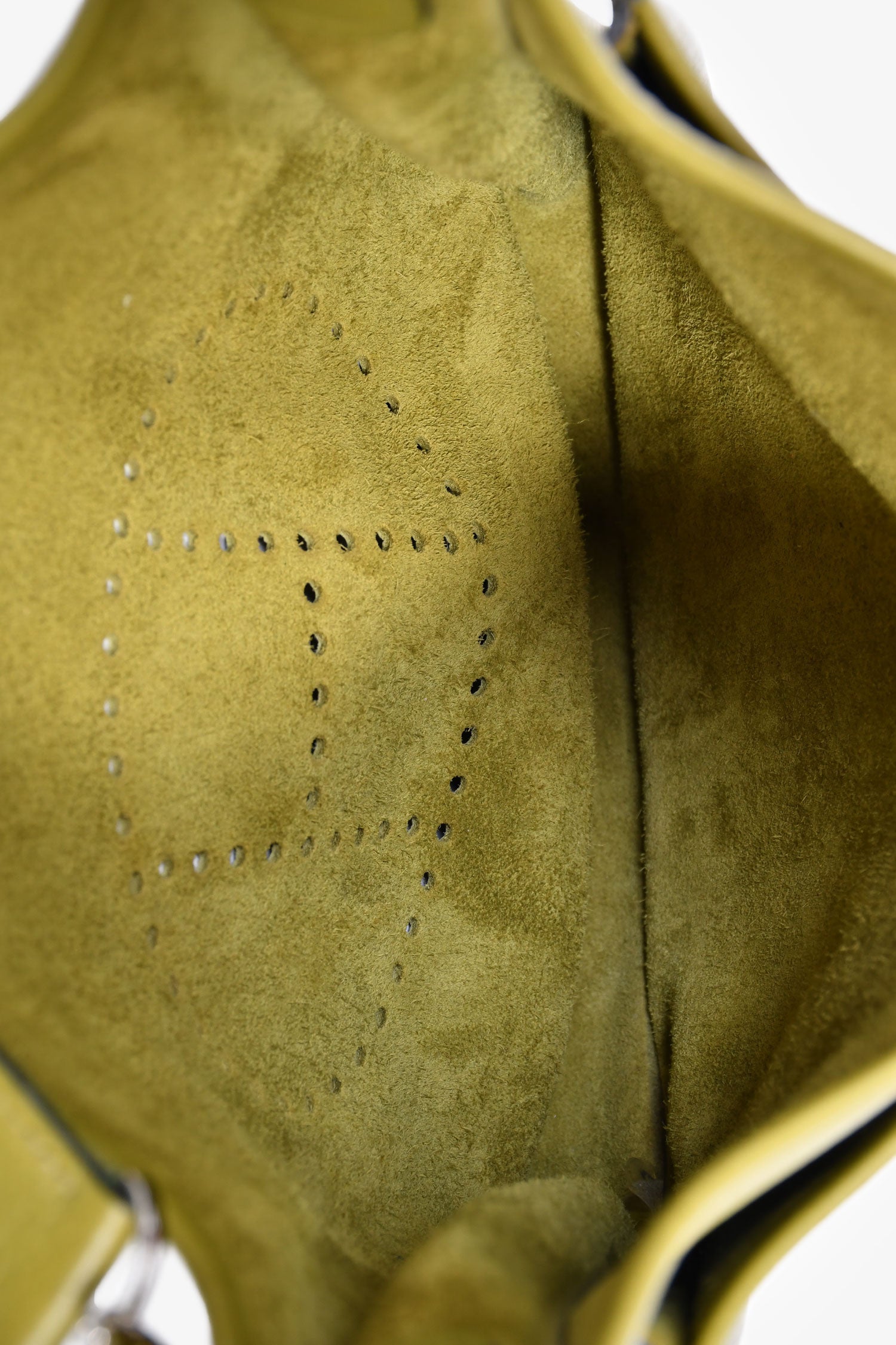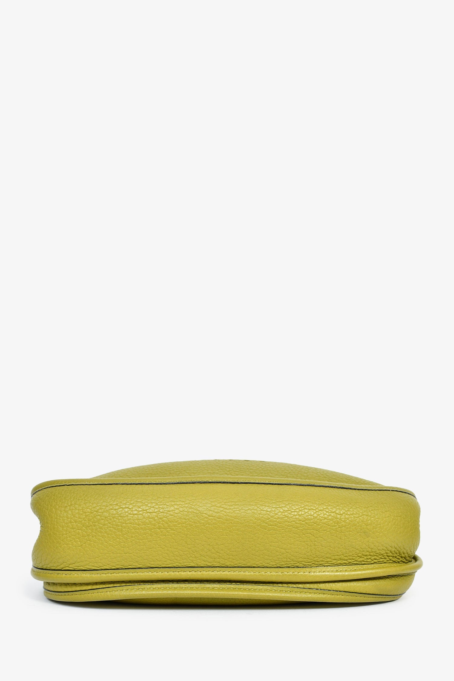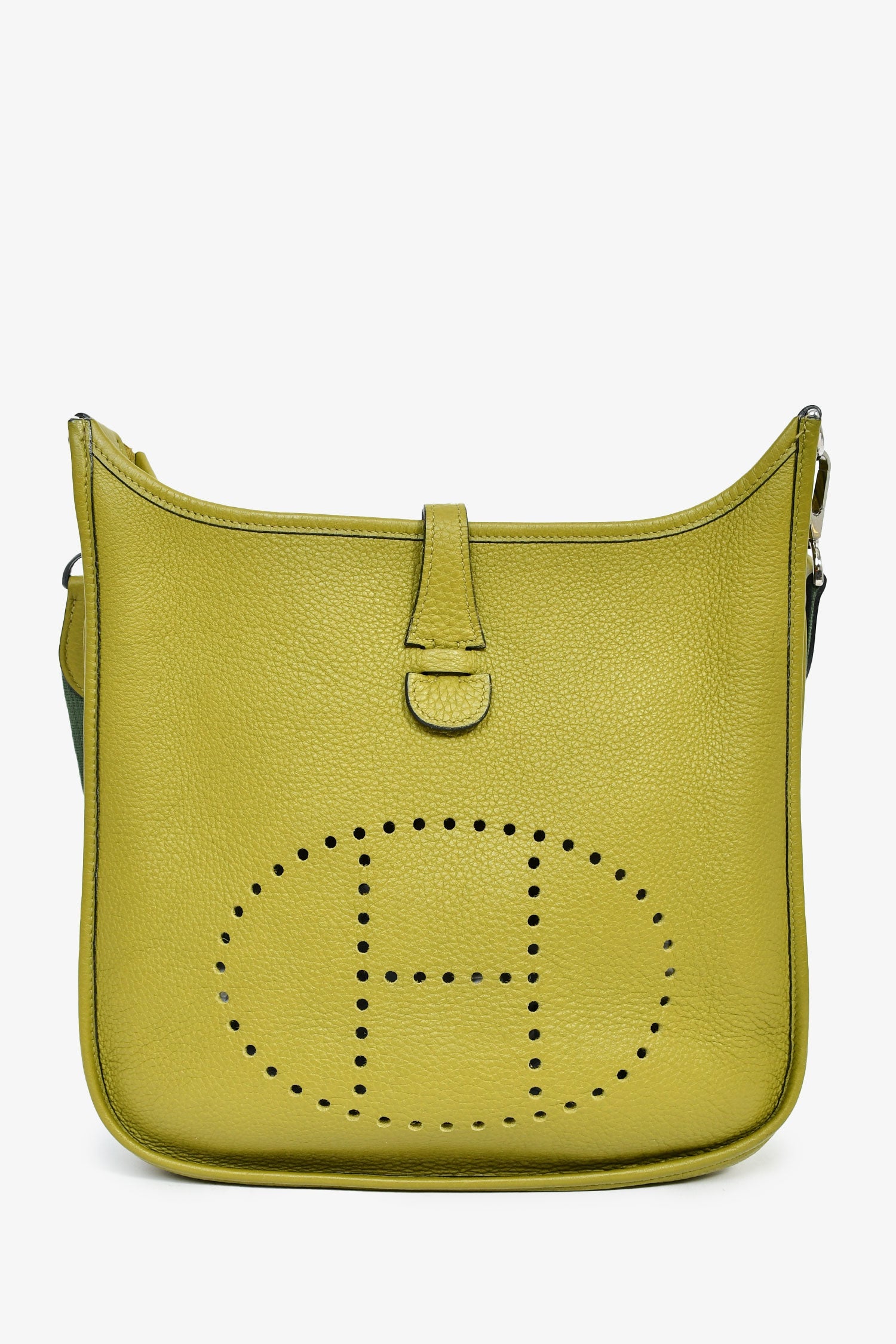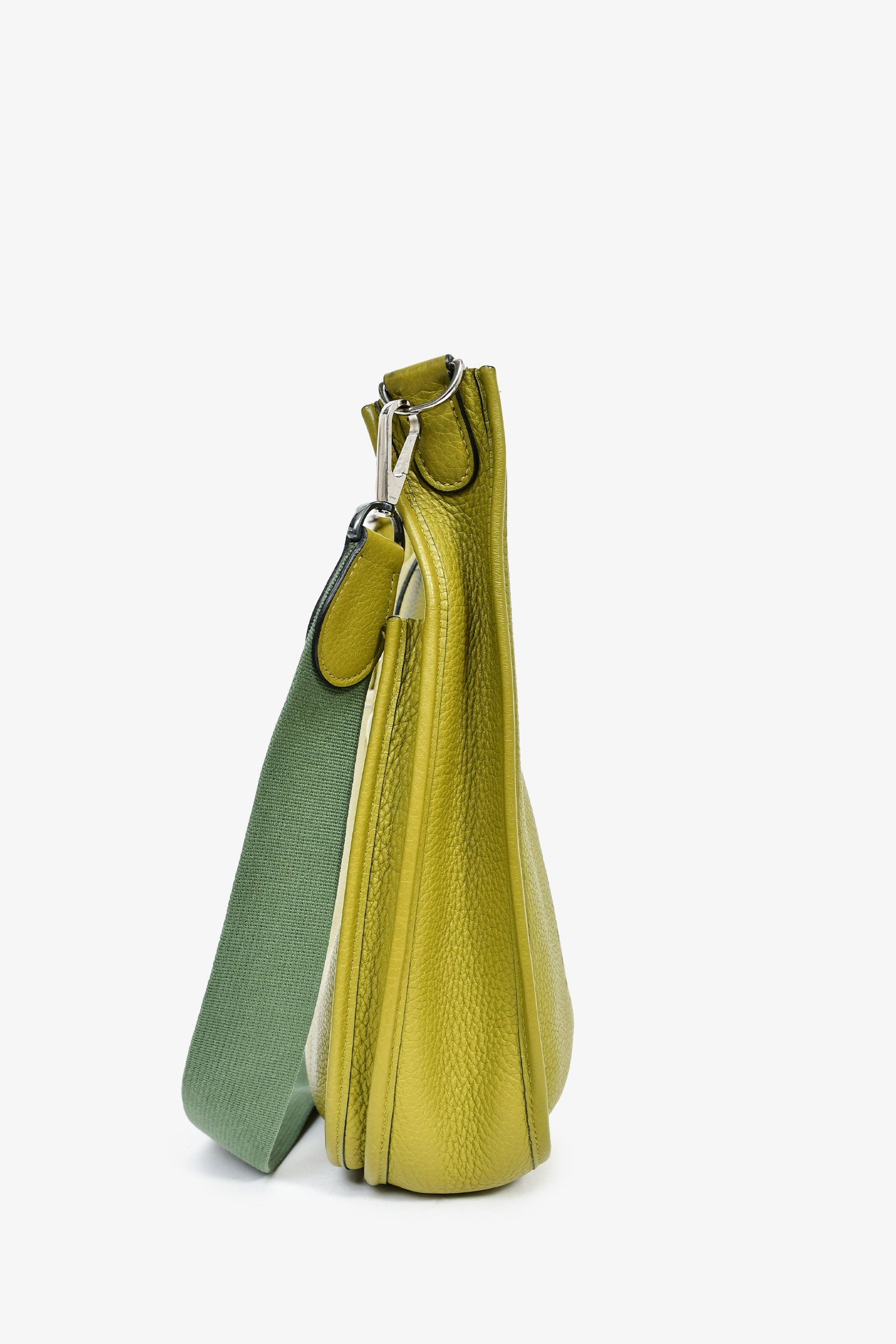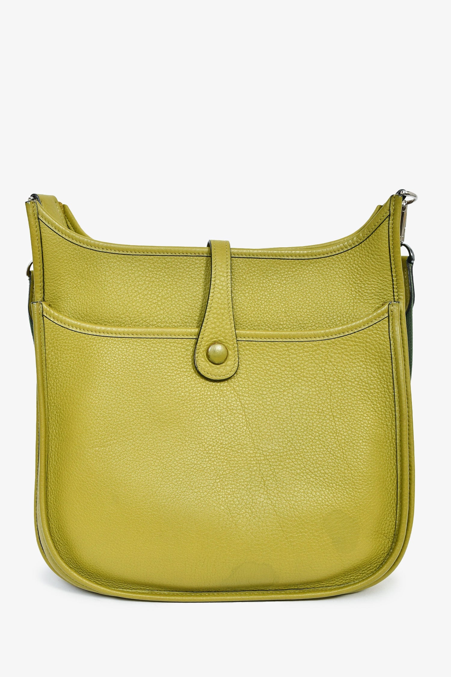 Hermès 2014 Green Clemence Leather Evelyne. Top fold-over strap with snap-button closure. Detachable shoulder strap. Single exterior slip compartment. Suede-lined interior. Open interior. Palladium-tone hardware. Tonal stitching.