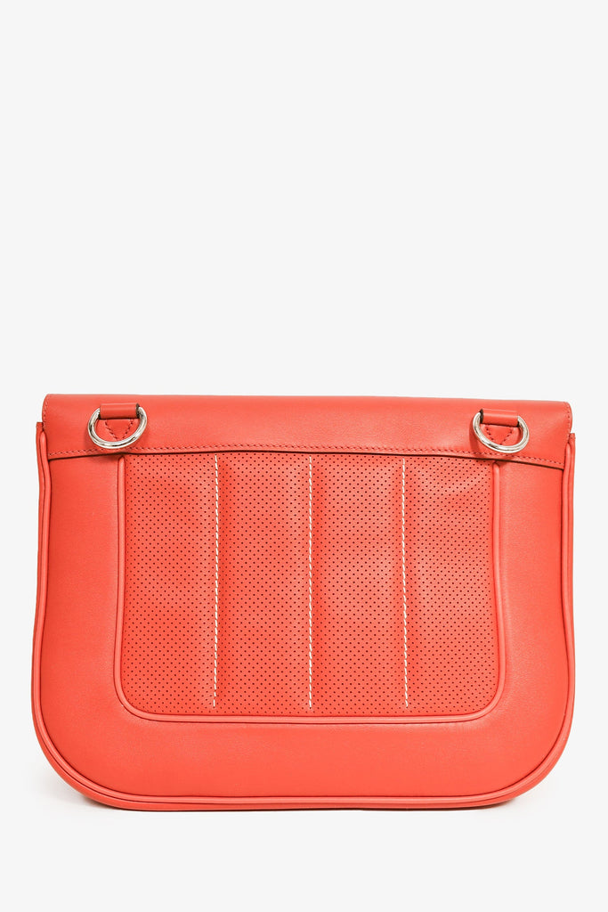 Hermes 2014 Red Perforated Swift Leather 'Berline' 28 Crossbody. Front fold-over flap with pull-through straps and turn-lock closure. Single interior compartment with a wall slip and zip pocket. Detachable strap. Palladium tone-hardware. Tonal stitching.
