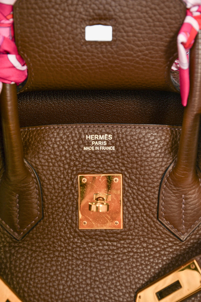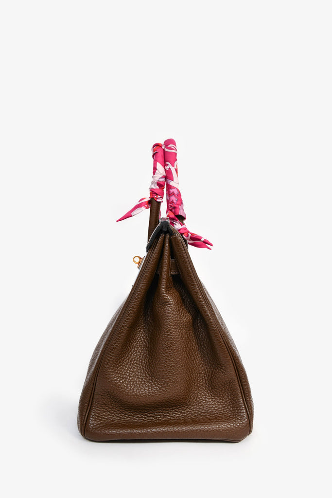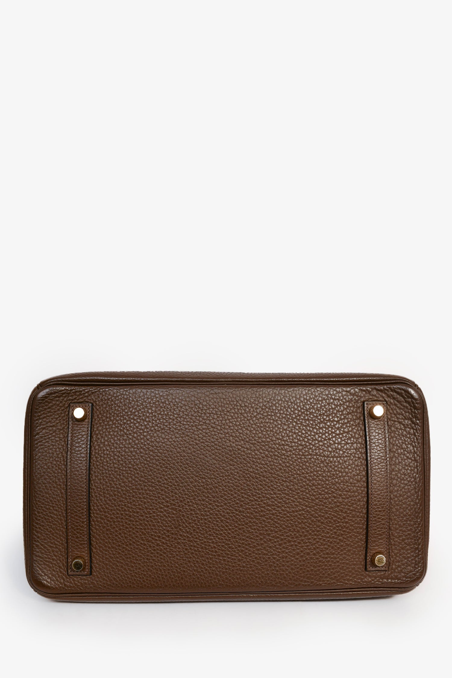 Hermès 2014 Special Order Brown Clemence Leather Birkin 35. Fold-over flap. Gold-tone hardware. Pull-through straps with a turn-lock closure. Rolled handles. Zipped interior. Single slip compartment. Clochette, lock, and keys. Coated trimming. Tonal stitching.